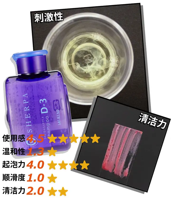 即便含有硅油成分,这款洗发水的顺滑度仍只拿到了可怜的1分,在本次评测中垫底……而且在蛋白质变性实验中,它的刺激性略强。可能会增加毛发之间的摩擦,从而加深损伤程度。因此,介意硅油和刺激性的话,这款建议pass了。