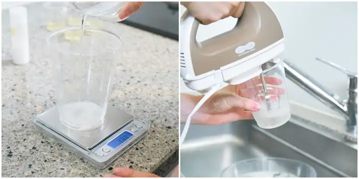我们将稀释后的洗发水倒入大塑料杯中,再使用搅拌机进行打泡。为了能更加直观地对比每一款洗发水的起泡程度,拍照时我们会一并拍入刻度尺,并以满分5分标准进行打分。打出的泡沫越高,评分也就越高。