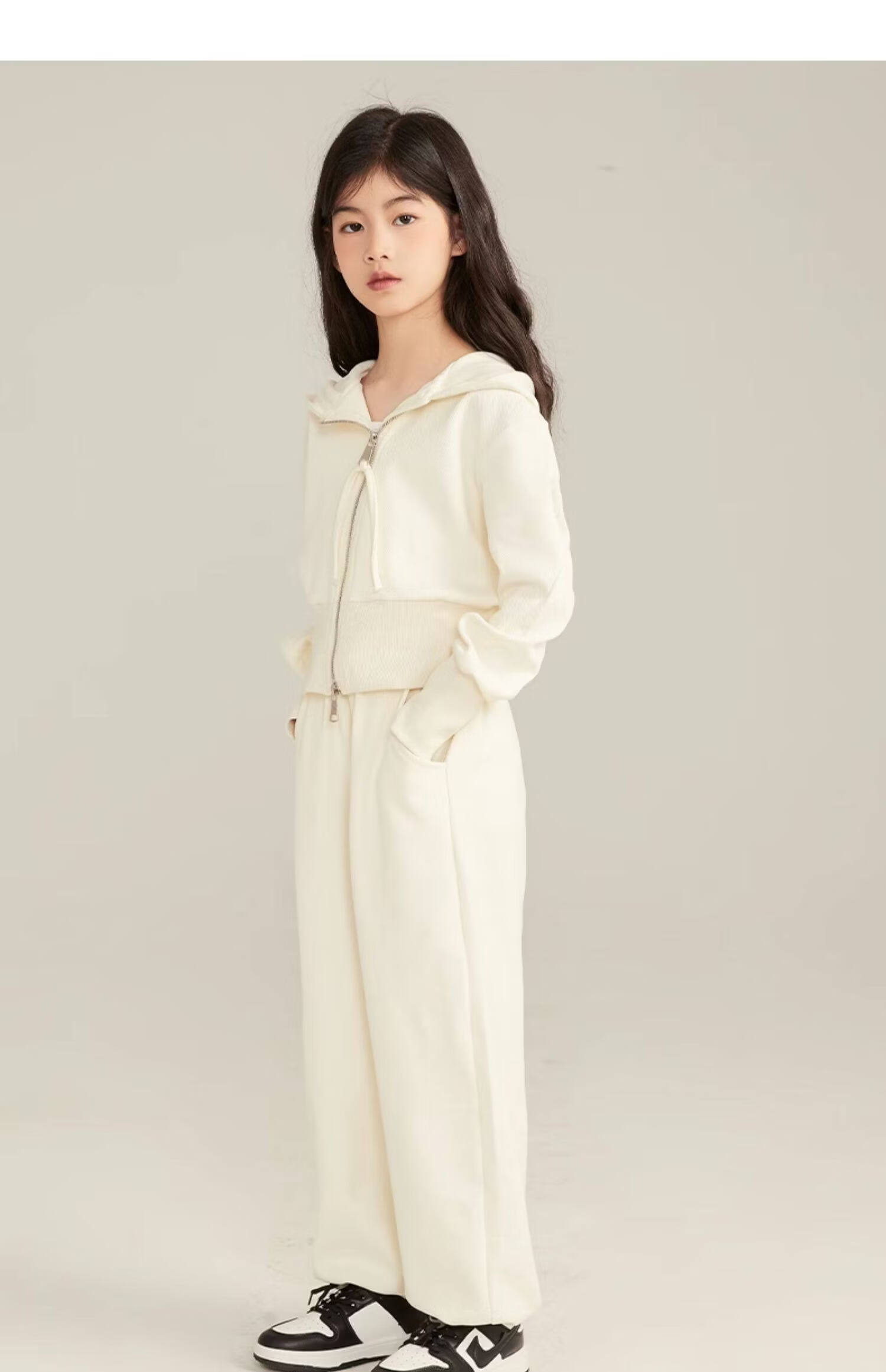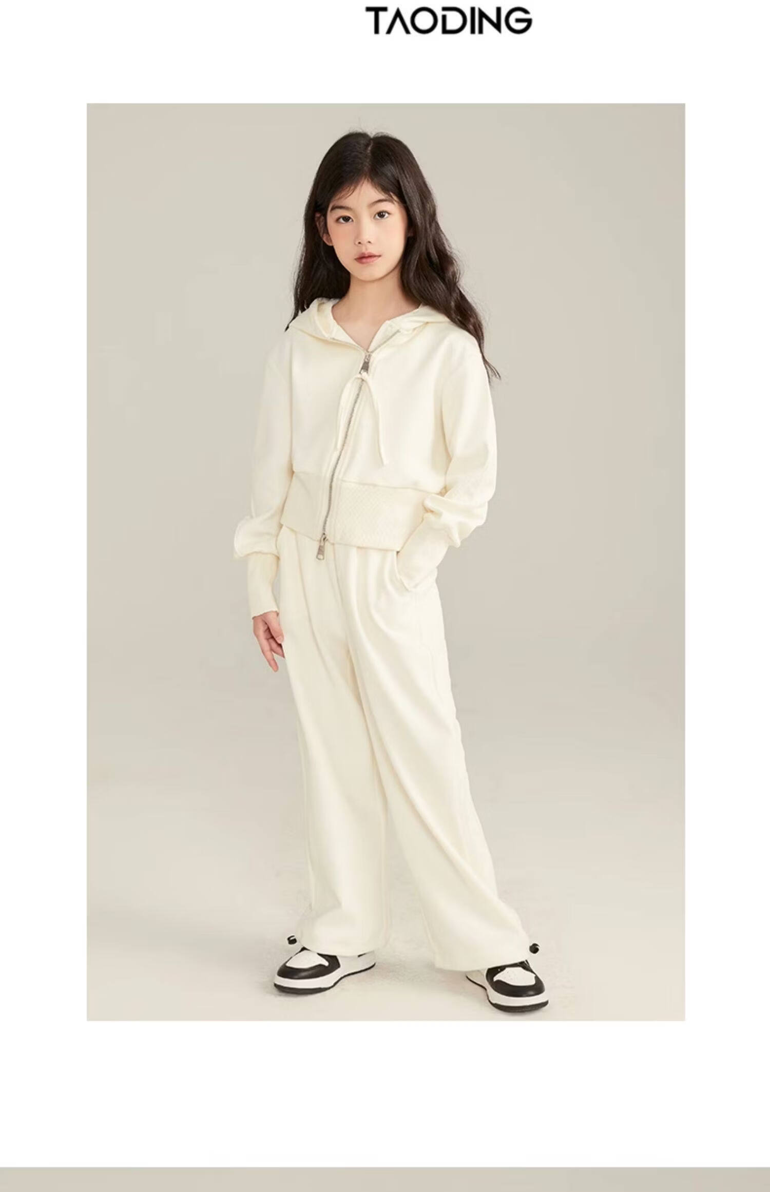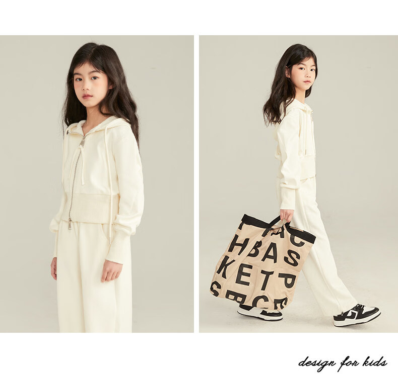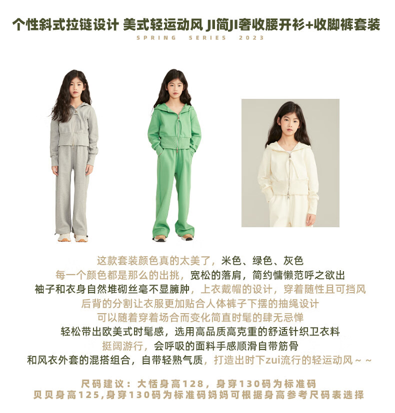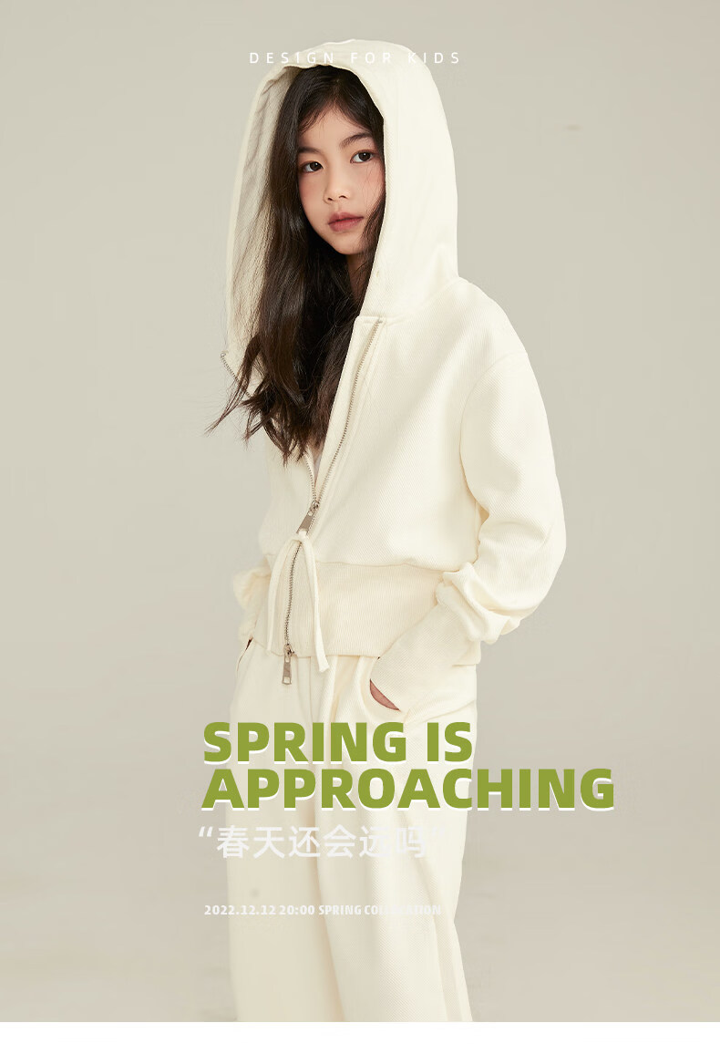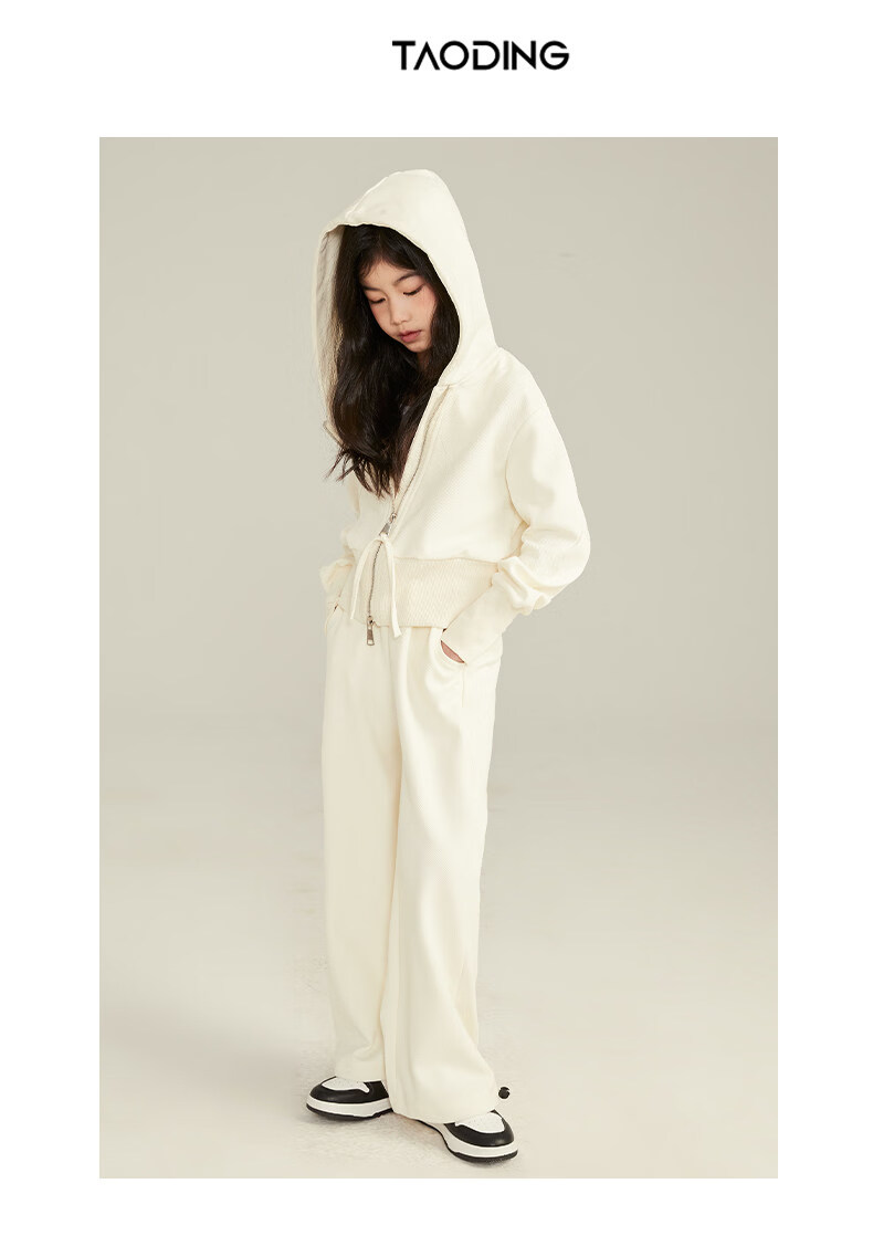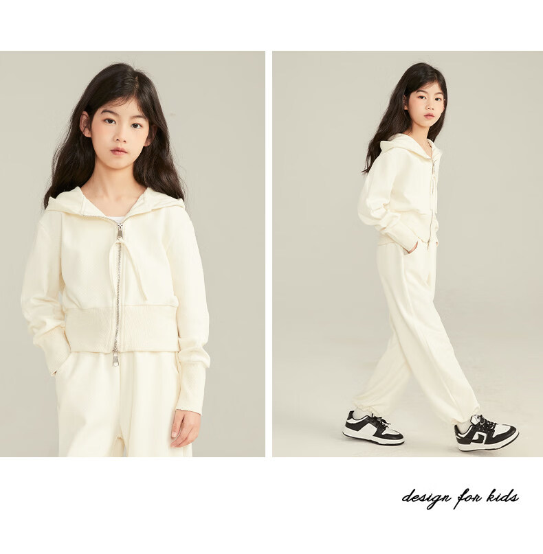 淘町女童套装春秋装新款中大童休闲纯色美式拉链儿童运动连帽两件套 米白色 斜拉链设计 170