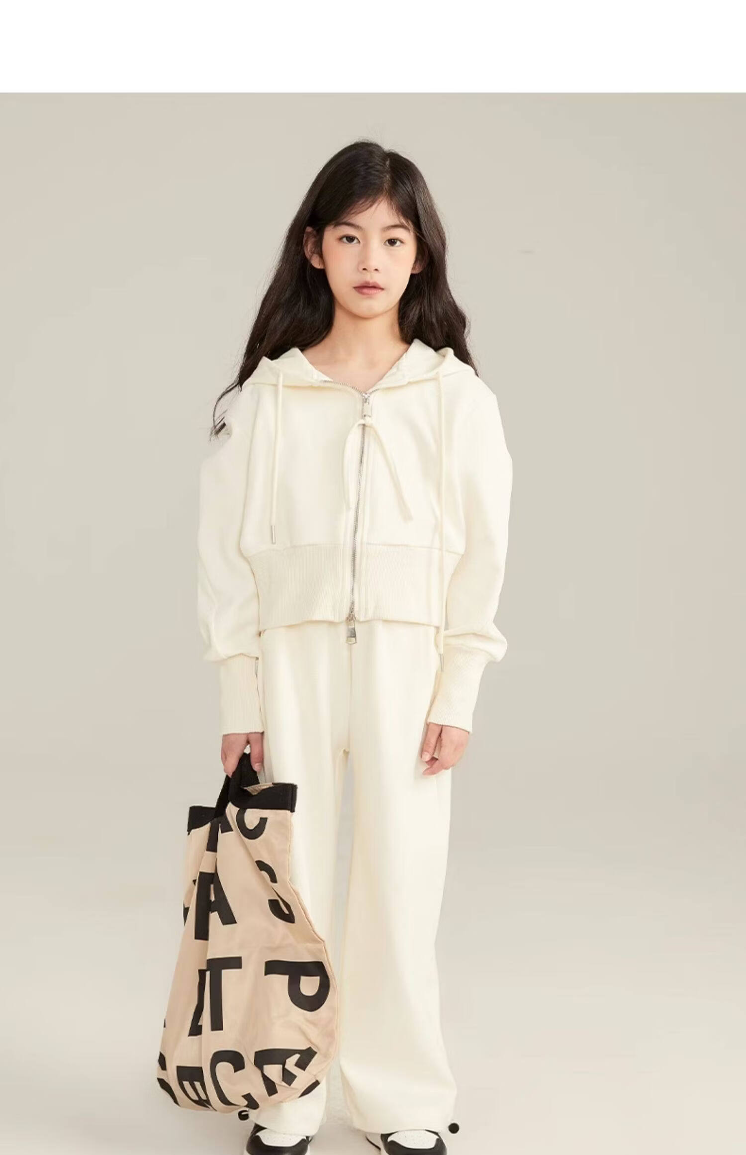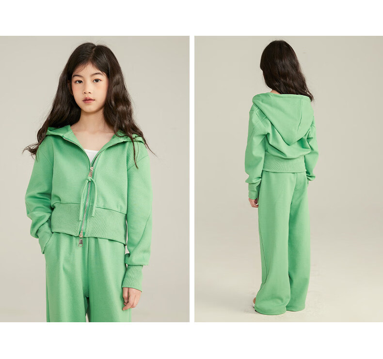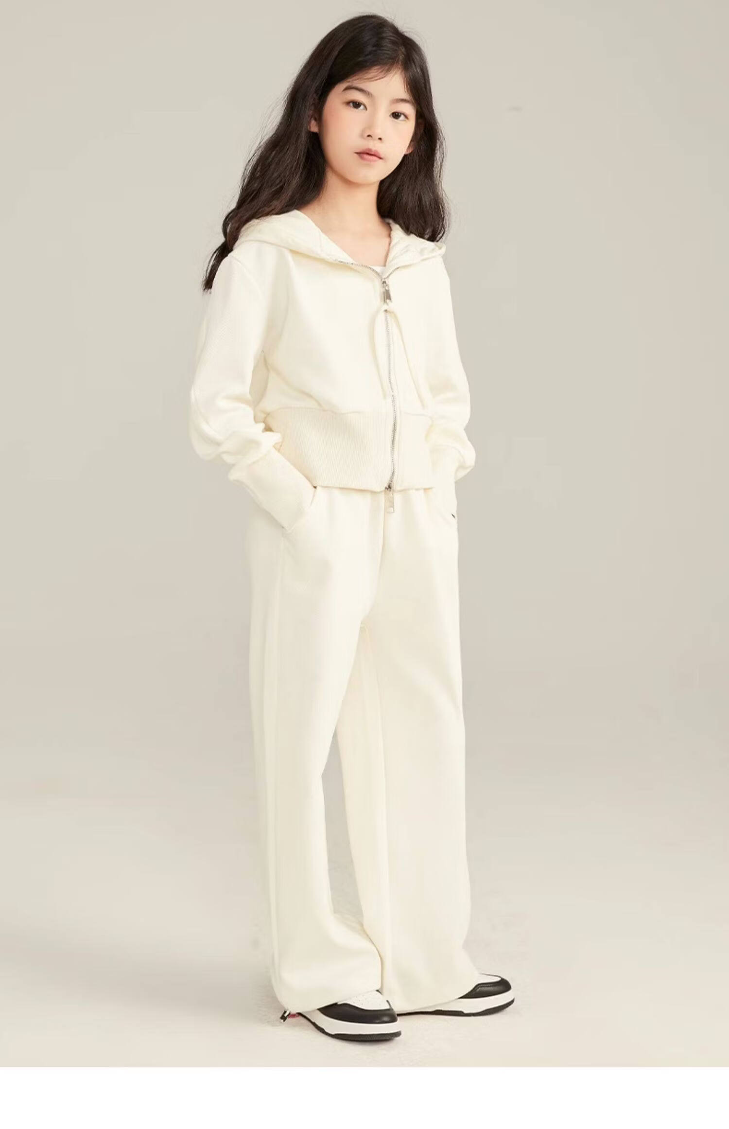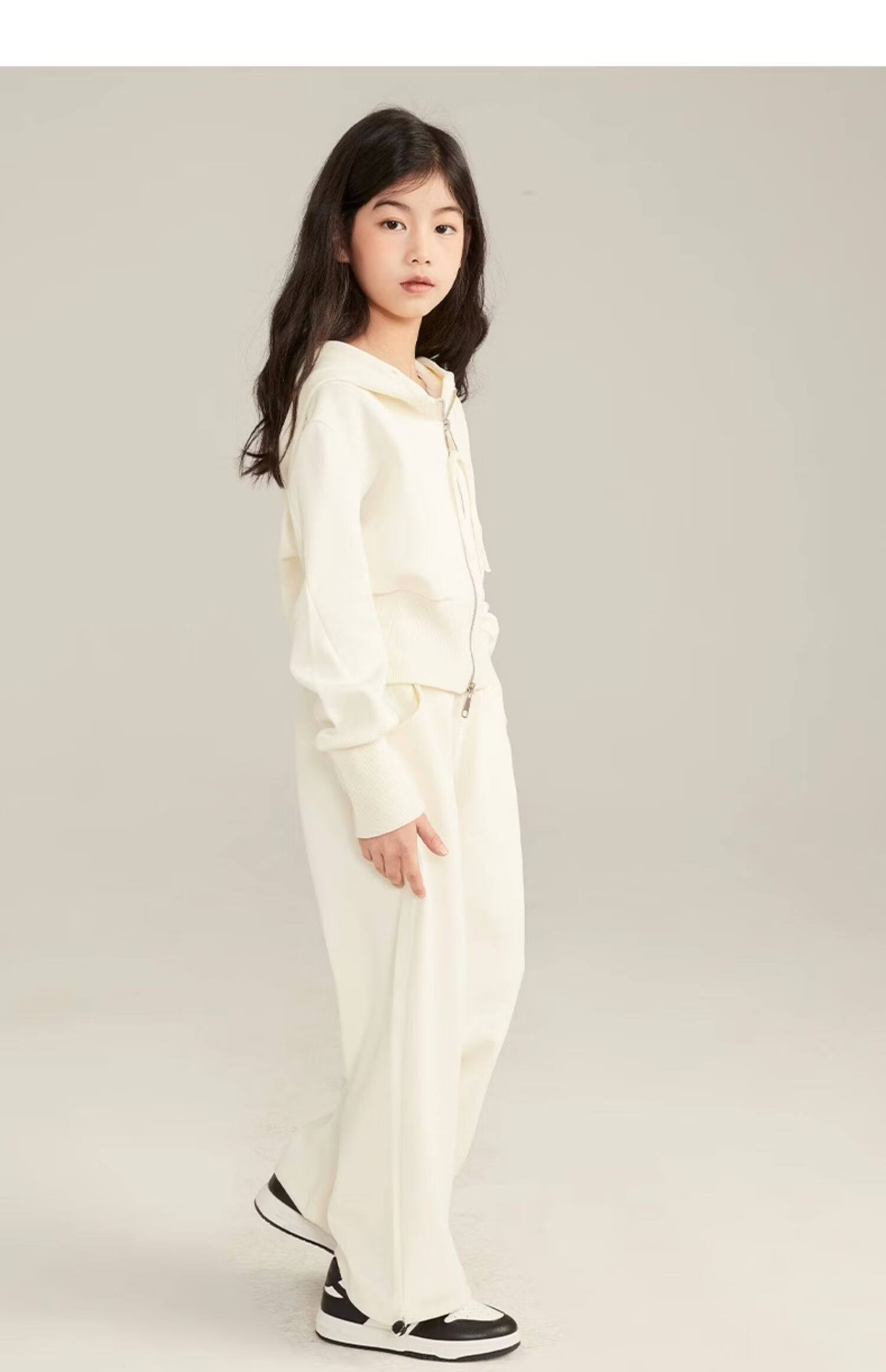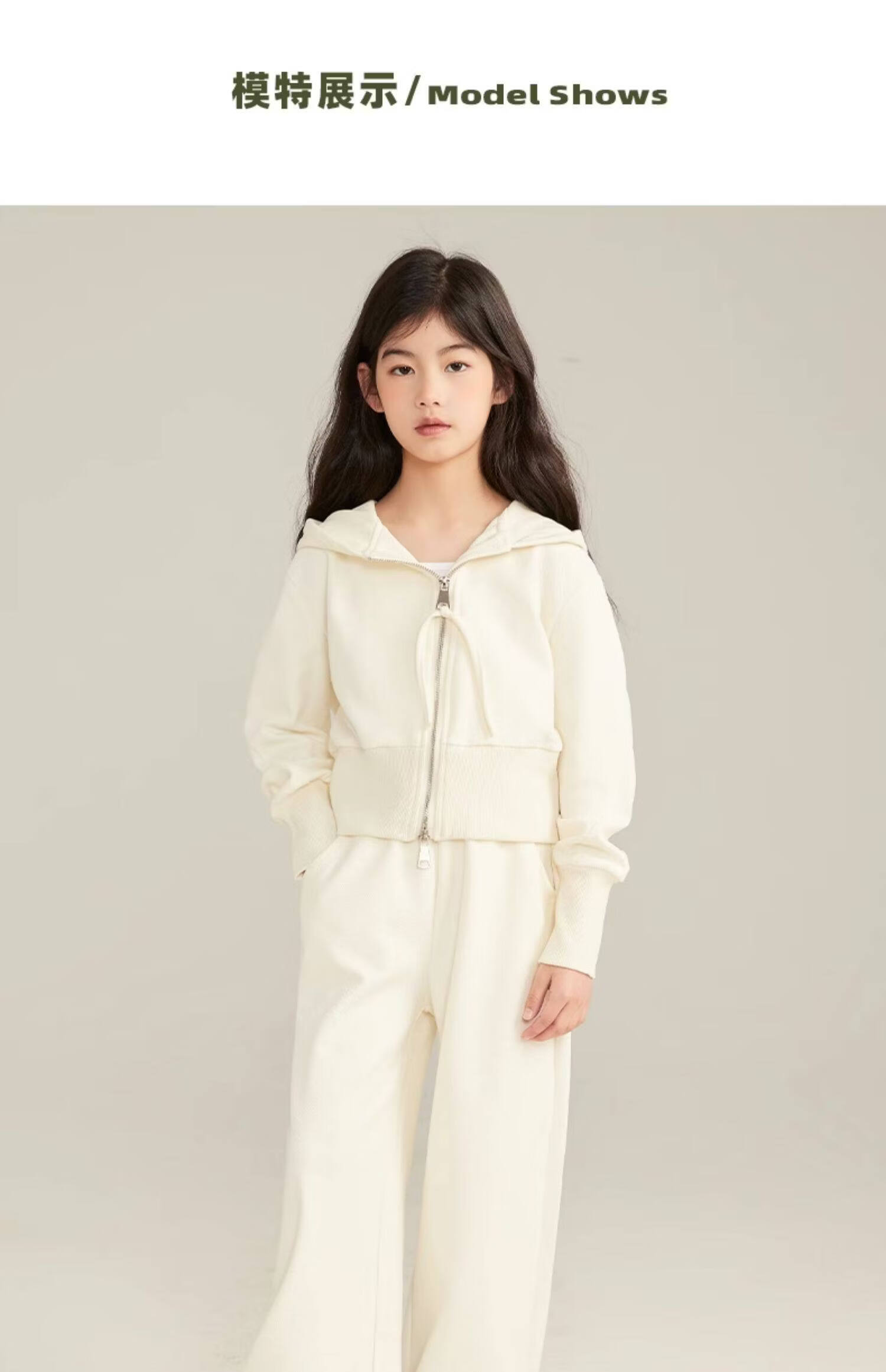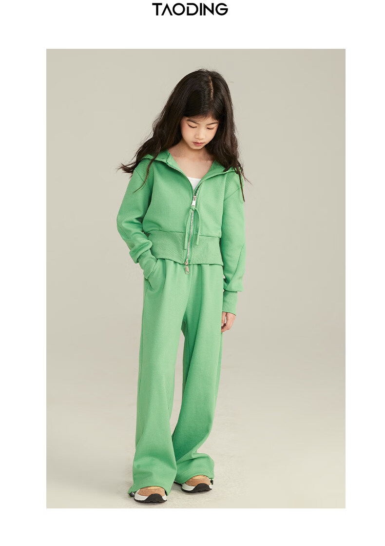 淘町女童套装春秋装新款中大童休闲纯色美式拉链儿童运动连帽两件套 米白色 斜拉链设计 170