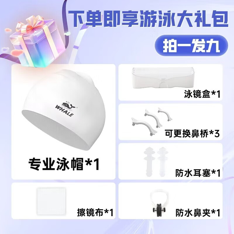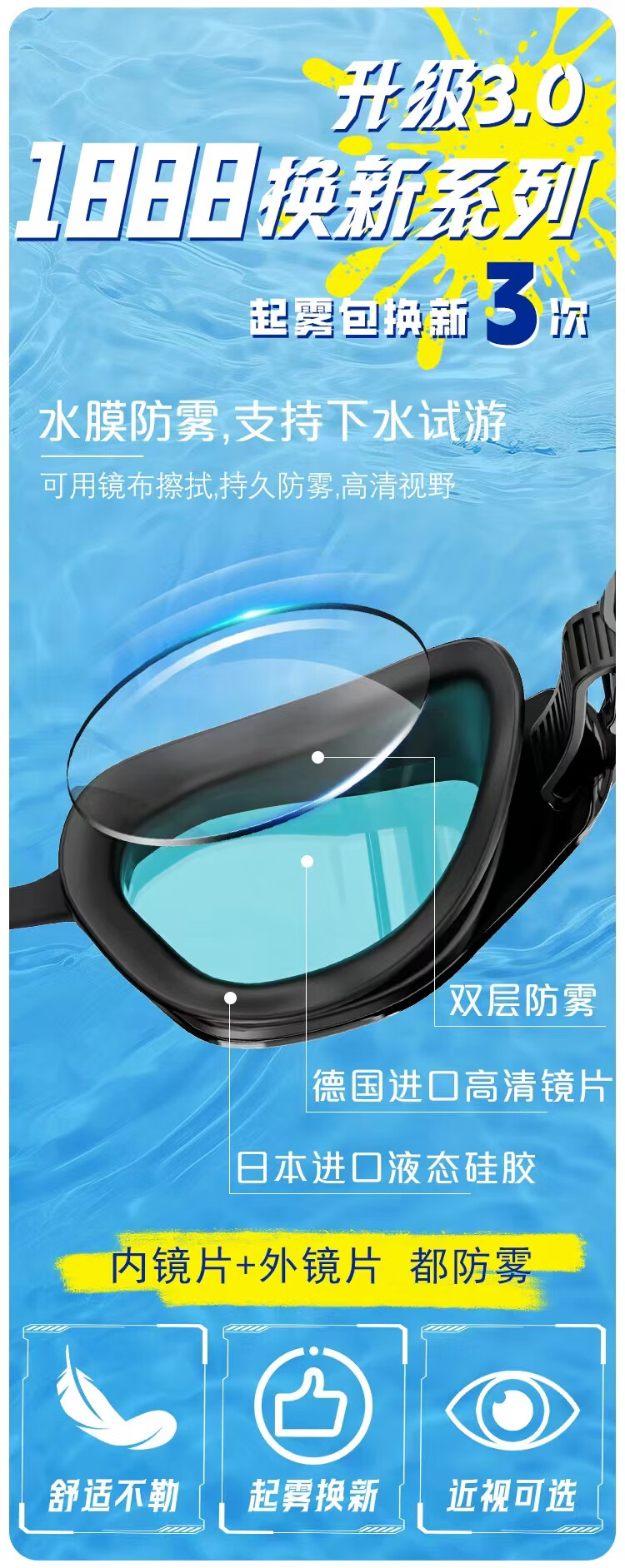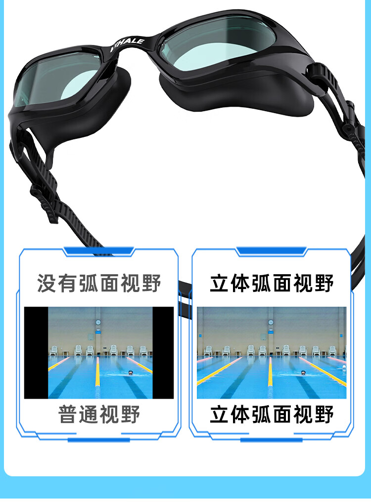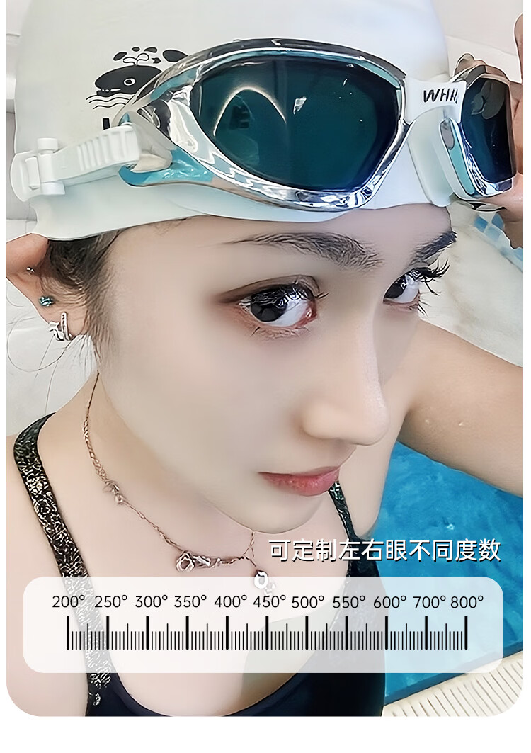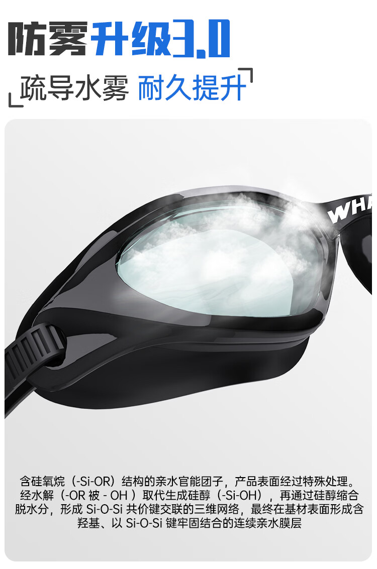 鲸鱼S1防雾泳镜近视带度数成人男士女士防水游泳眼镜近视游泳镜泳帽 【纳米近视款】暗夜黑透明镜片-800度