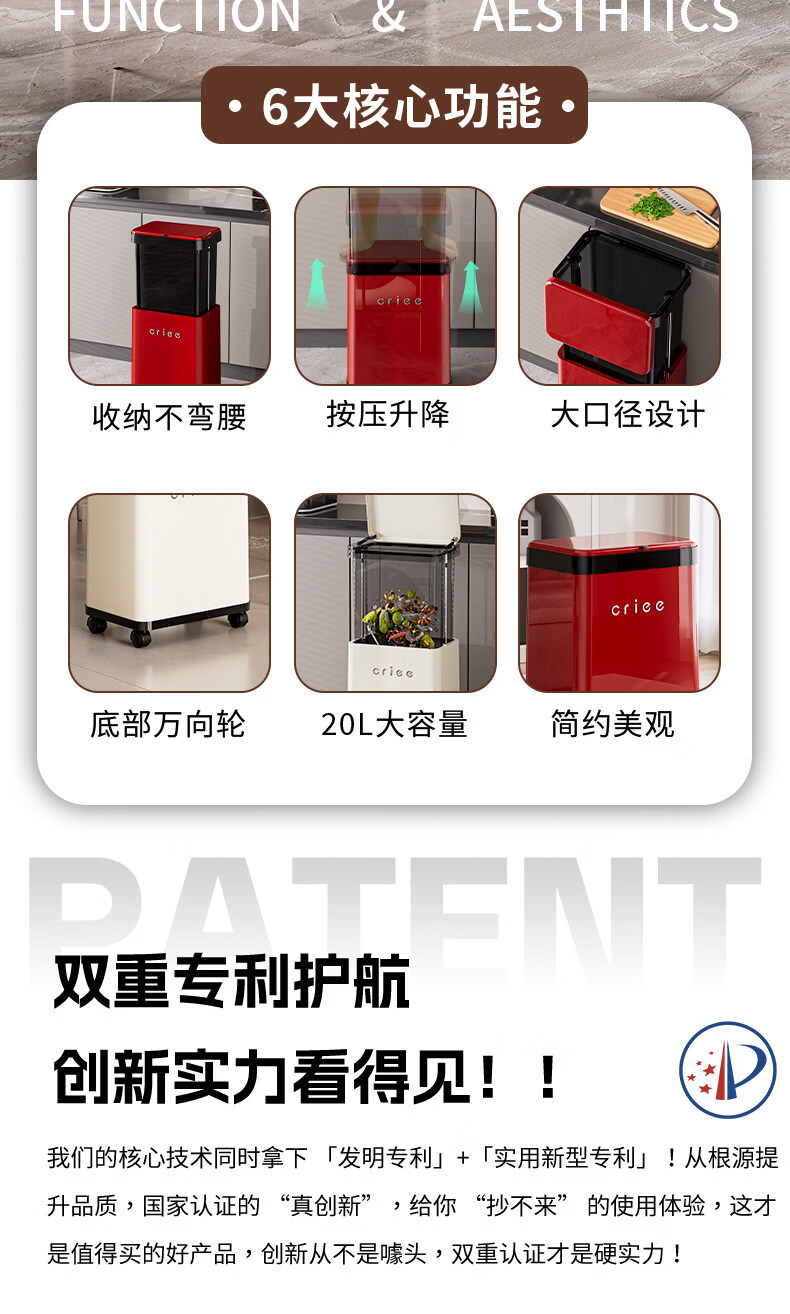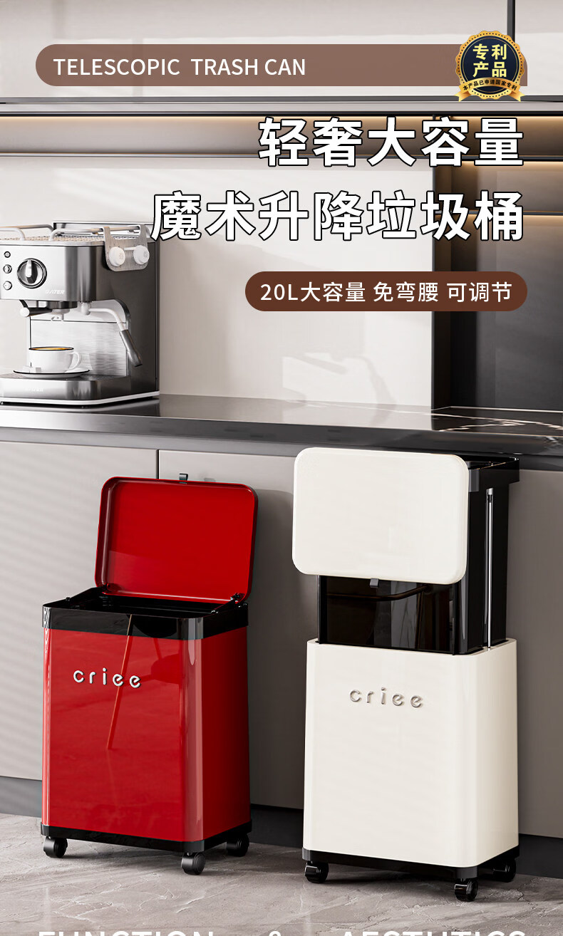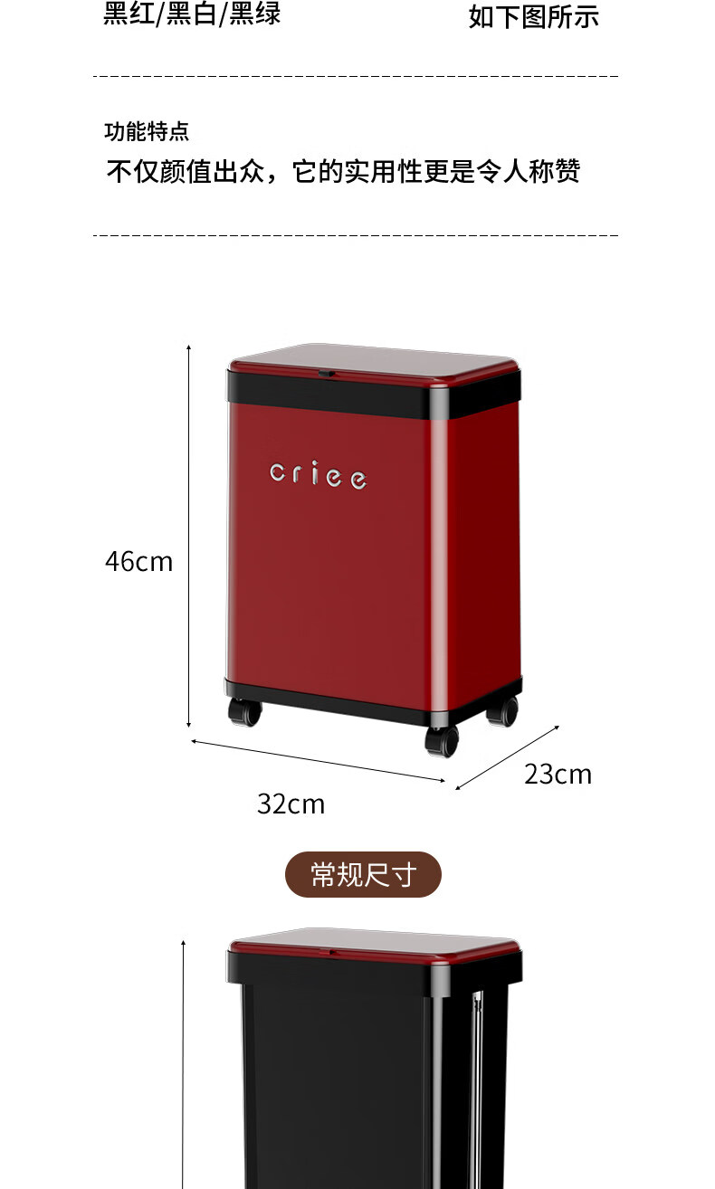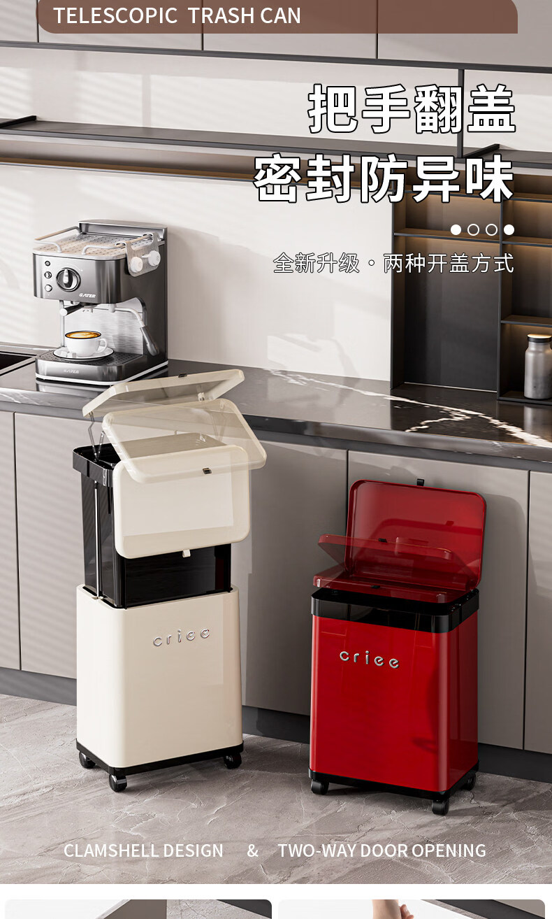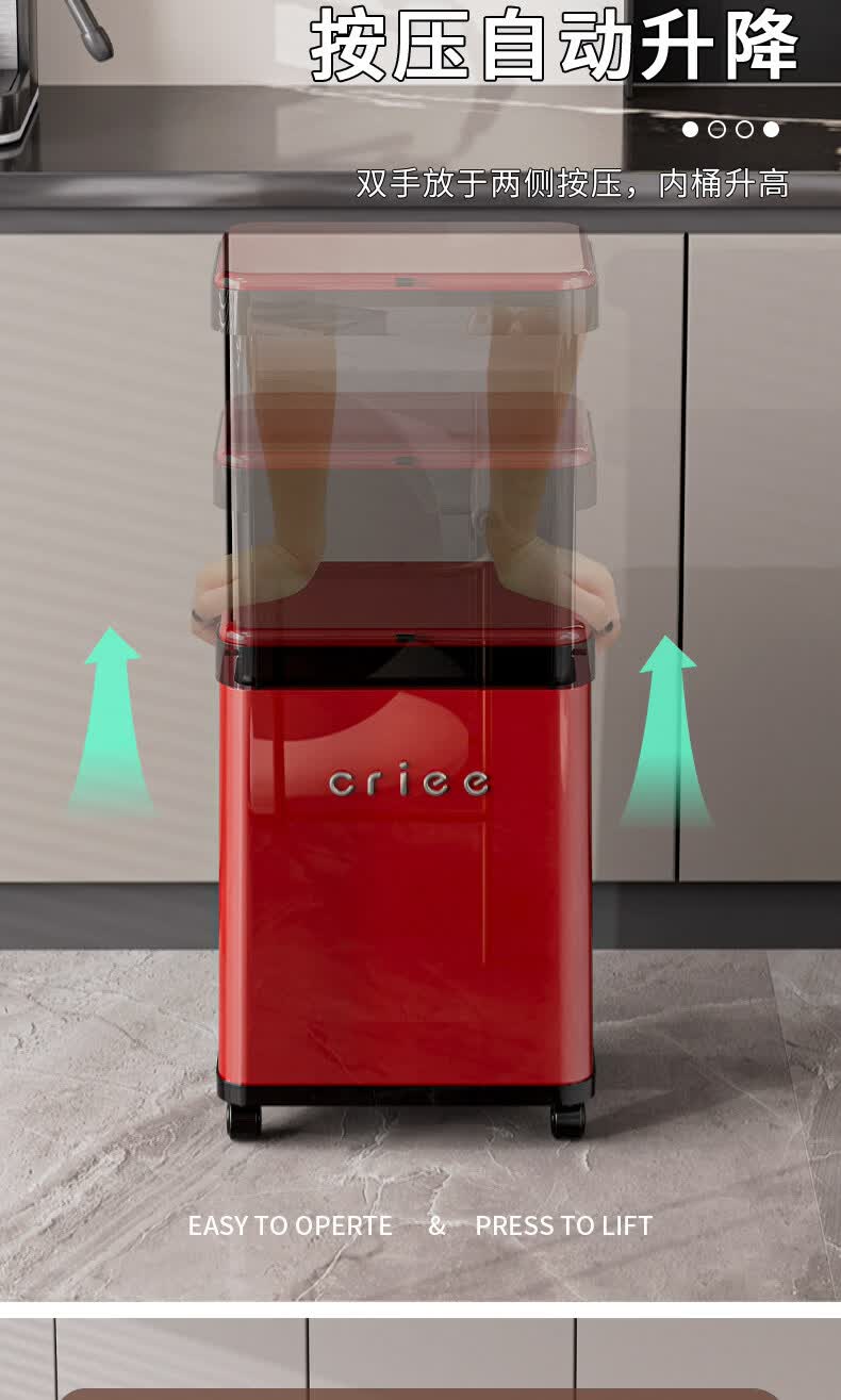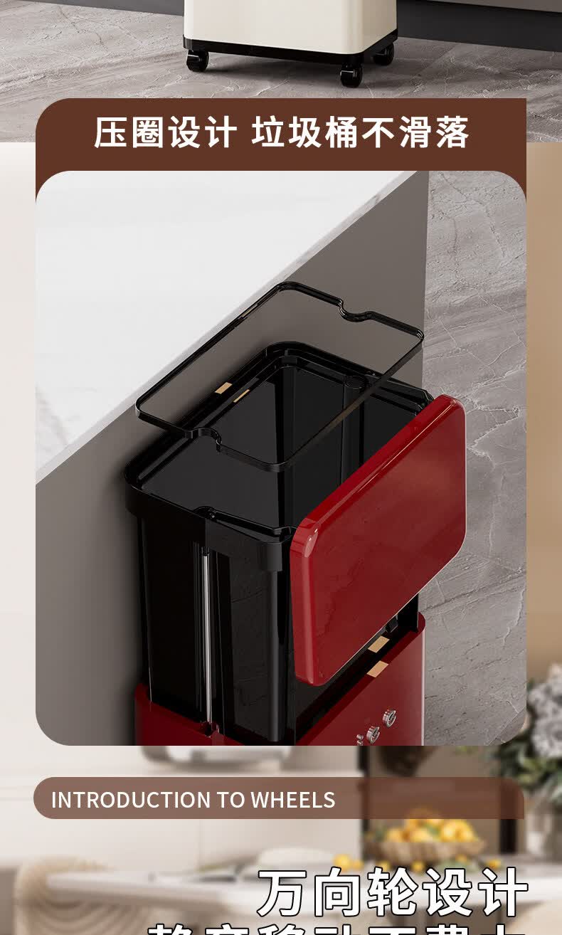 艾仕可(ASCOR)厨房垃圾桶免弯腰大容量2026新款高档颜值客厅家用轻奢可移动带盖 厨用垃圾桶-黑红【可升降/免弯腰】