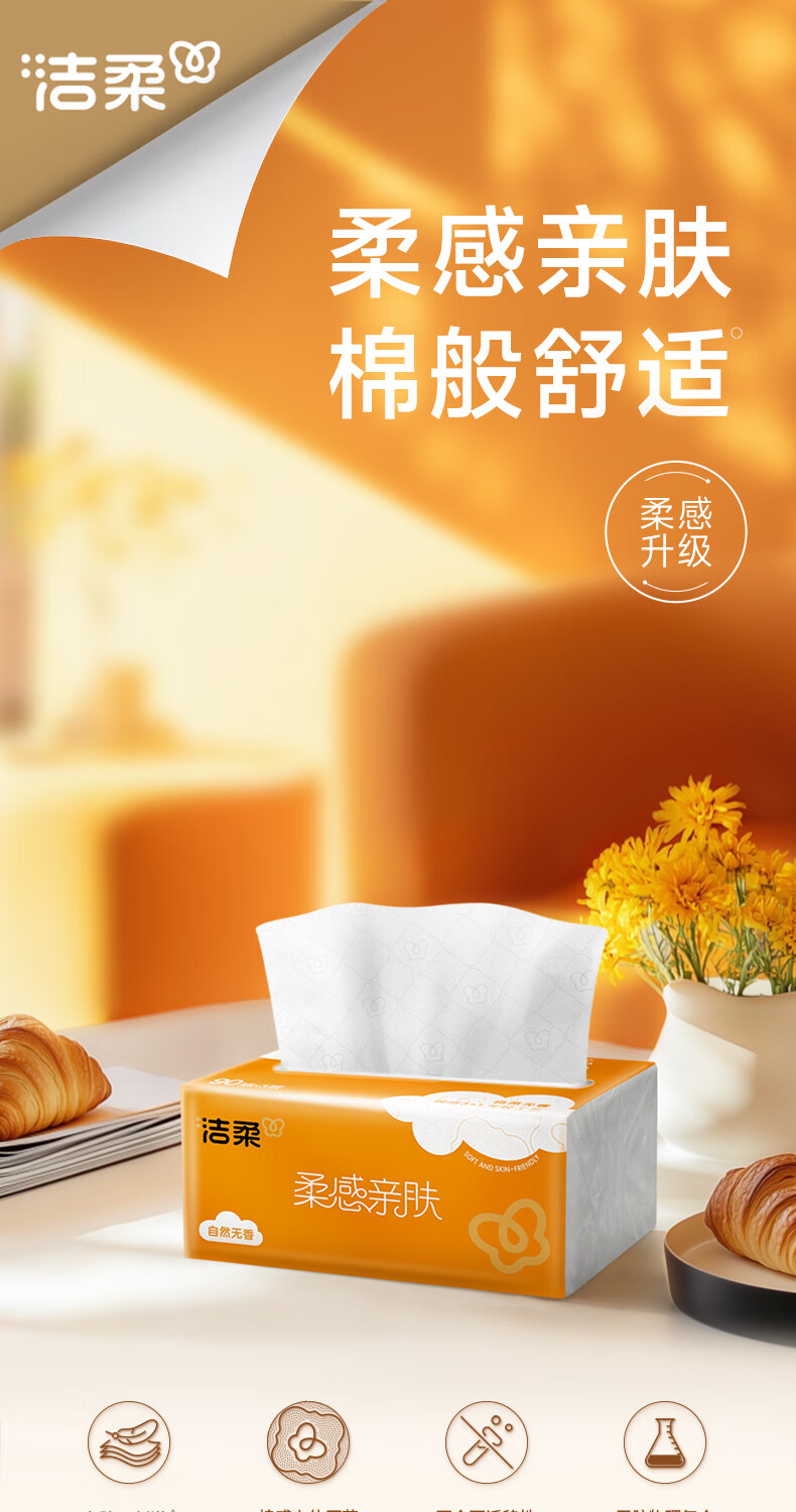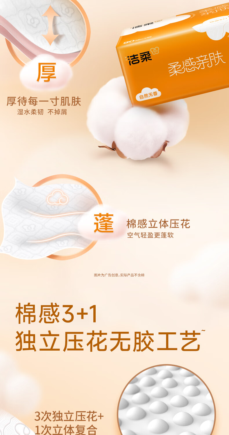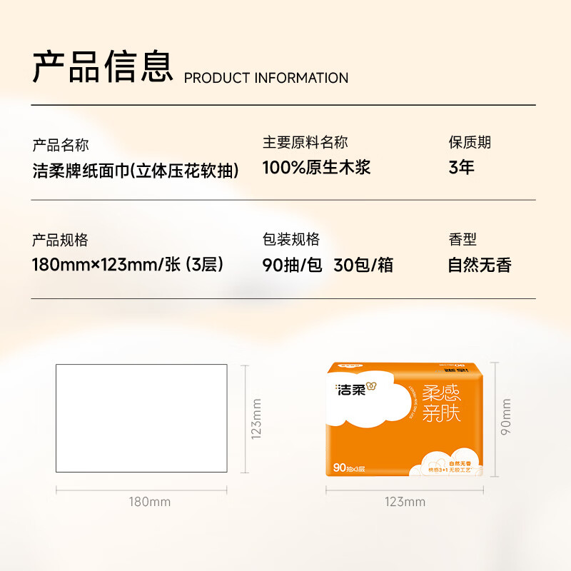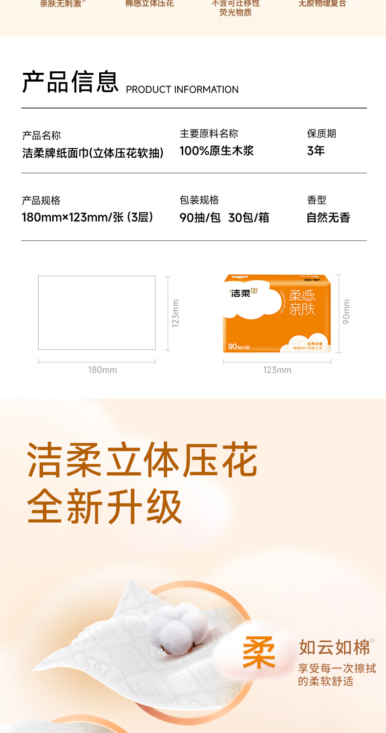 洁柔抽纸 棉柔感3层90抽*30包 立体压花纸巾 亲肤可湿水卫生纸 整箱