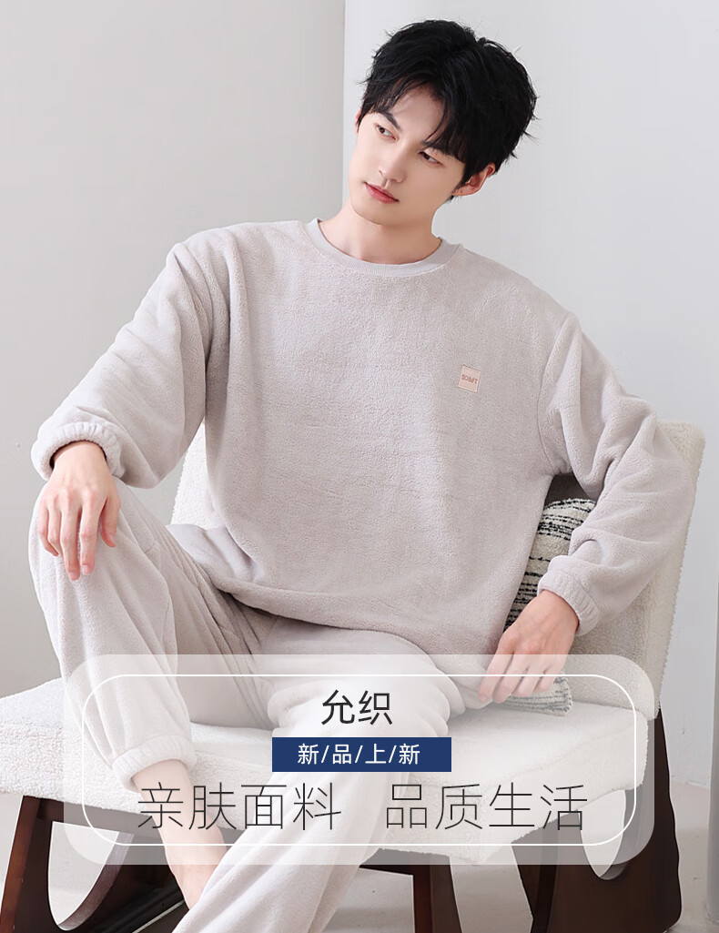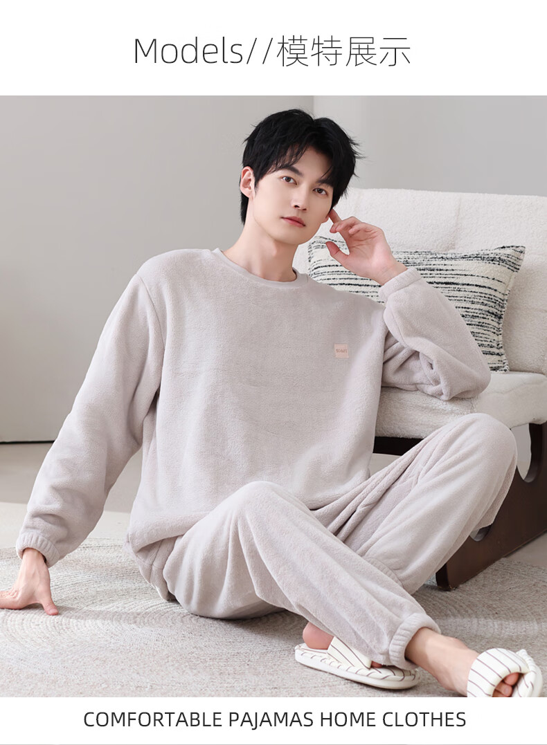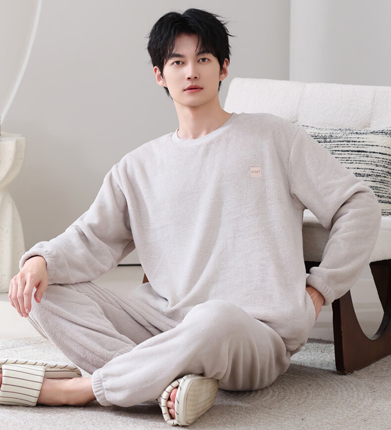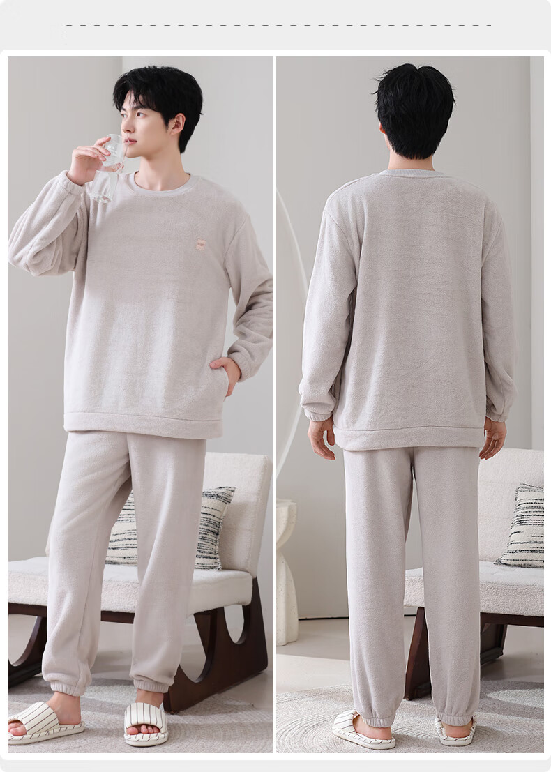 允织法兰绒睡衣男士冬季加厚加绒珊瑚绒秋冬款天男款可外穿家居服套装 4903-灰杏 L (170) :建议100-135斤穿着