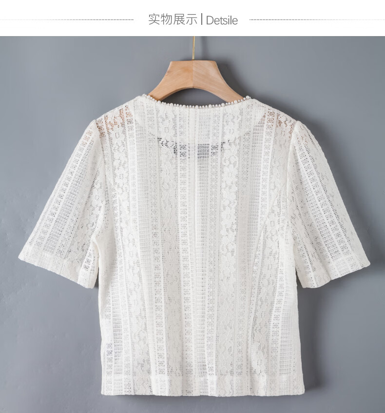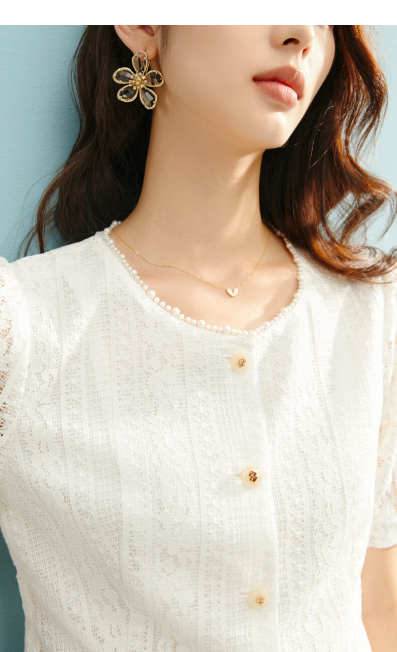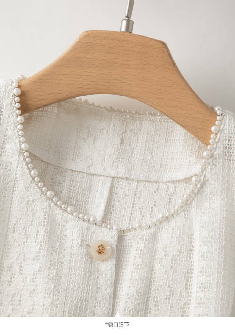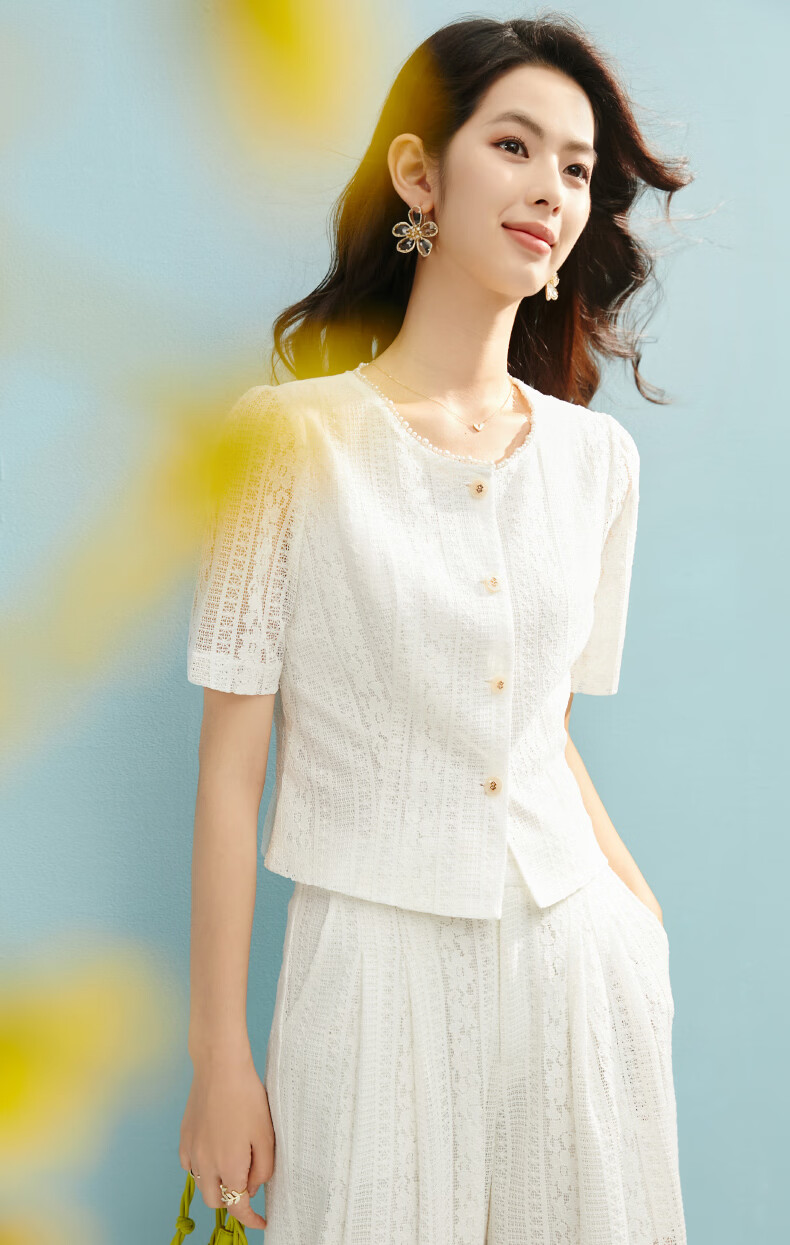 晚白【新品】2026年春款时尚圆领白色蕾丝短上衣轻盈透气棉质衬衫女 米白色 S