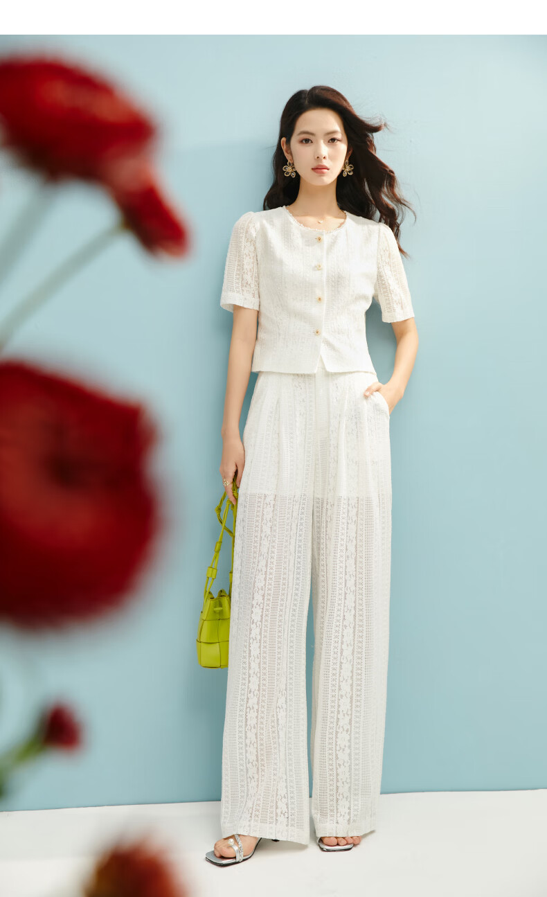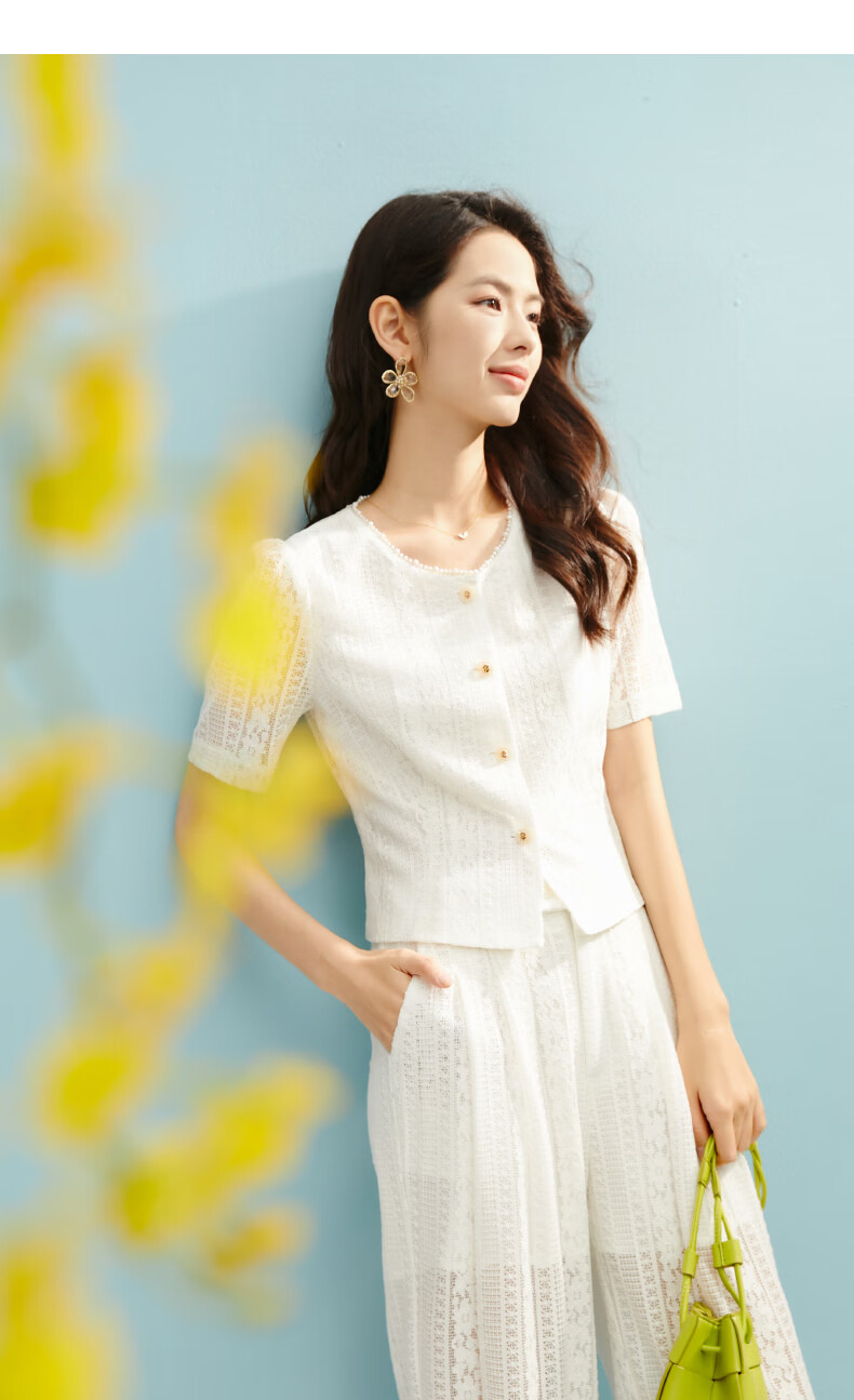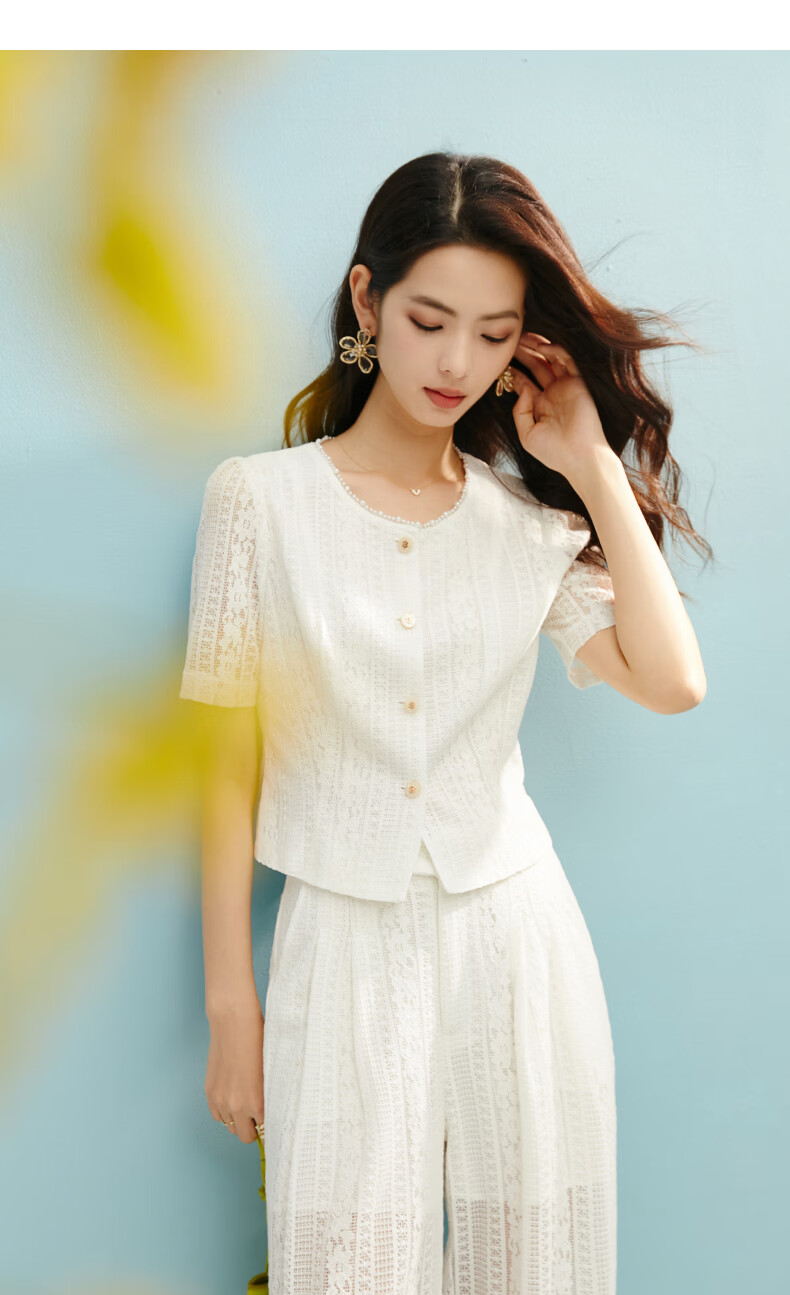 晚白【新品】2026年春款时尚圆领白色蕾丝短上衣轻盈透气棉质衬衫女 米白色 S