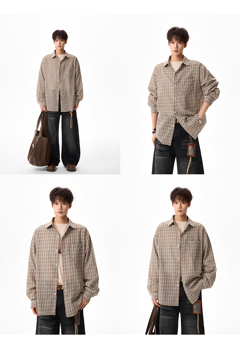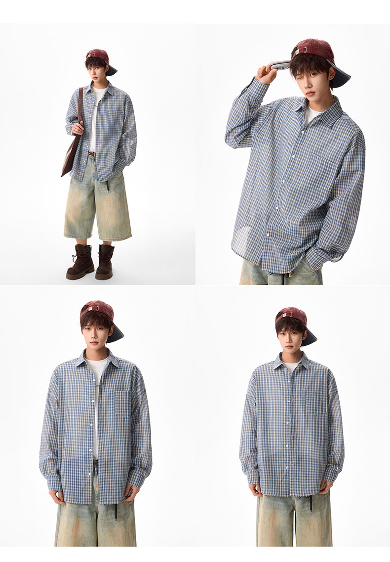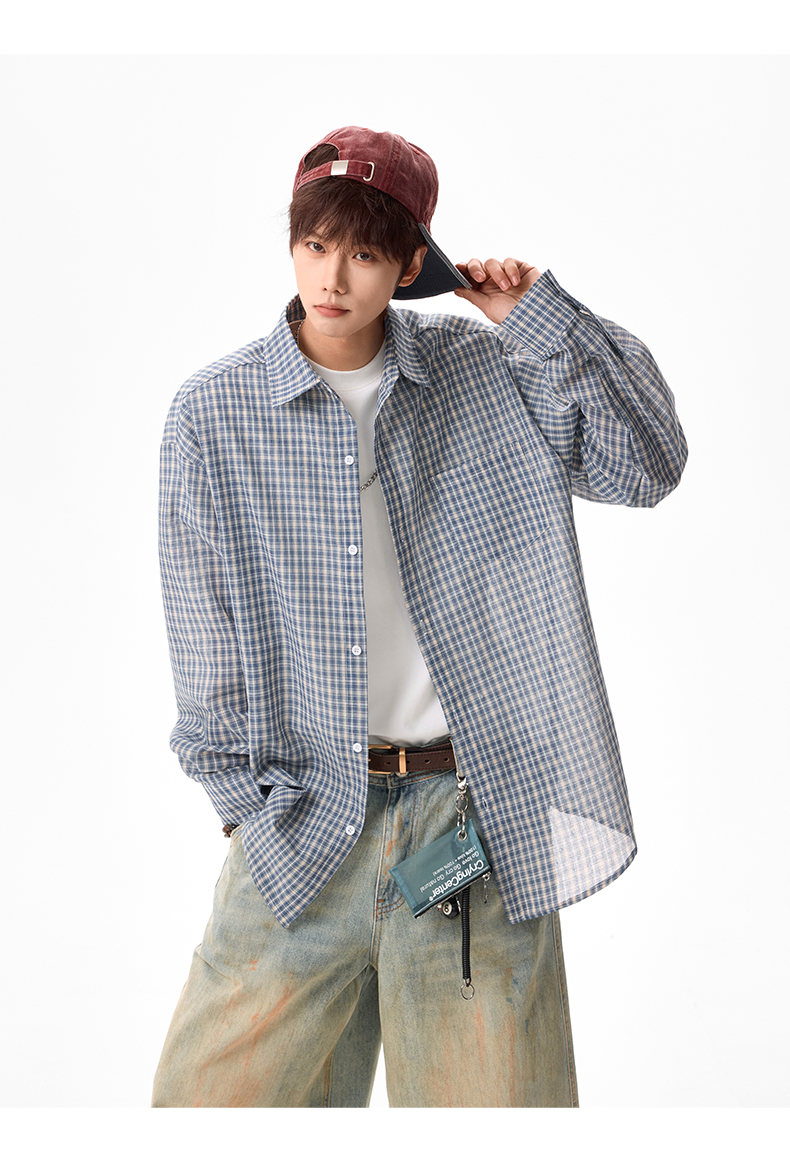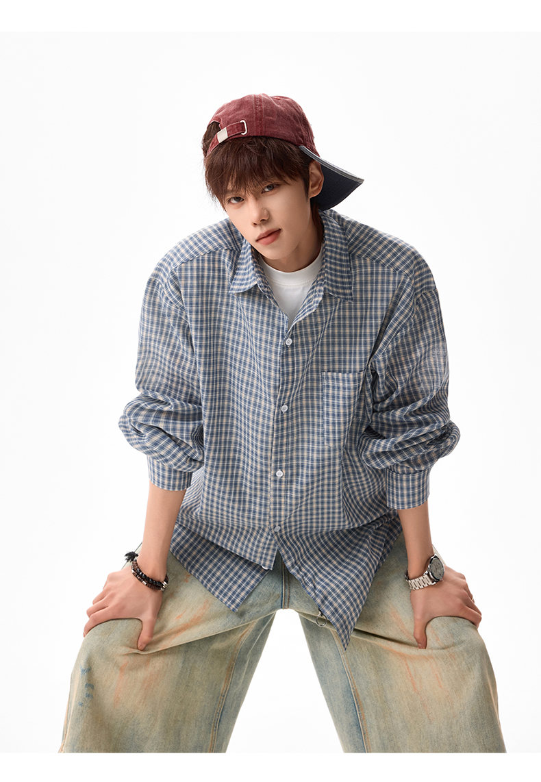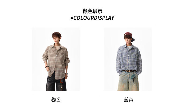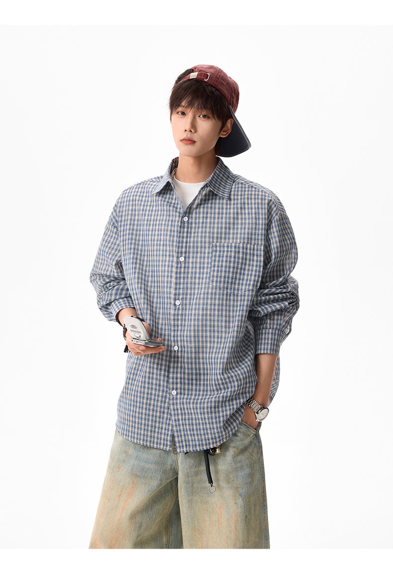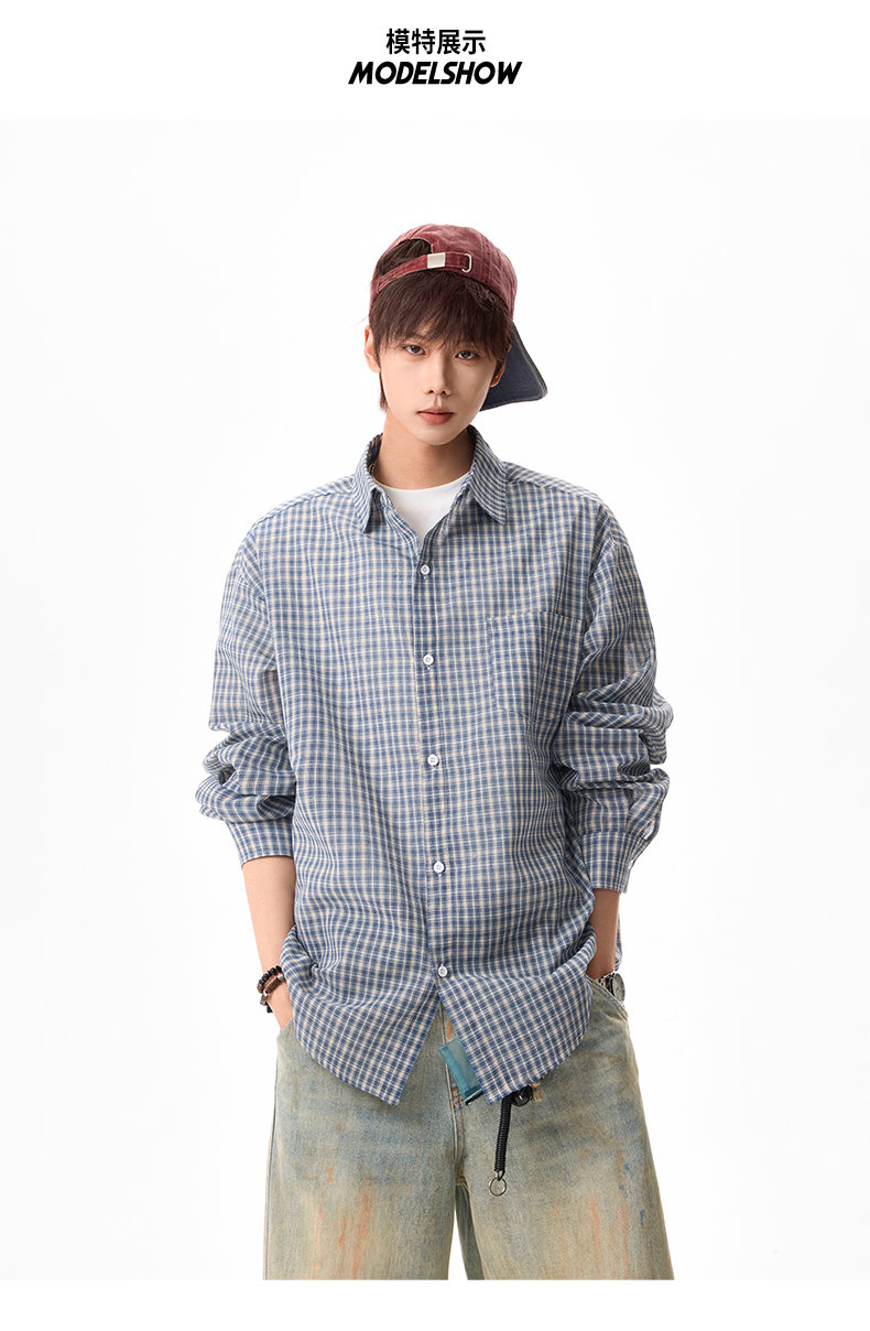 NEW OR MODE美式格纹撞色翻领衬衫男春季新款宽松休闲长袖衬衣百搭慵懒感外套 蓝格【高品质】 M 【建议90-110斤】