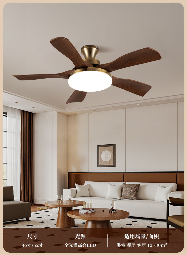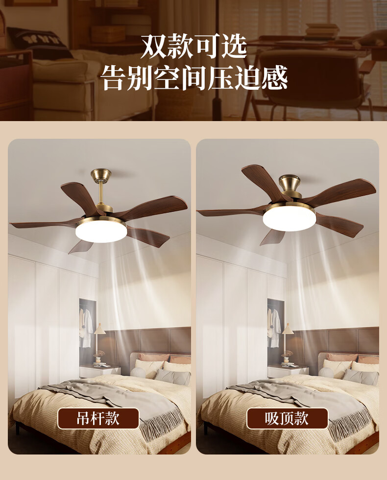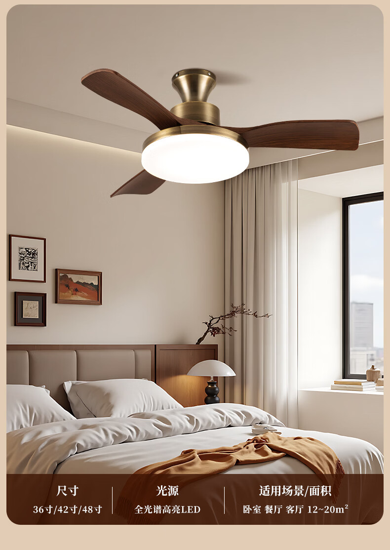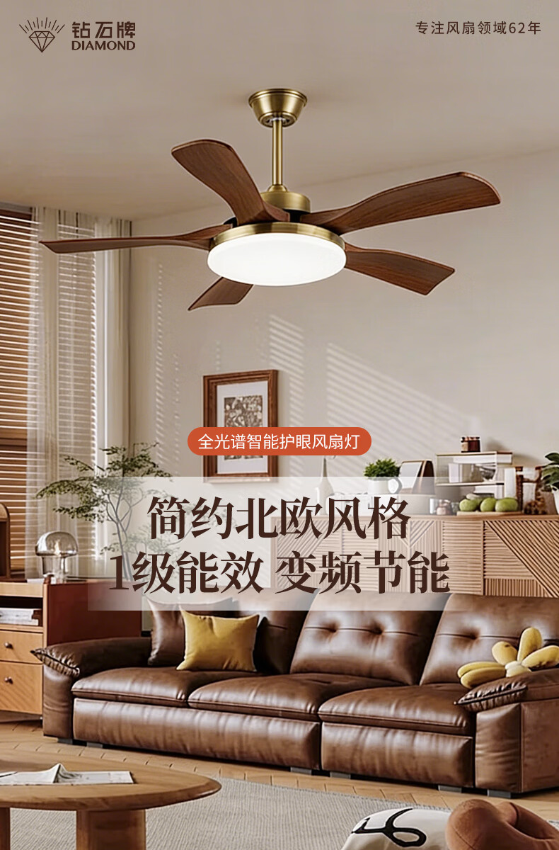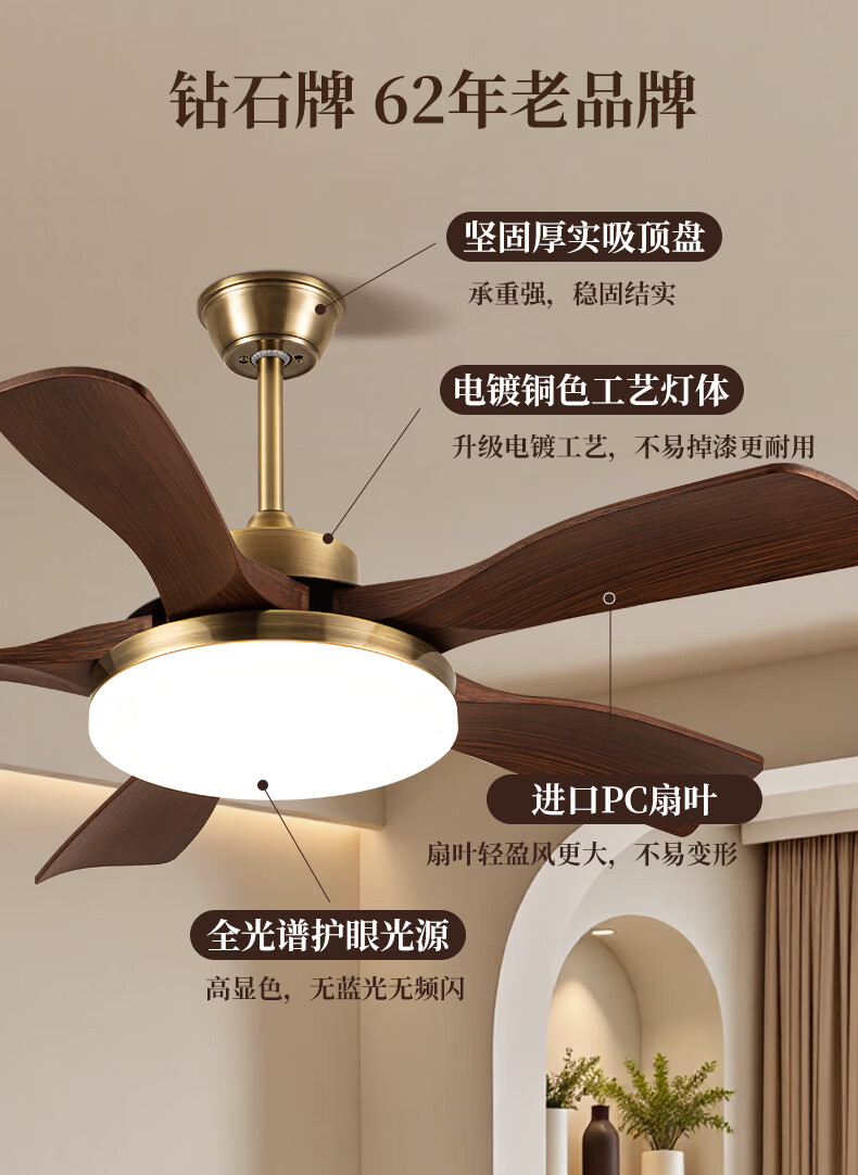 钻石牌风扇灯一体餐厅吊扇灯客厅吊灯带风扇卧室吸顶吊顶简约电扇灯具 36寸三叶古铜+黑胡桃遥控-吸顶