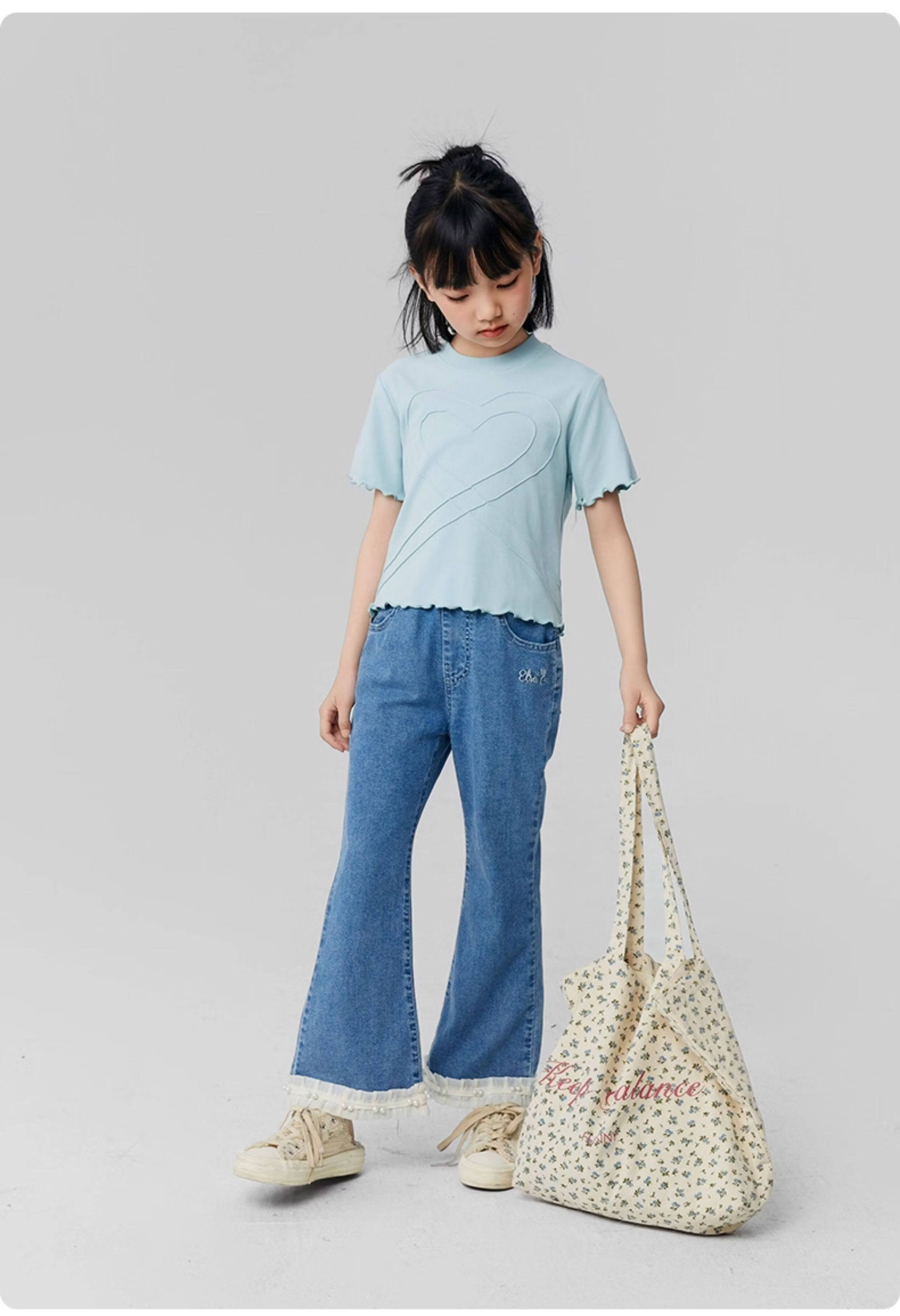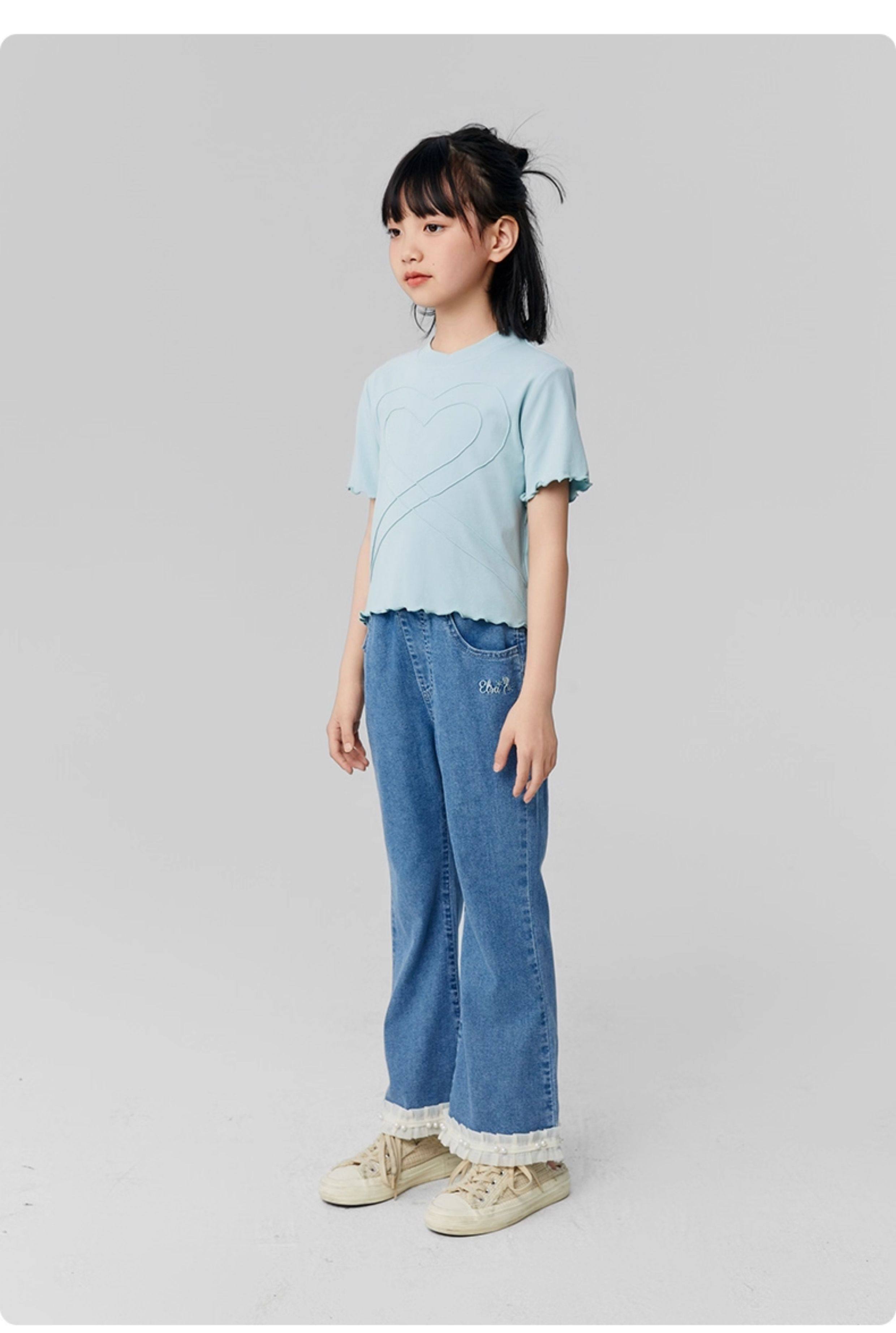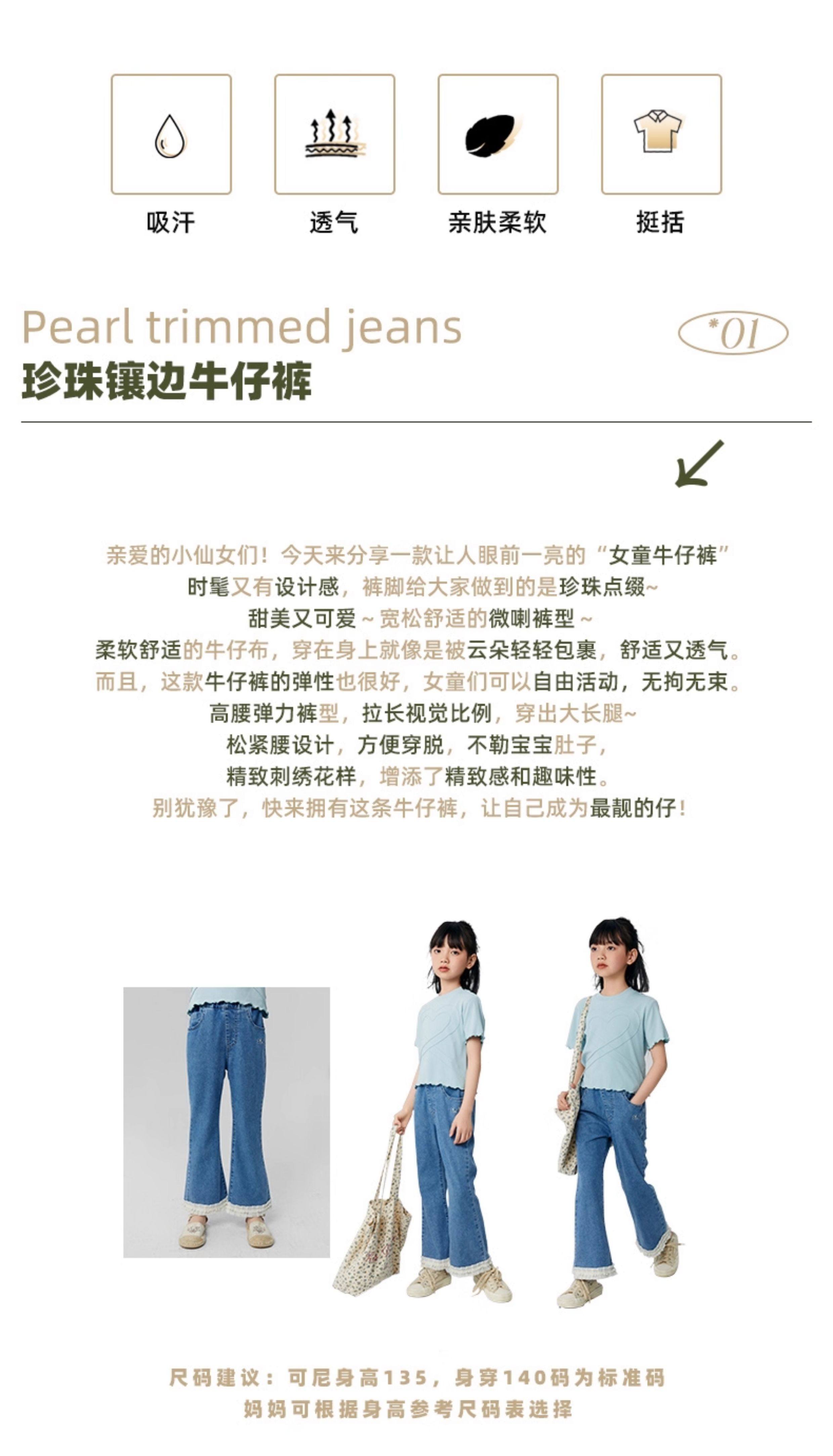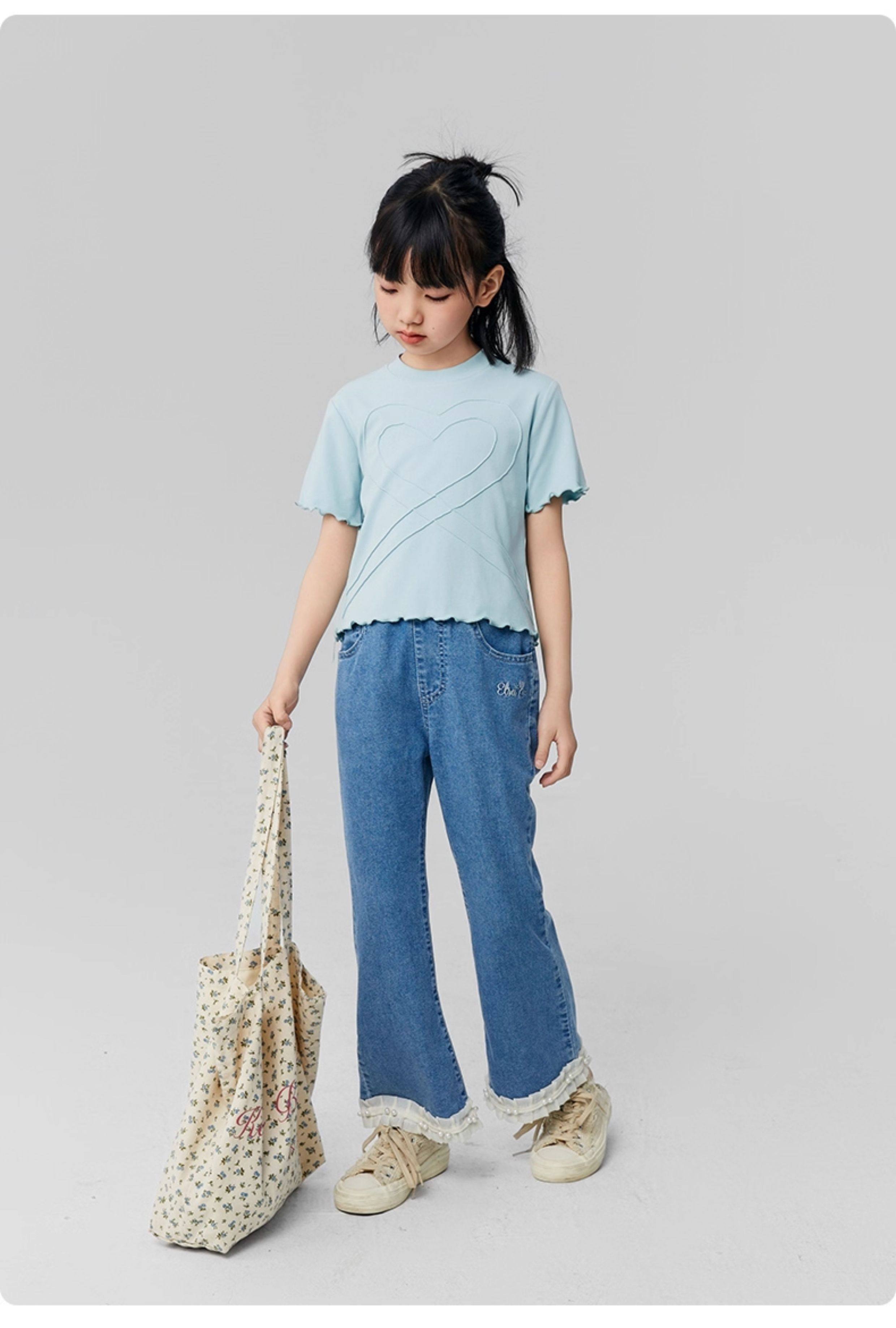 淘町女童牛仔裤夏季百搭宽松简约微喇叭松紧腰春秋薄款裤子 蓝色 150
