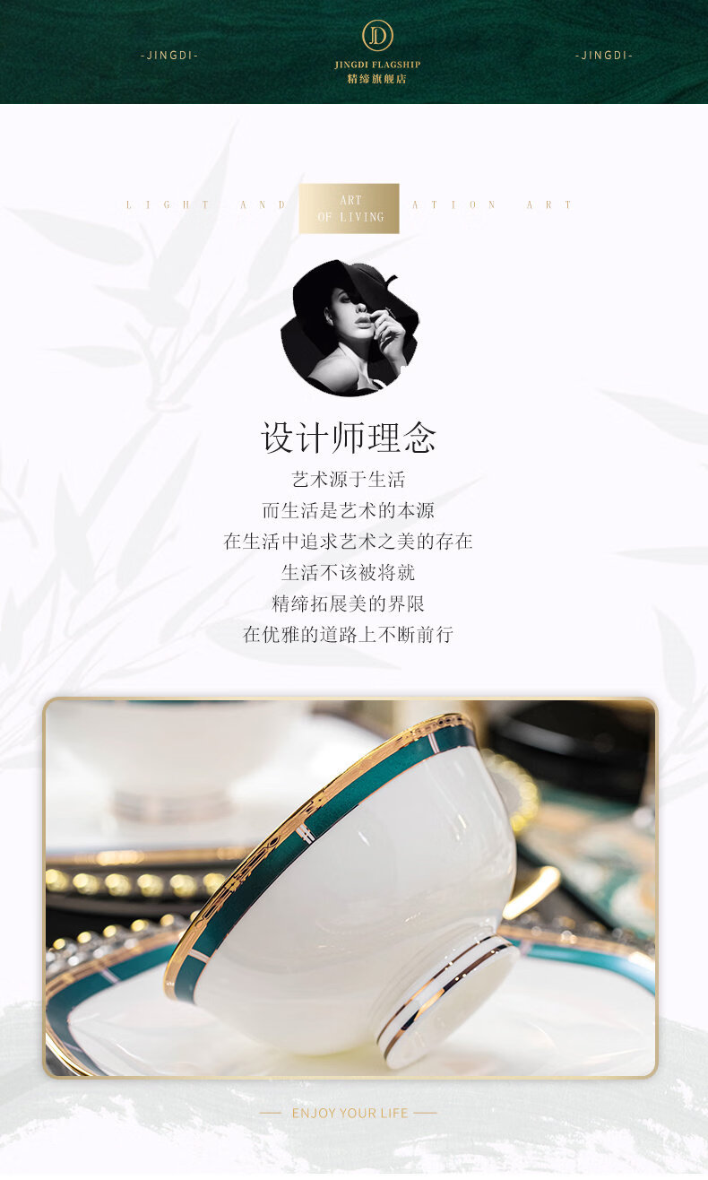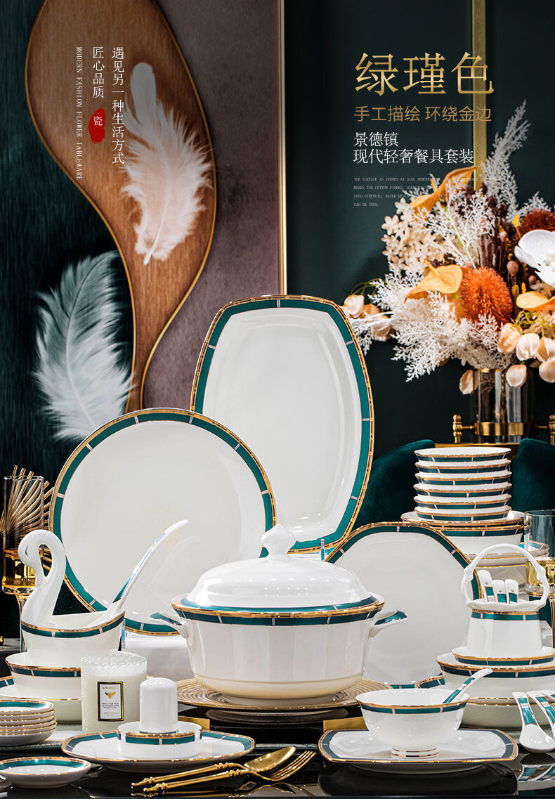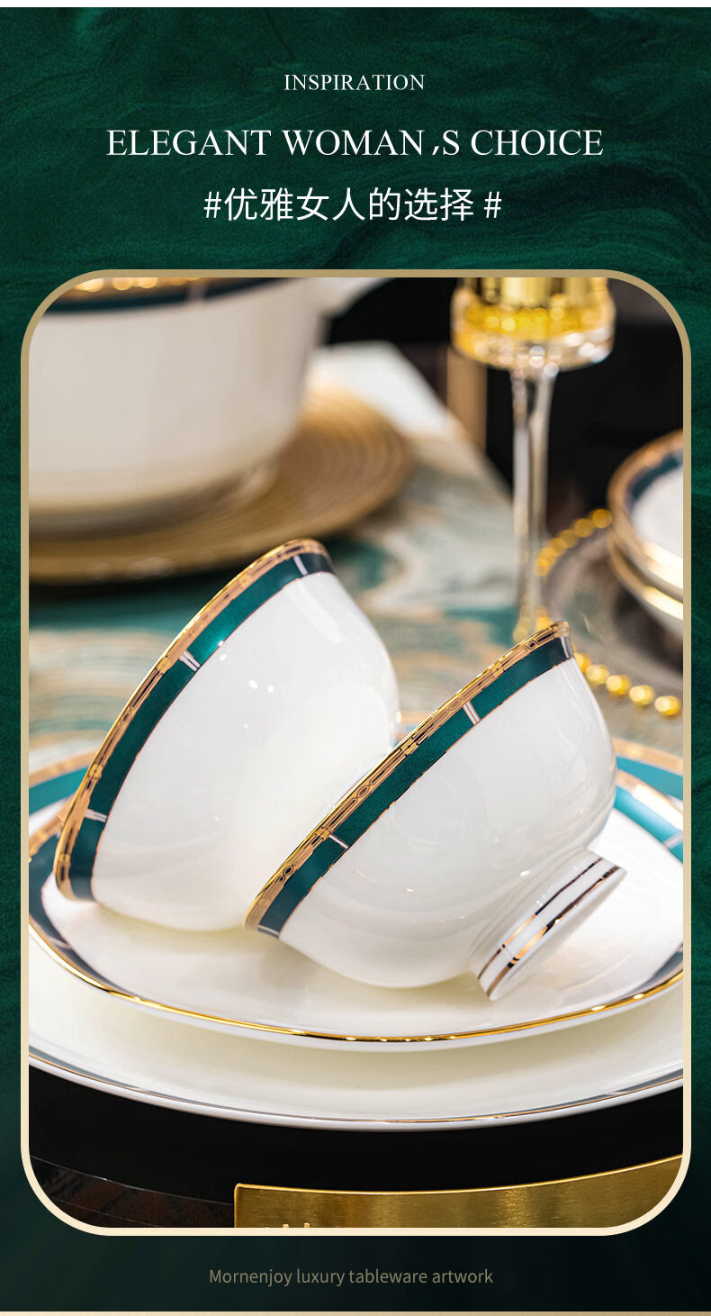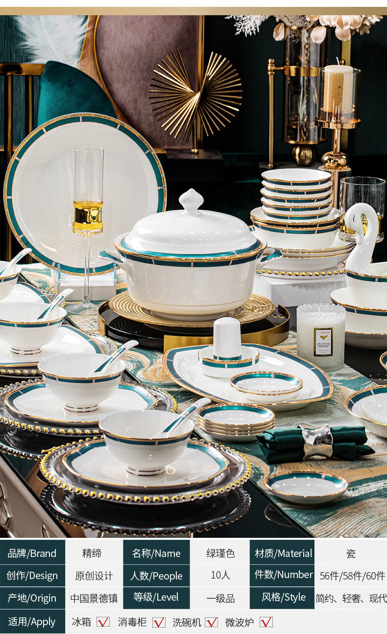 精缔陶瓷JINGDI碗家用2026新款碗筷景德镇骨瓷碗碟套装家用陶瓷餐具套装碗盘乔迁 【景德镇正品】绿瑾31件配大汤碗原创正品保障 31件套