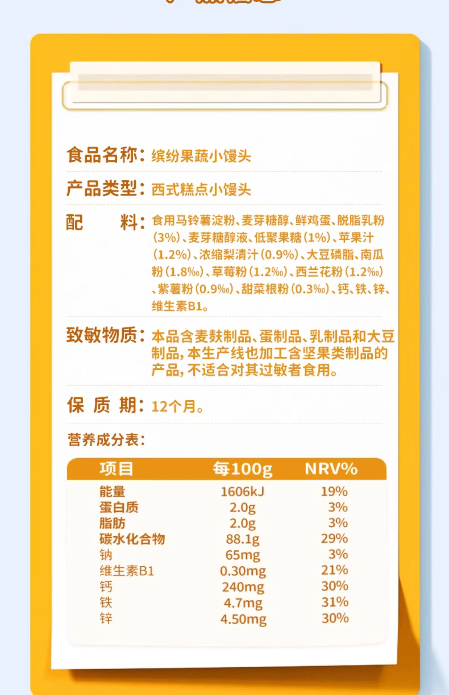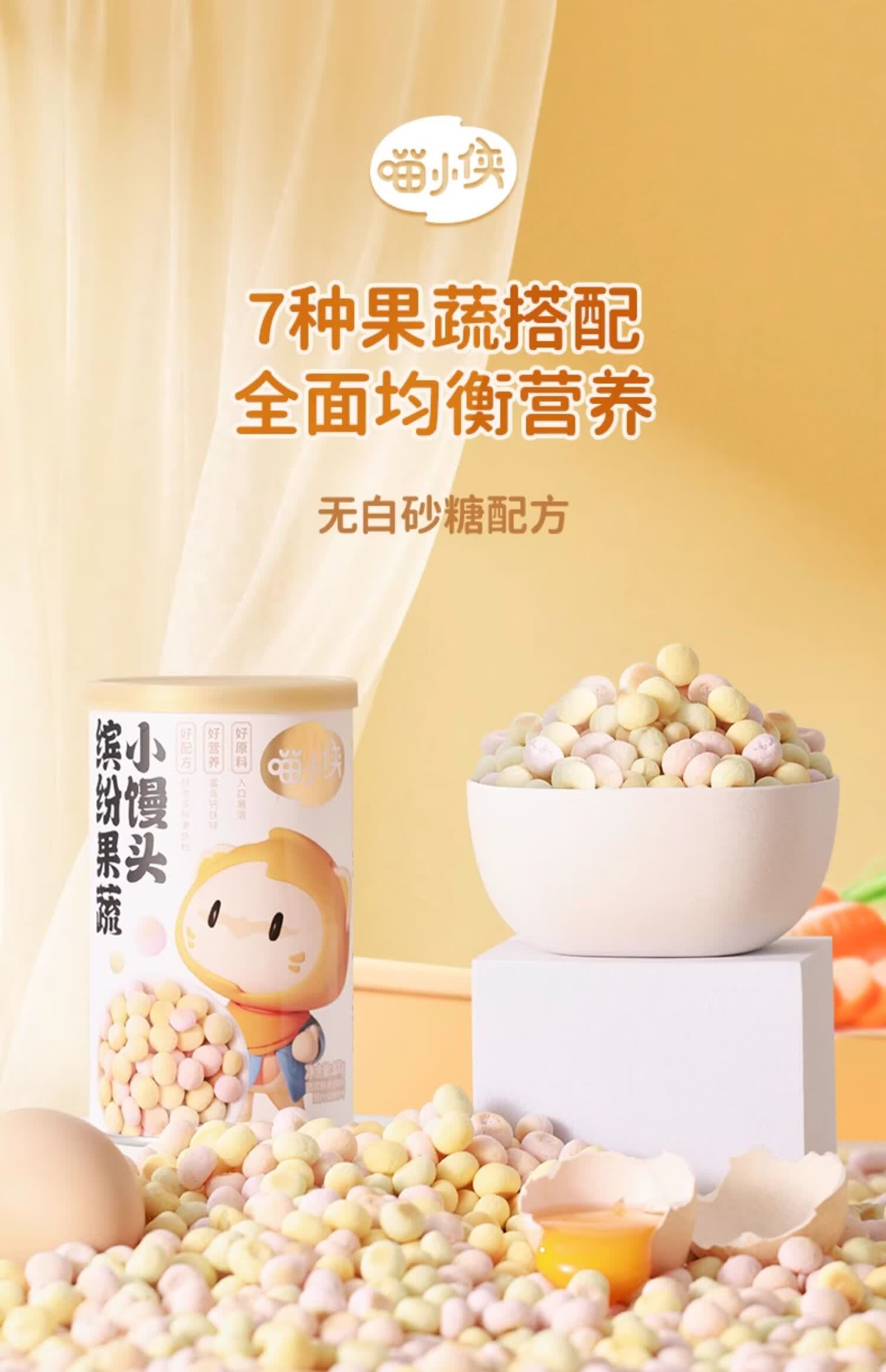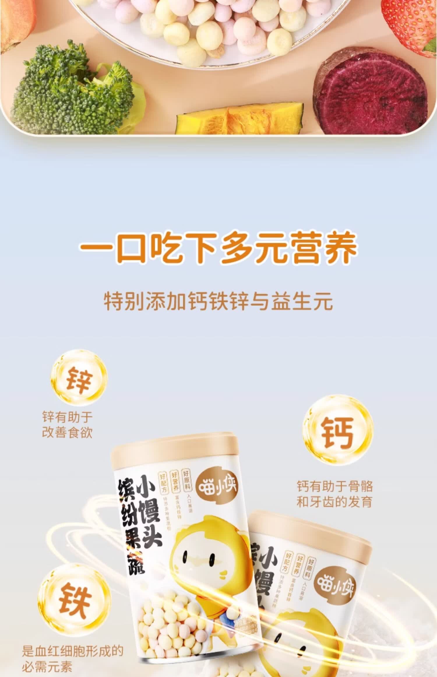 喵小侠五彩果蔬小馒头非油炸饼干儿童零食,送宝宝婴幼儿辅食食谱 彩果小馒头果蔬风味100g*2罐