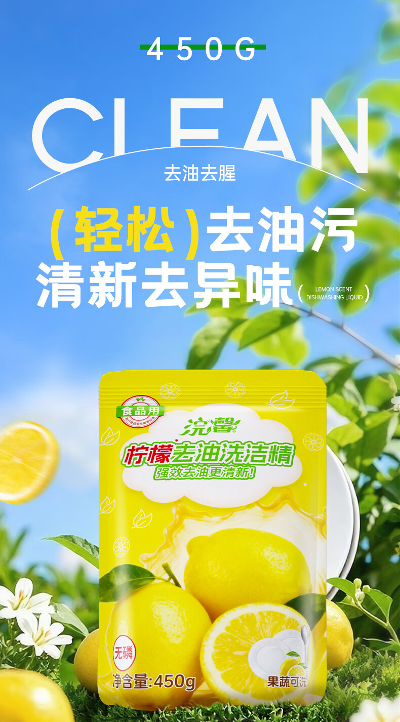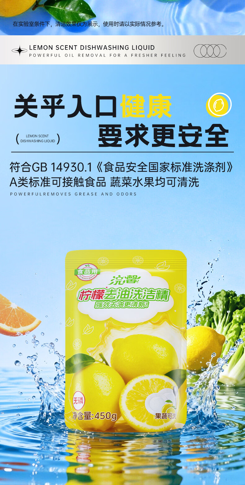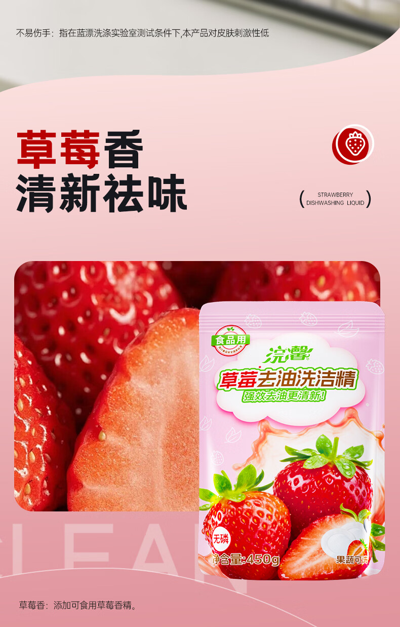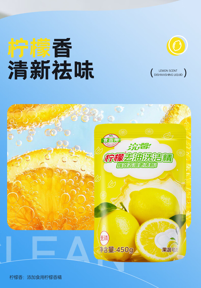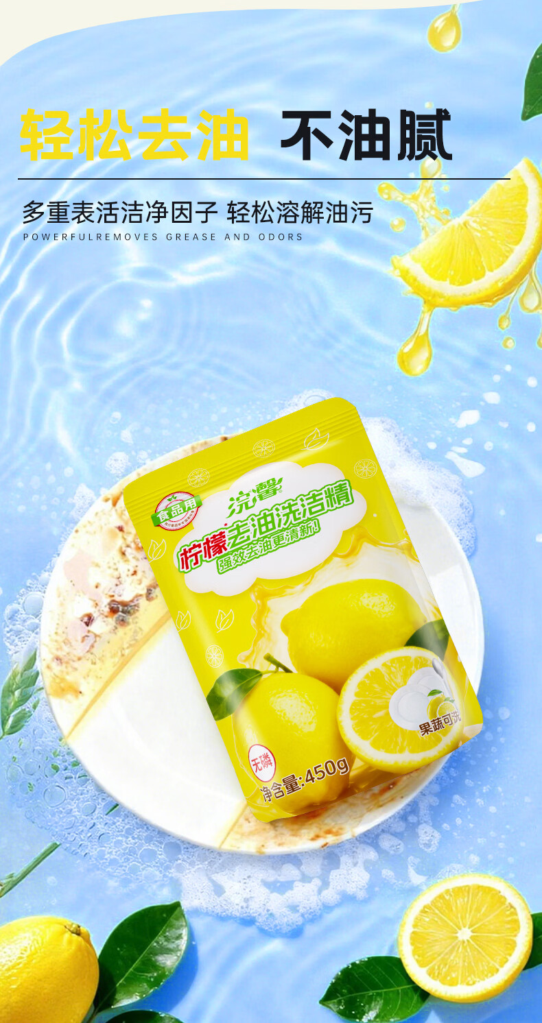 浣馨洗洁精柠檬草莓香快速去油清新祛味去重油污餐具家用洗涤剂 450g*1袋【柠檬清香】
