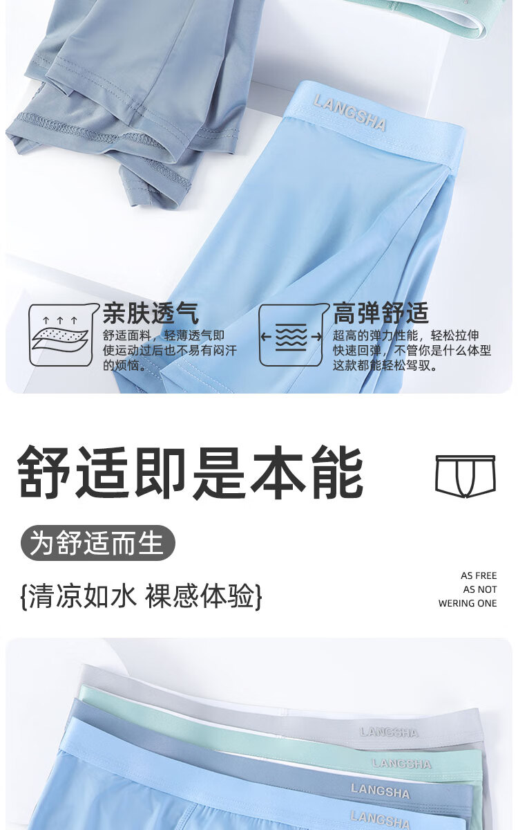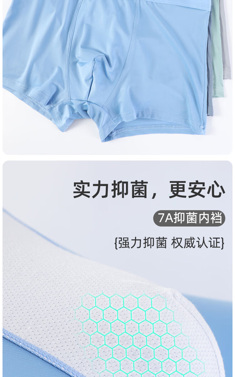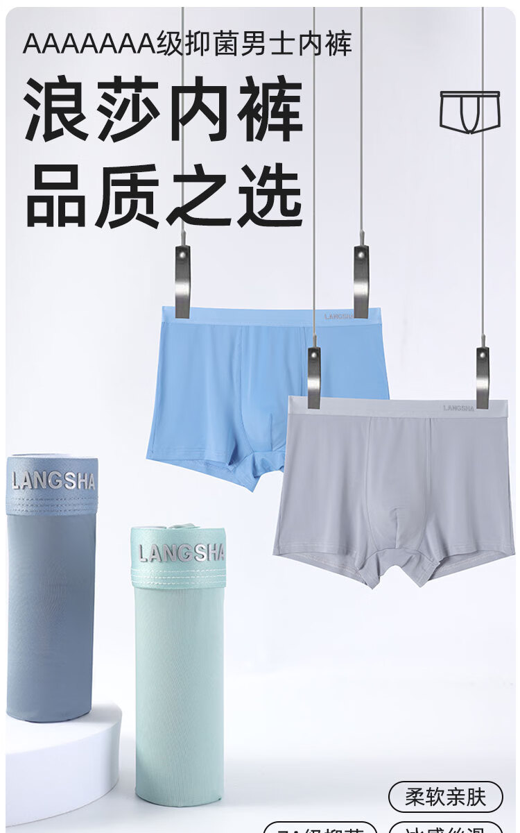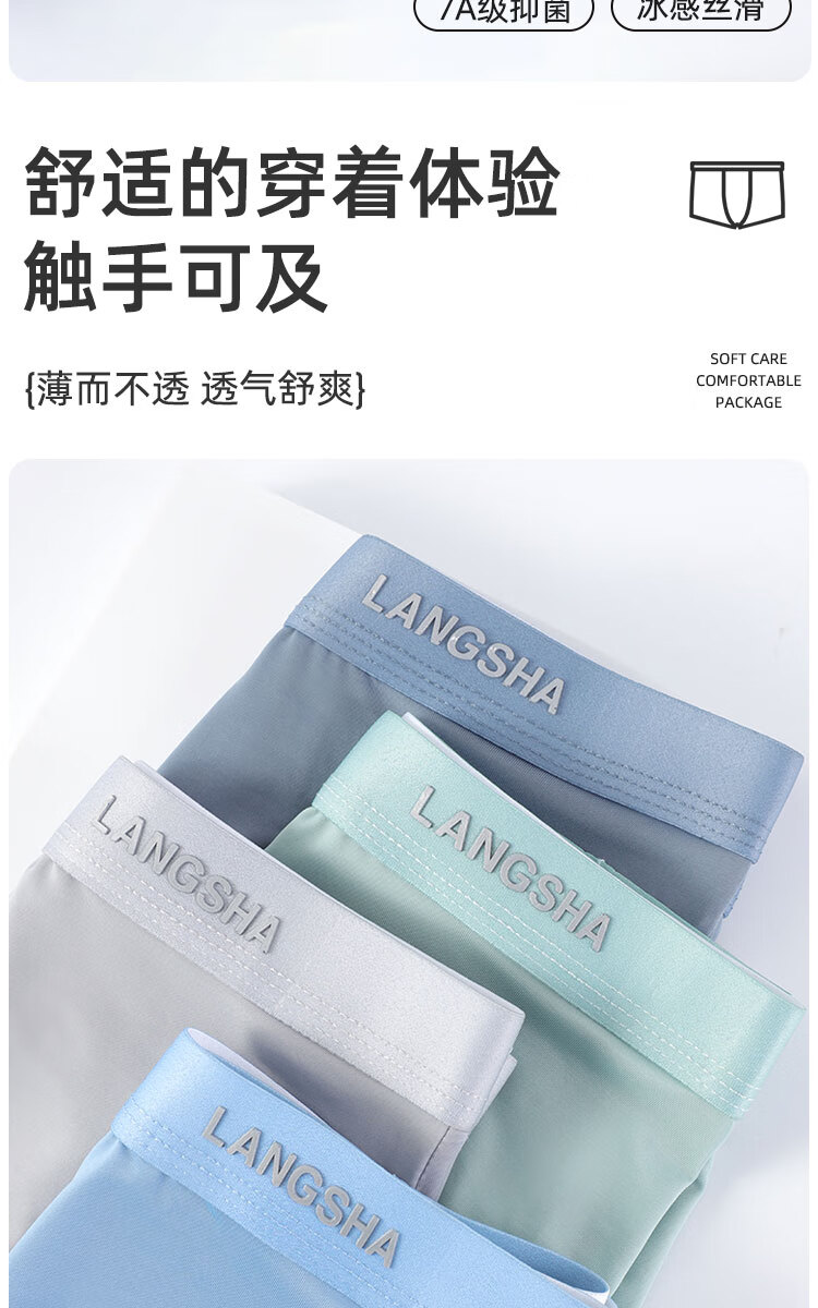 浪莎男士冰丝内裤7A级抑菌内裆无痕透气夏季薄款四角裤青少年平角裤衩 冰丝抑菌-绵软舒适 L (90-110斤)