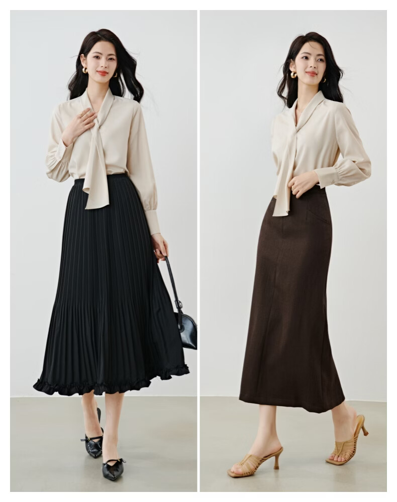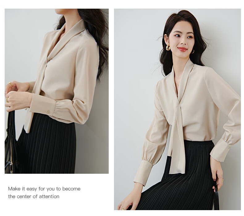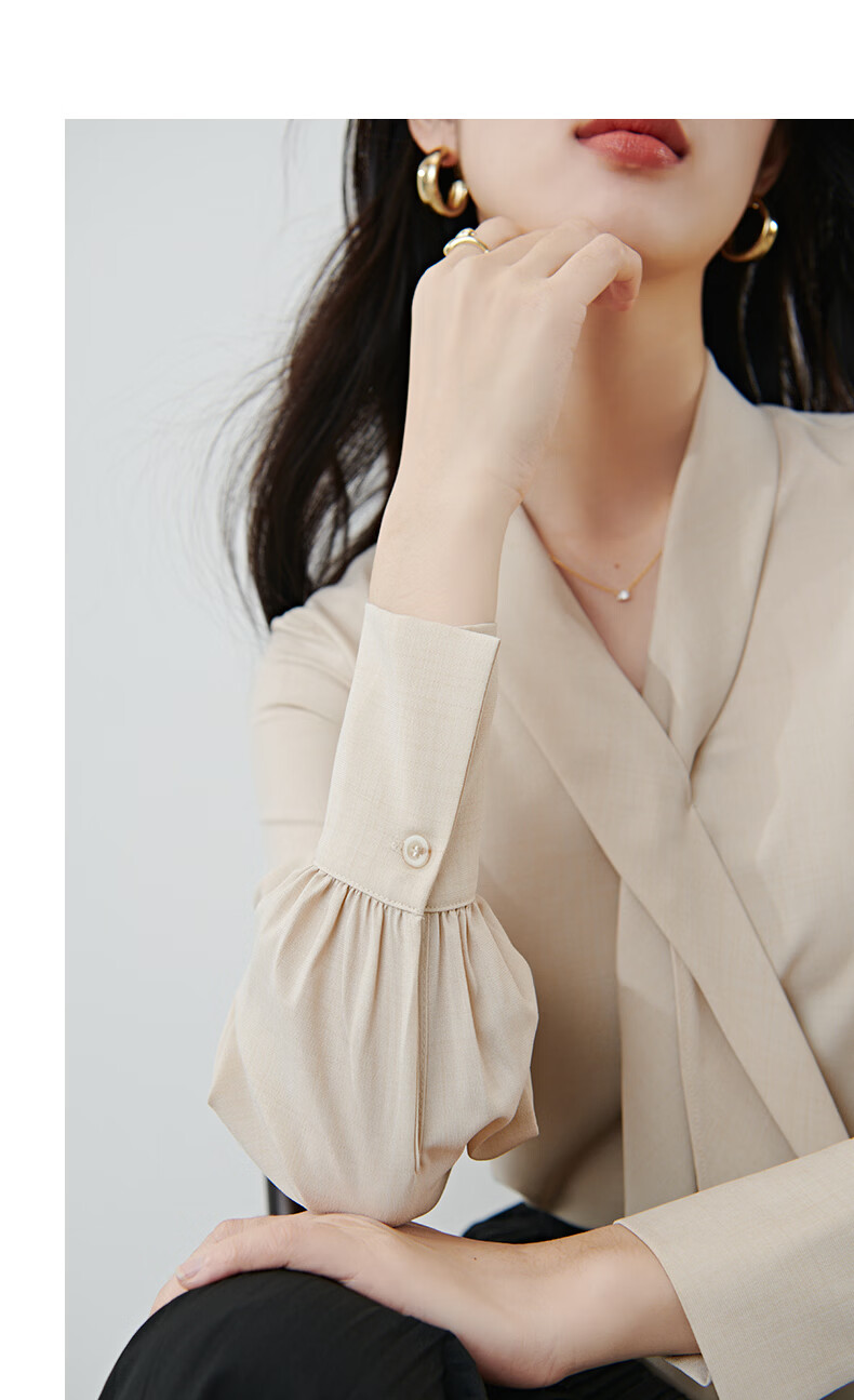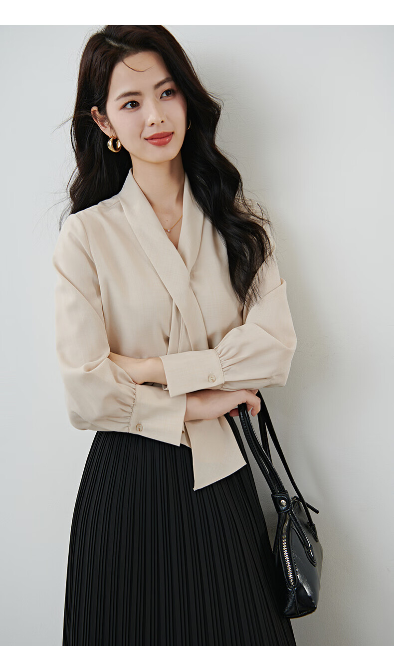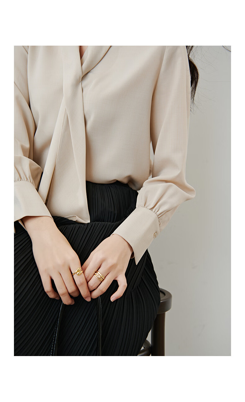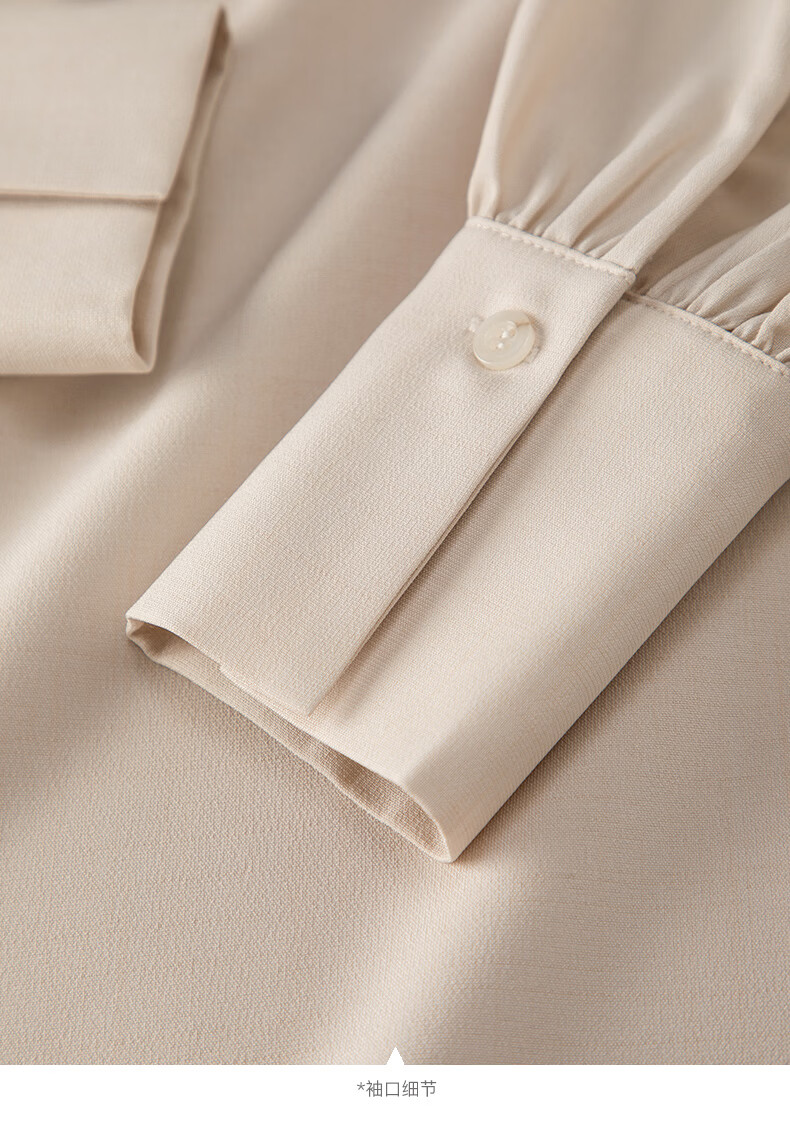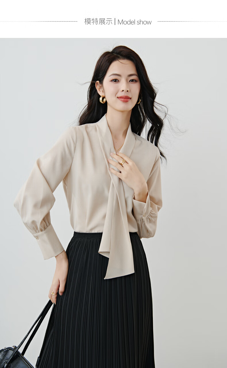 晚白【新品】2026年春款时尚飘带系带领职业装垂感上衣职场通勤衬衫女 浅卡其 S