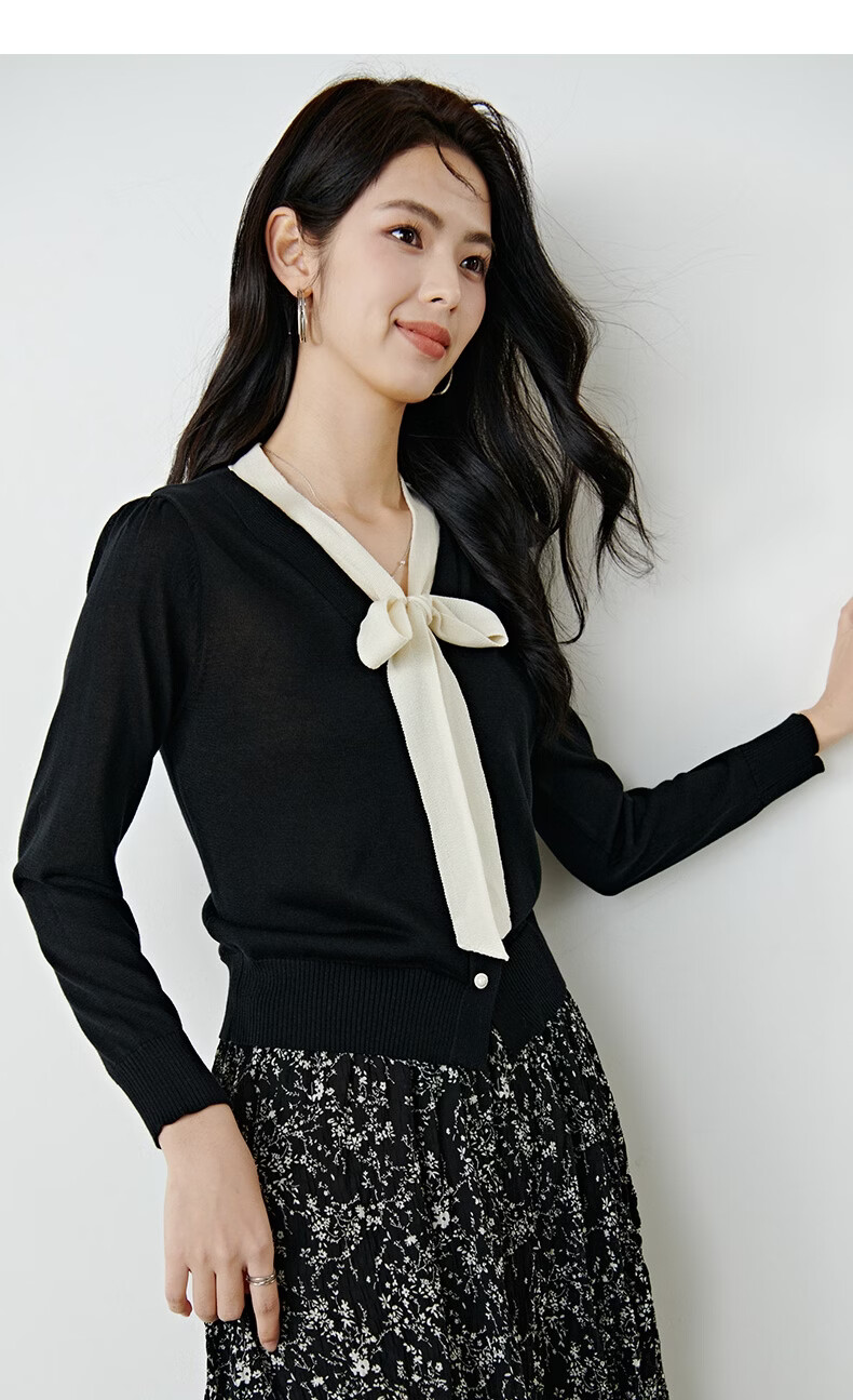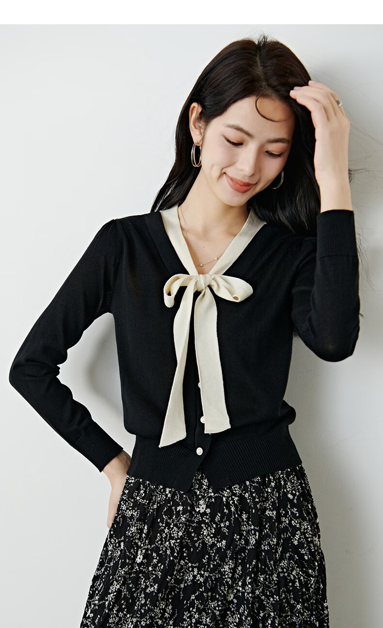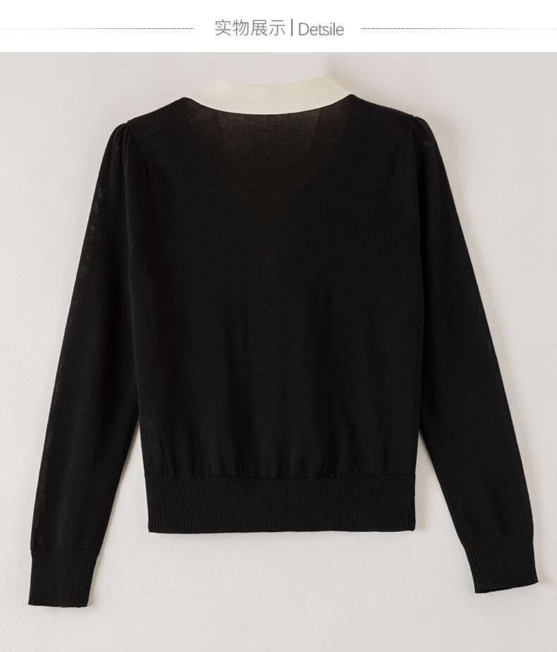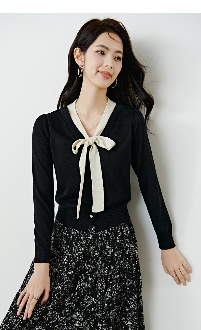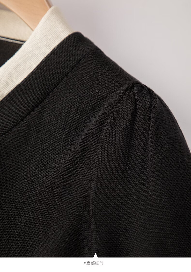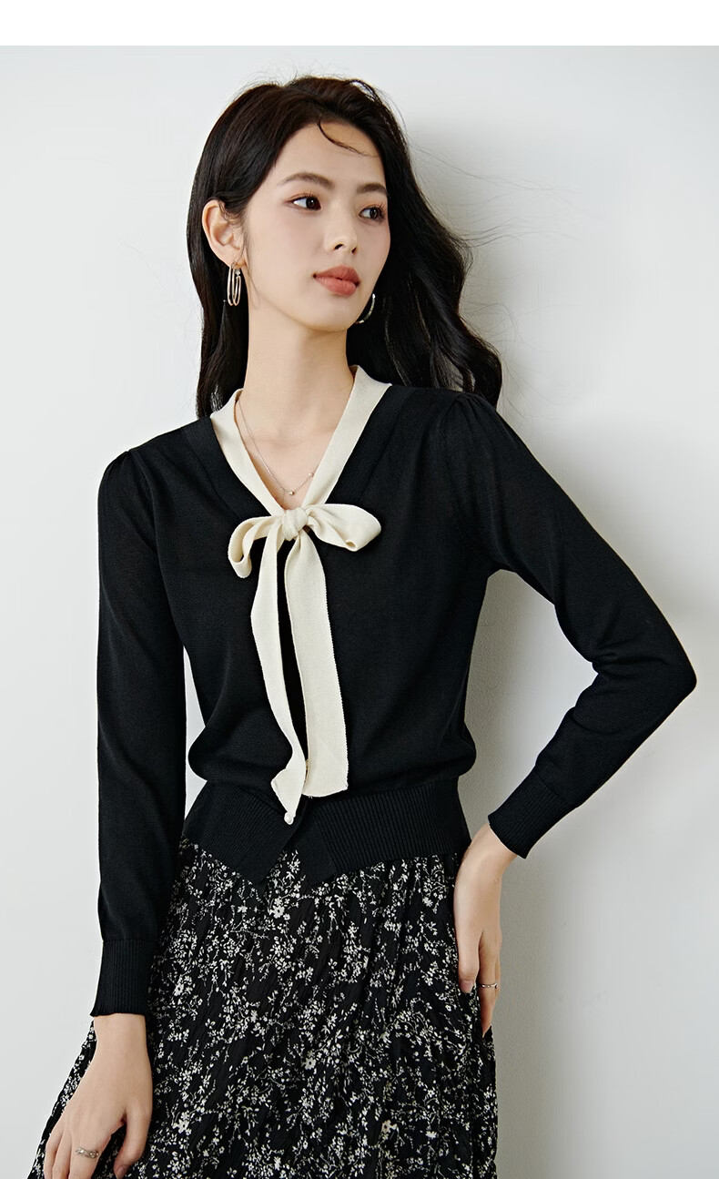 晚白【新品】2026年春款经典撞色V领毛衣莱赛尔亲肤透气舒适针织衫女 黑色 L