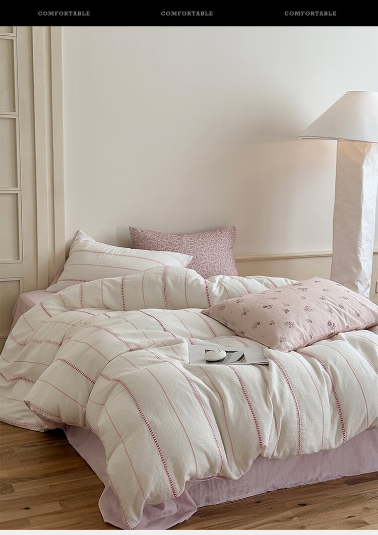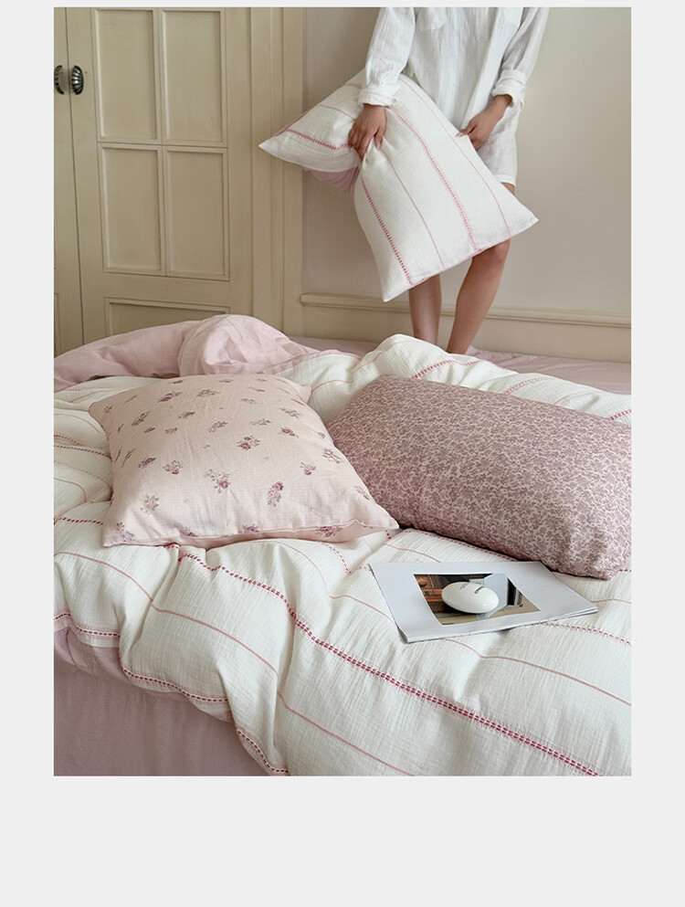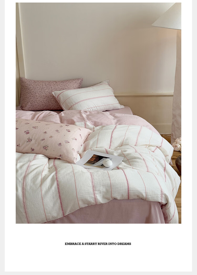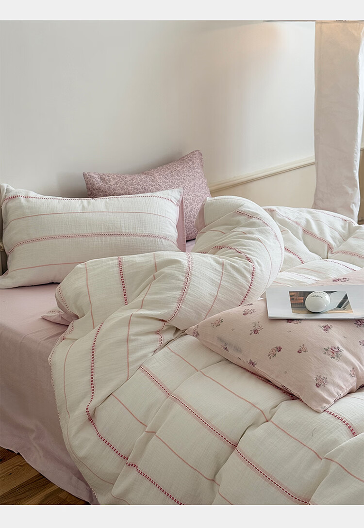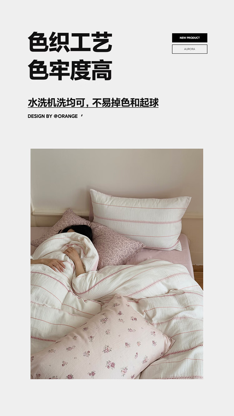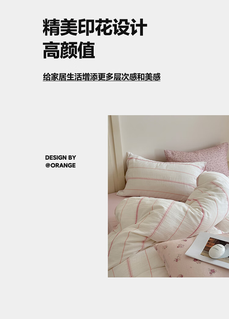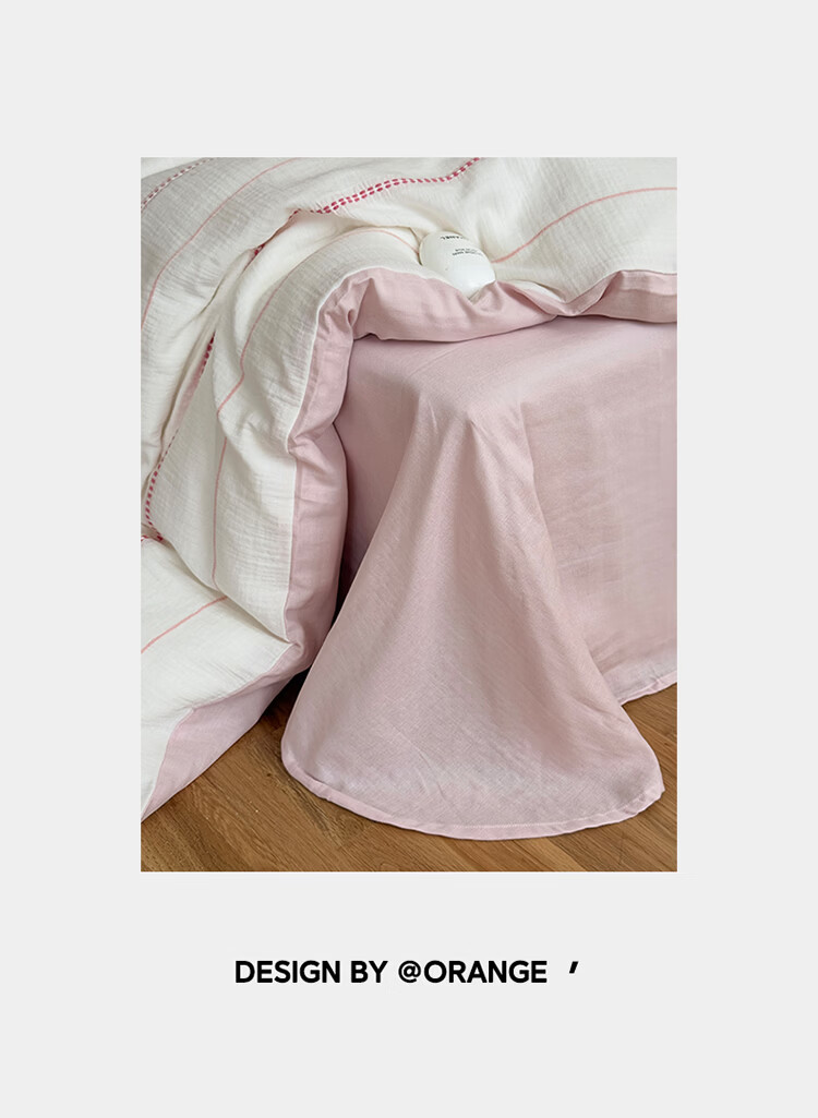 ROLAND LIVE简约风精梳棉色织双层纱四件套亲肤裸睡1.8米床被套床单床上用品 YB 色织双层纱四件套-青岚粉芭乐 1.8米床 床单款 【被套200*230cm】