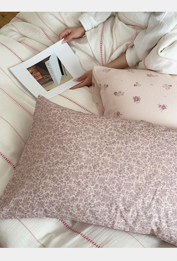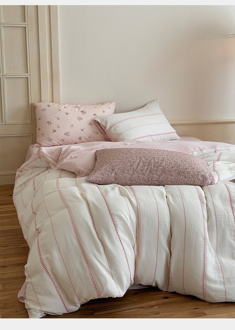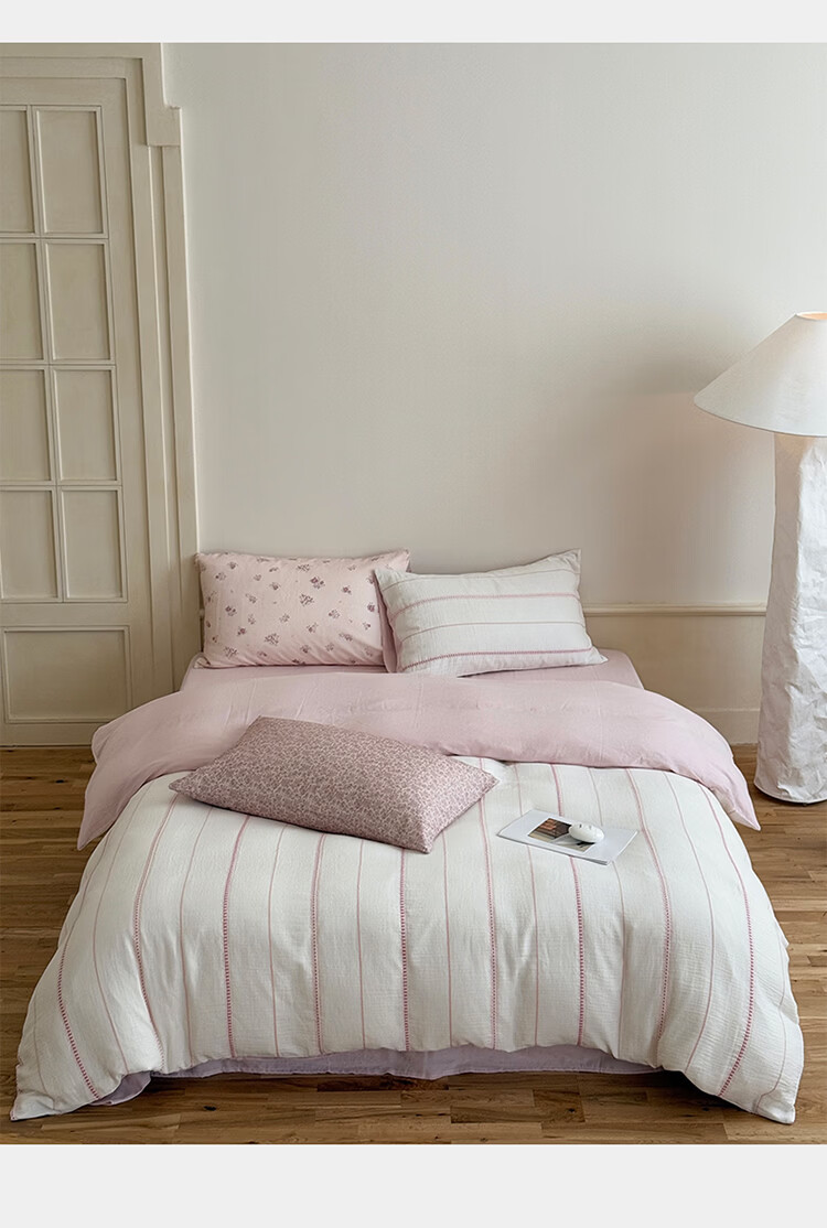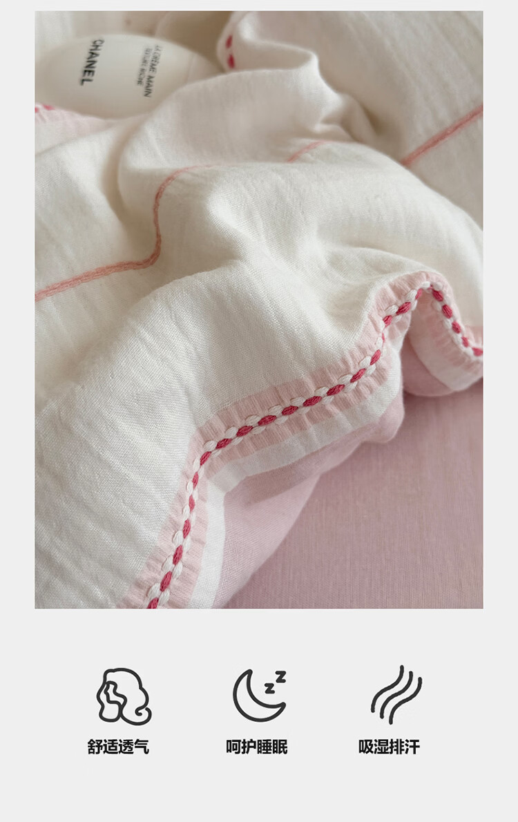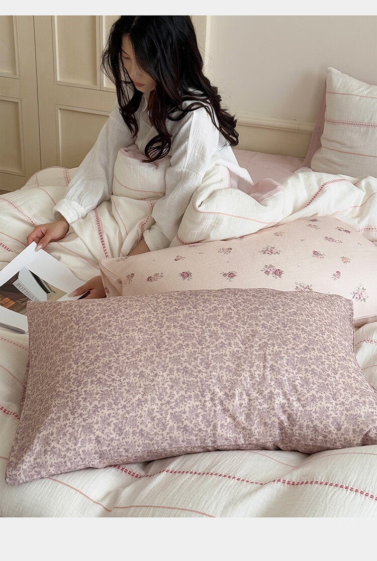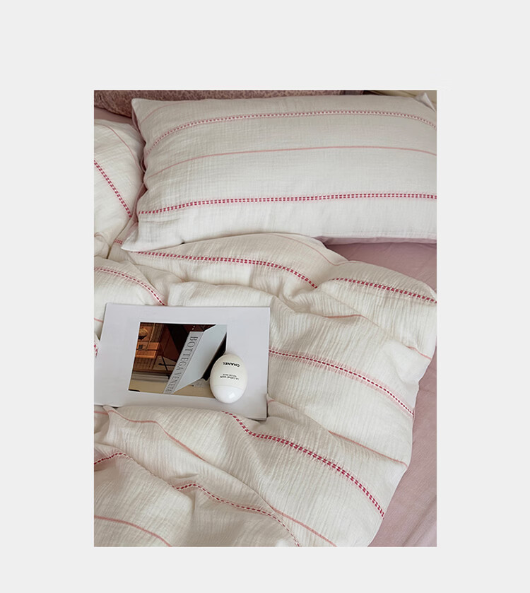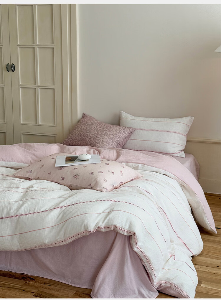 ROLAND LIVE简约风精梳棉色织双层纱四件套亲肤裸睡1.8米床被套床单床上用品 YB 色织双层纱四件套-青岚粉芭乐 1.8米床 床单款 【被套200*230cm】