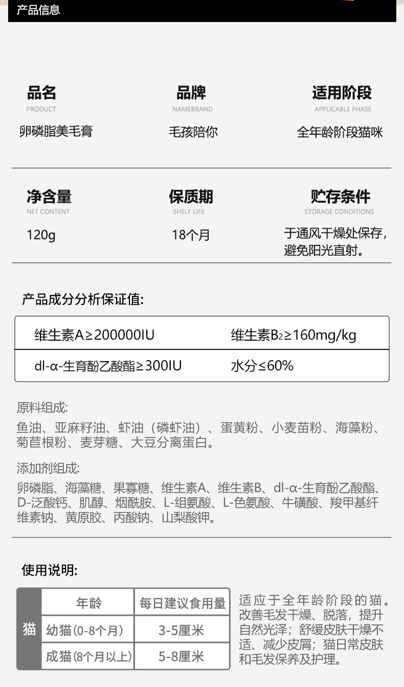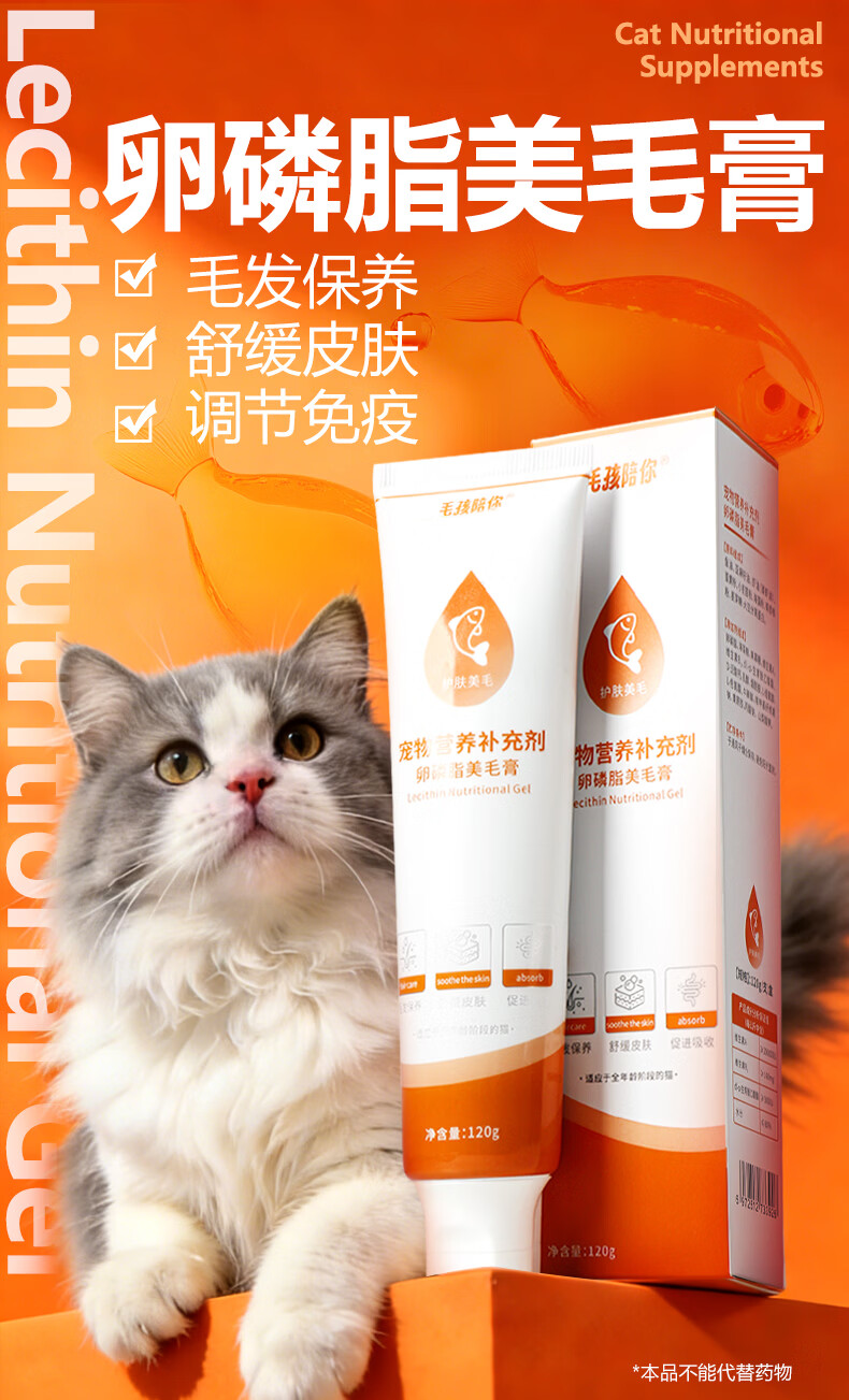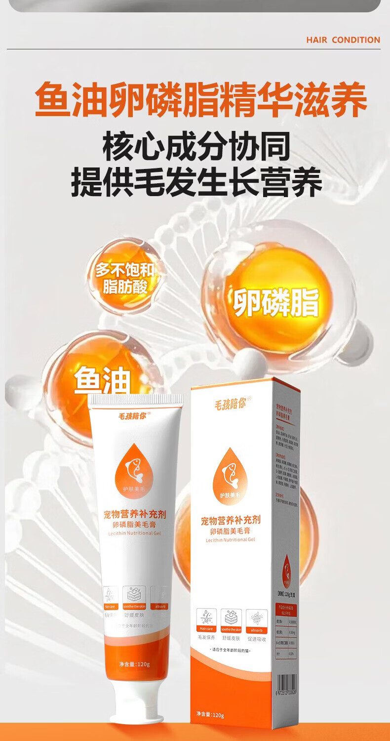 毛孩陪你鱼油猫咪卵磷脂美毛膏磷虾油全阶段猫咪美毛护肤宠物营养补充剂 美毛膏120g 120g*1支