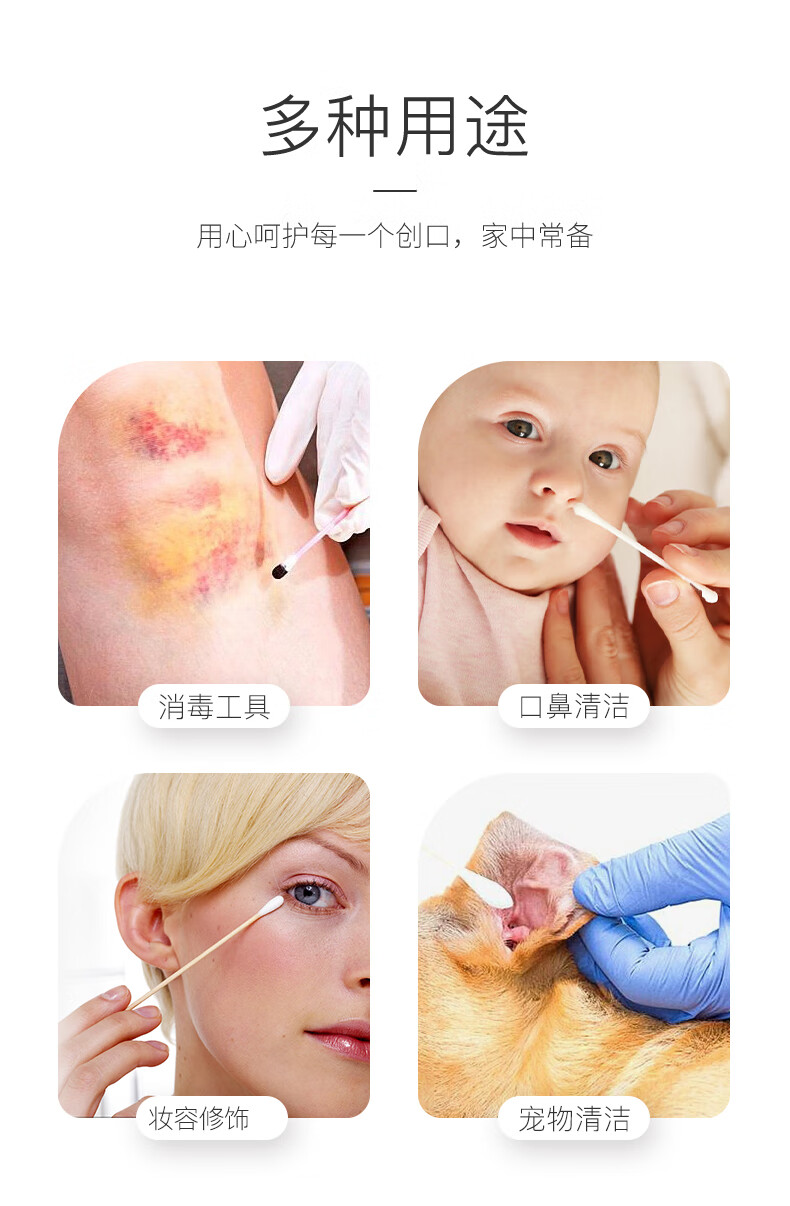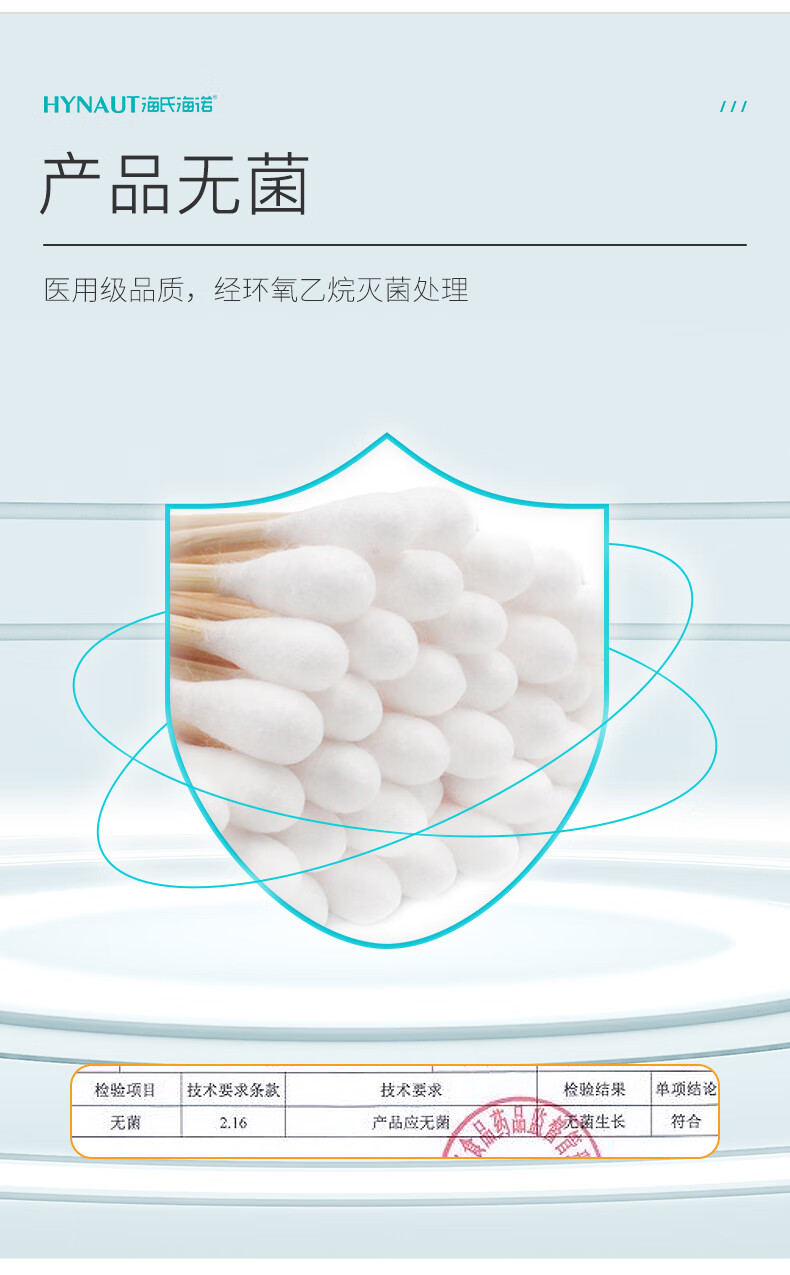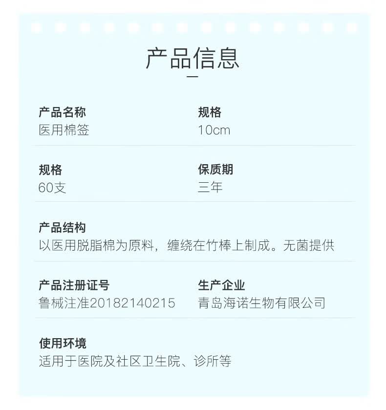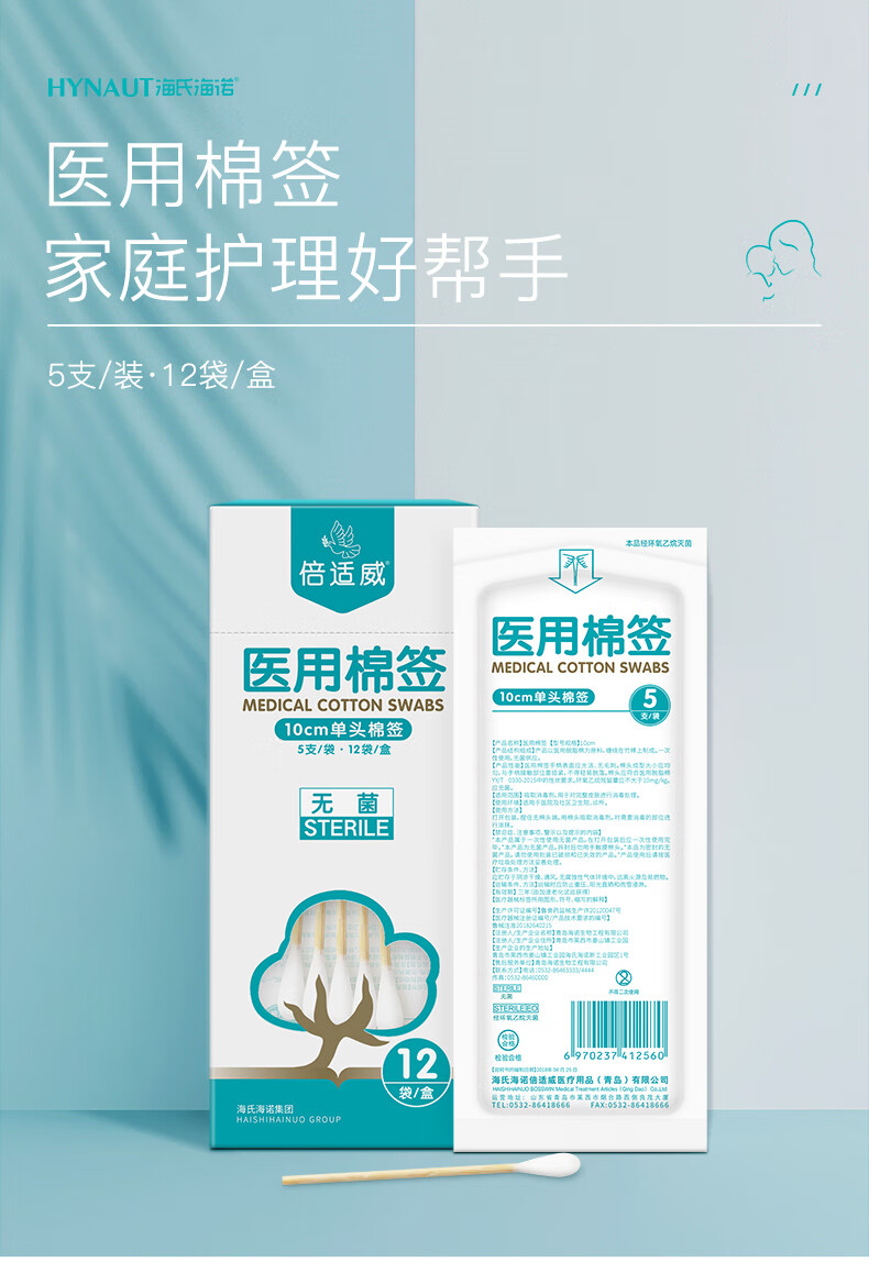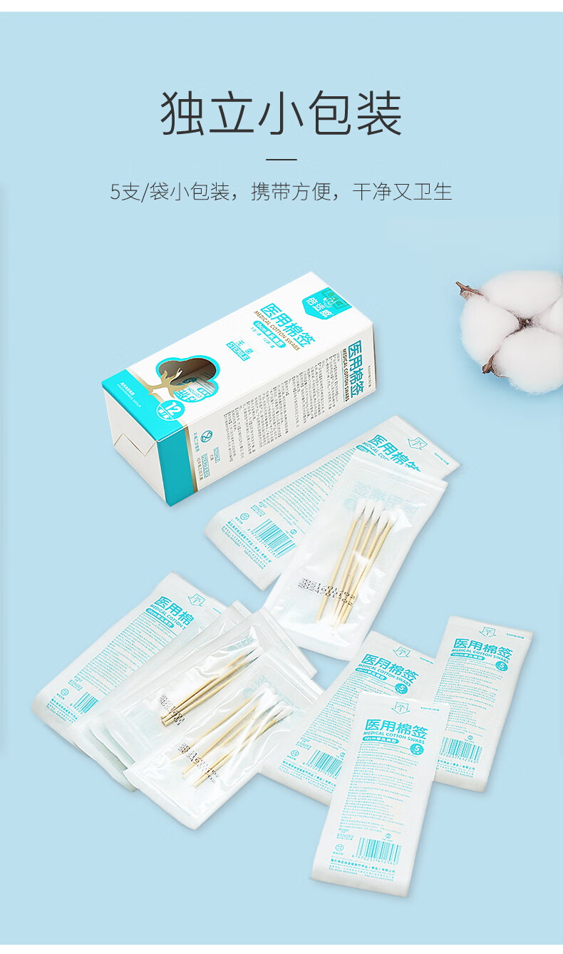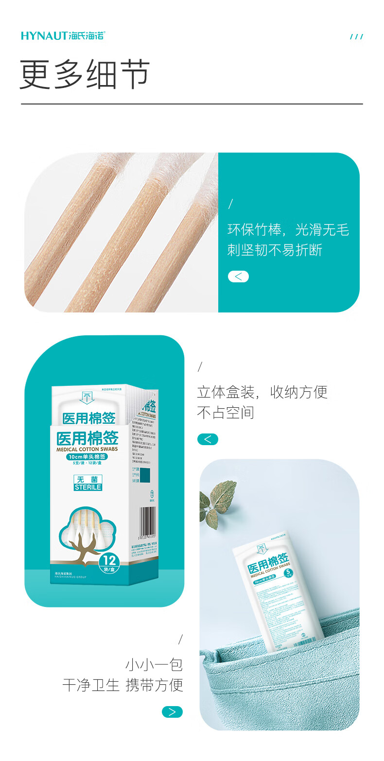 海氏海诺医用棉签 无菌消毒棉签棒10cm60支 小袋便携装单头竹棒独立小包装