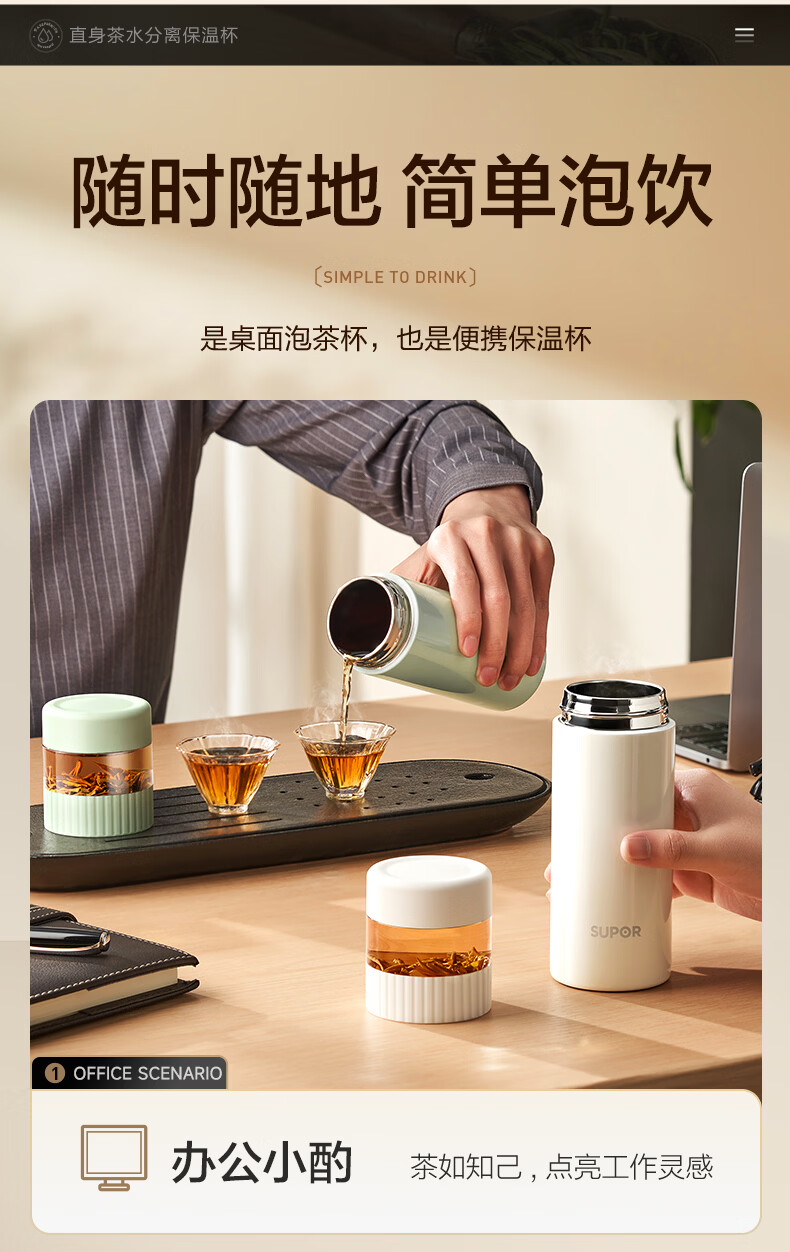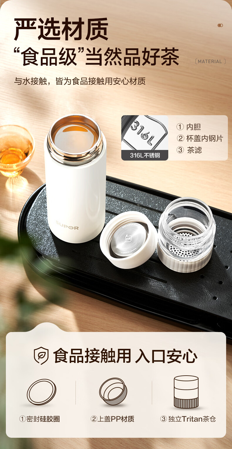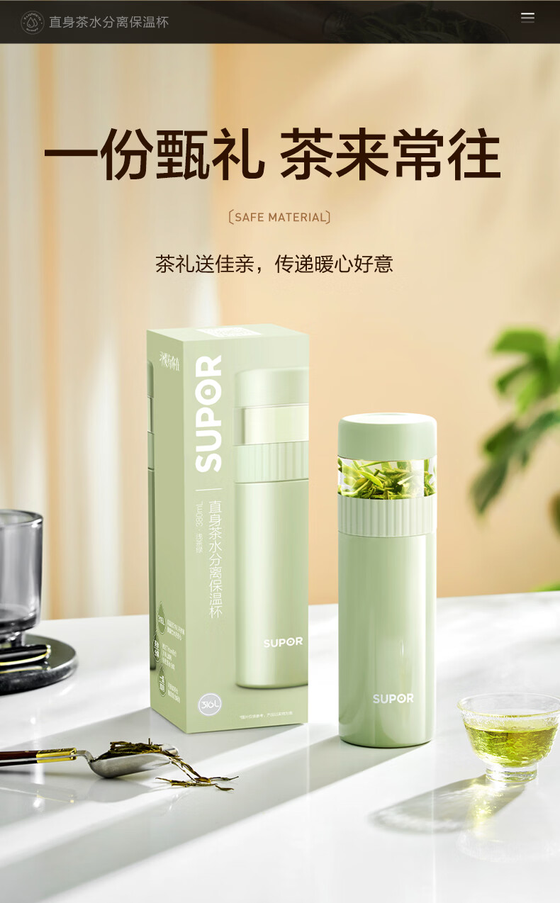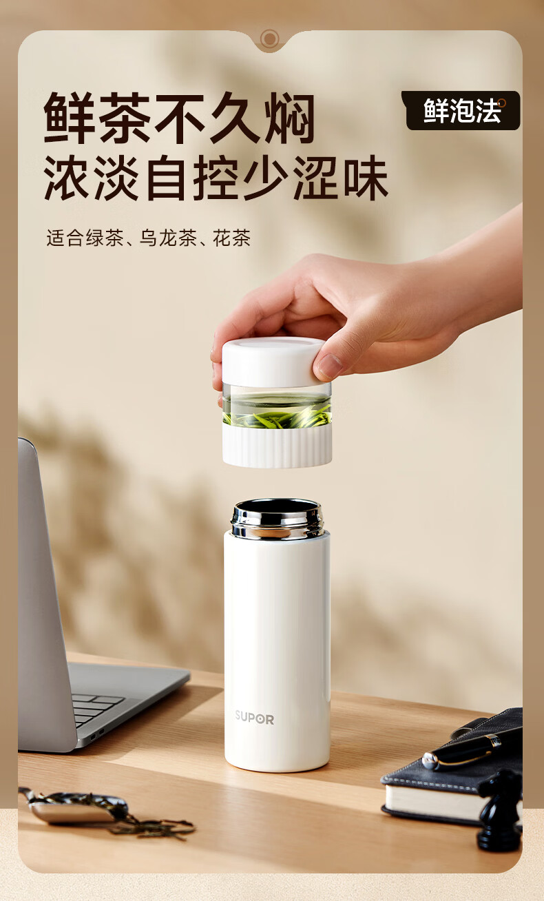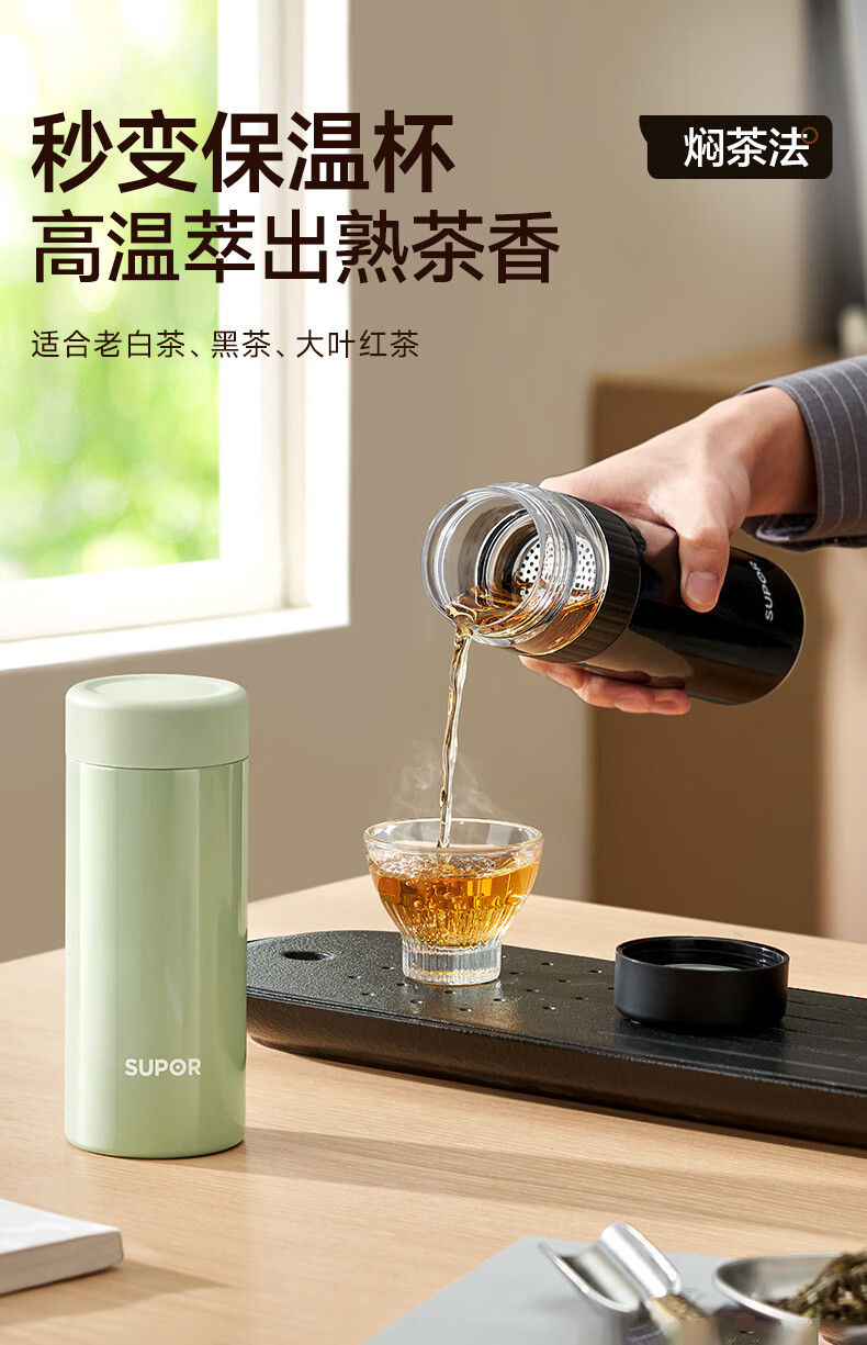苏泊尔(SUPOR)高档保温杯男女茶水分离泡茶杯316L不锈钢车载便携水杯教师节礼物 浅茶绿【380ml杯身+89ml茶仓】