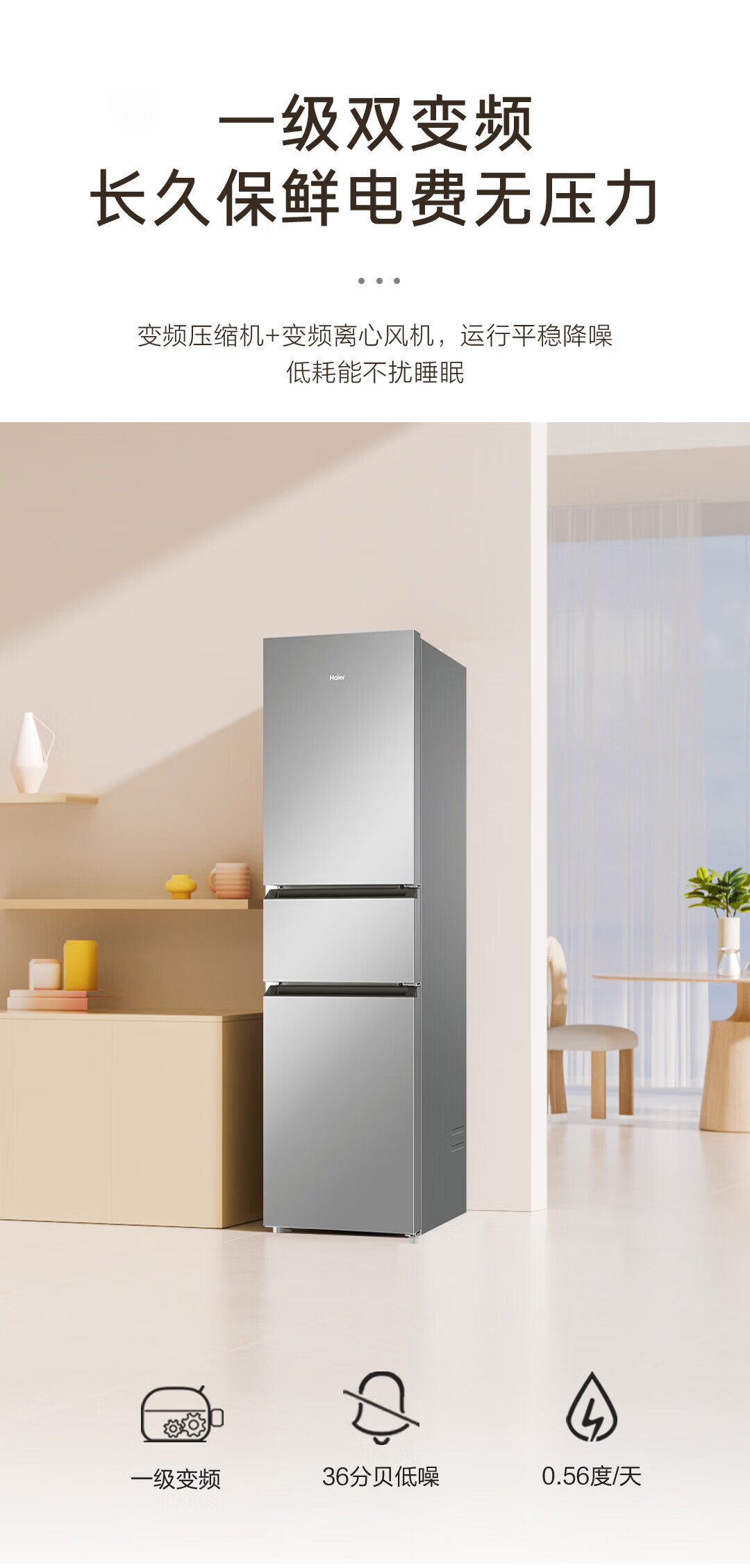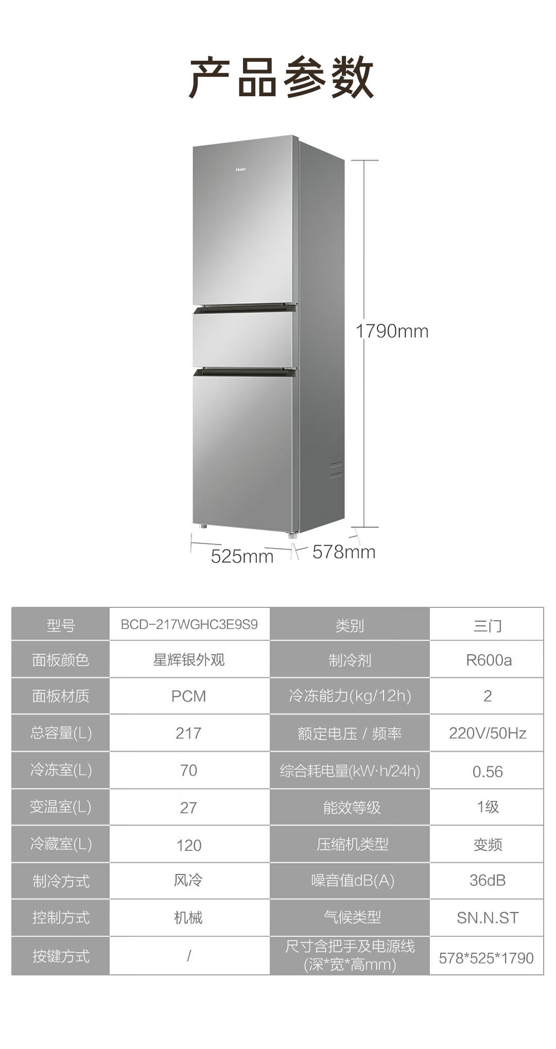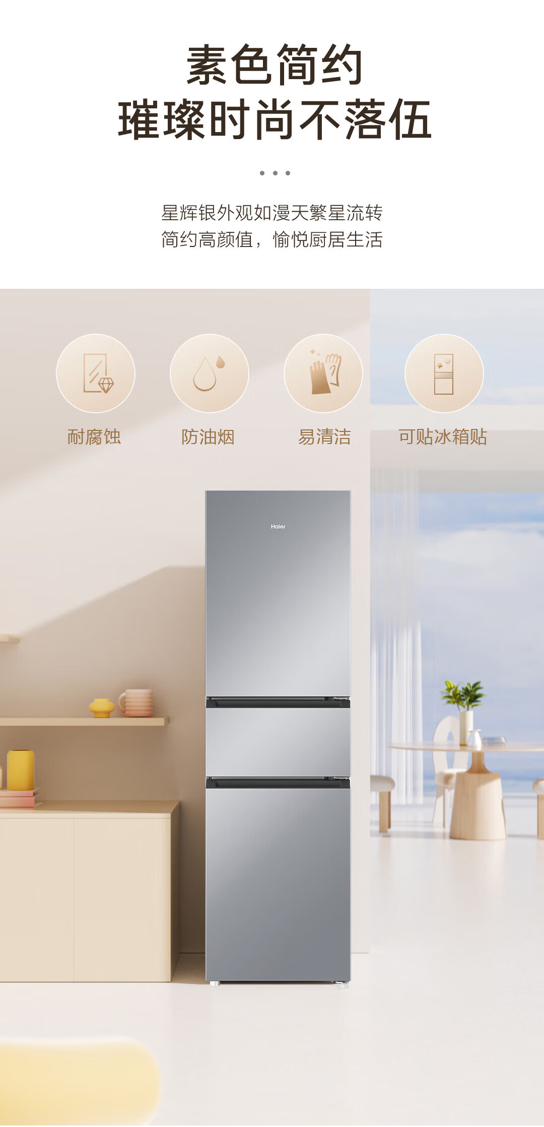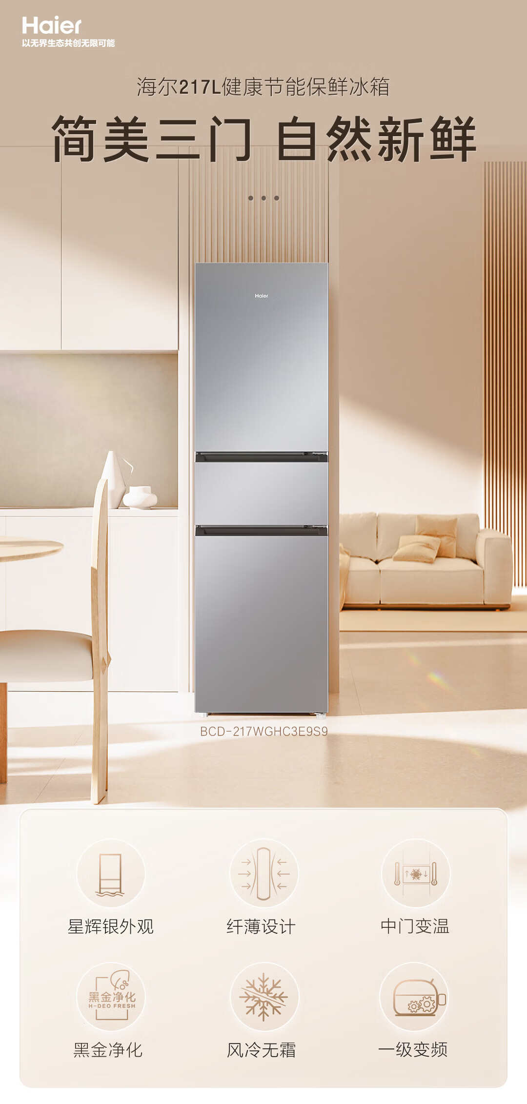 海尔冰箱217升三门家用小户型冰箱风冷无霜黑金净化一级能效星辉银家用电冰箱BCD-217WGHC3E9S9 217L三门-灰|一级|风冷无霜|除菌