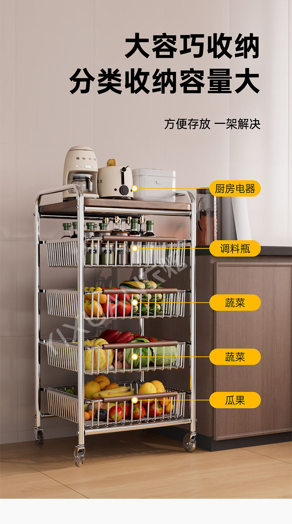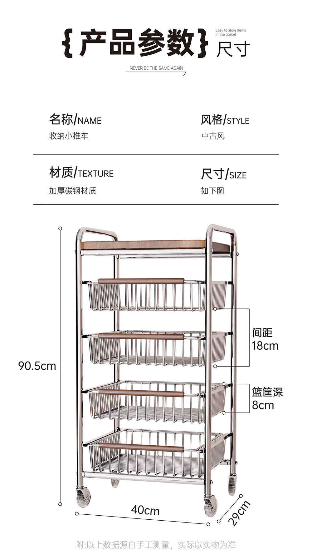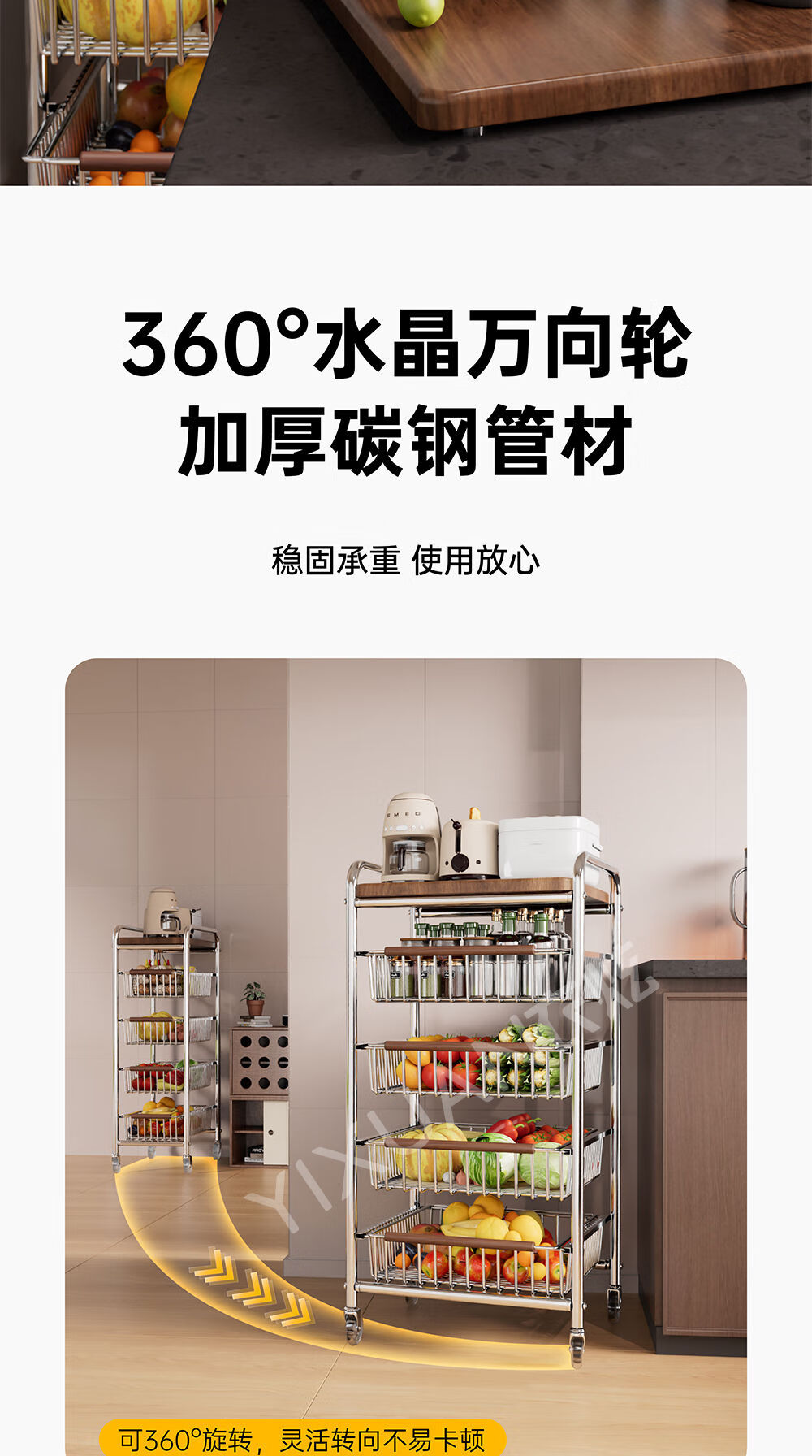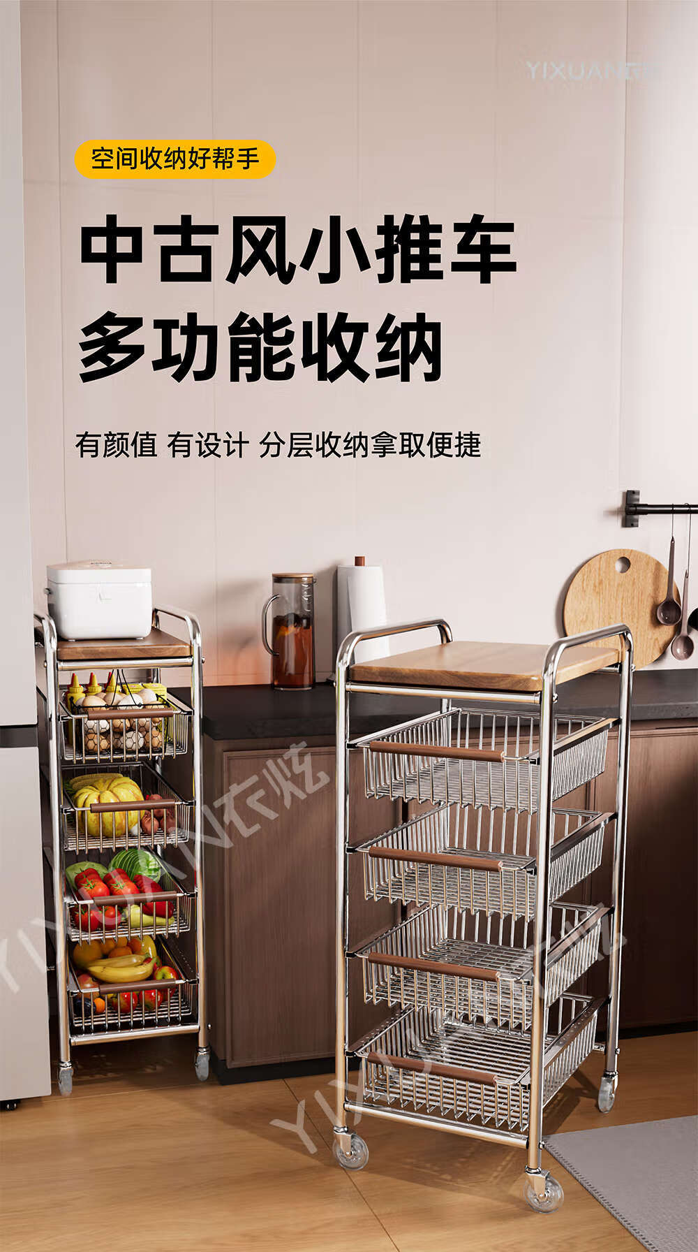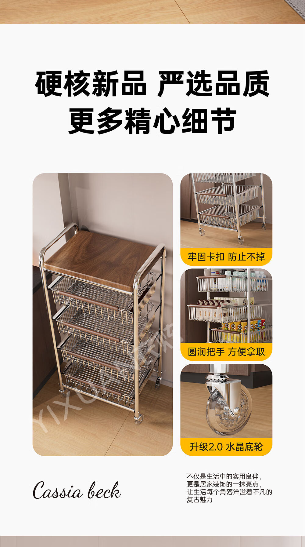 咏幻中古风厨房置物架小推车多功能夹缝多层果蔬菜篮零食可移动收纳架 加宽款 四层黑岩轮