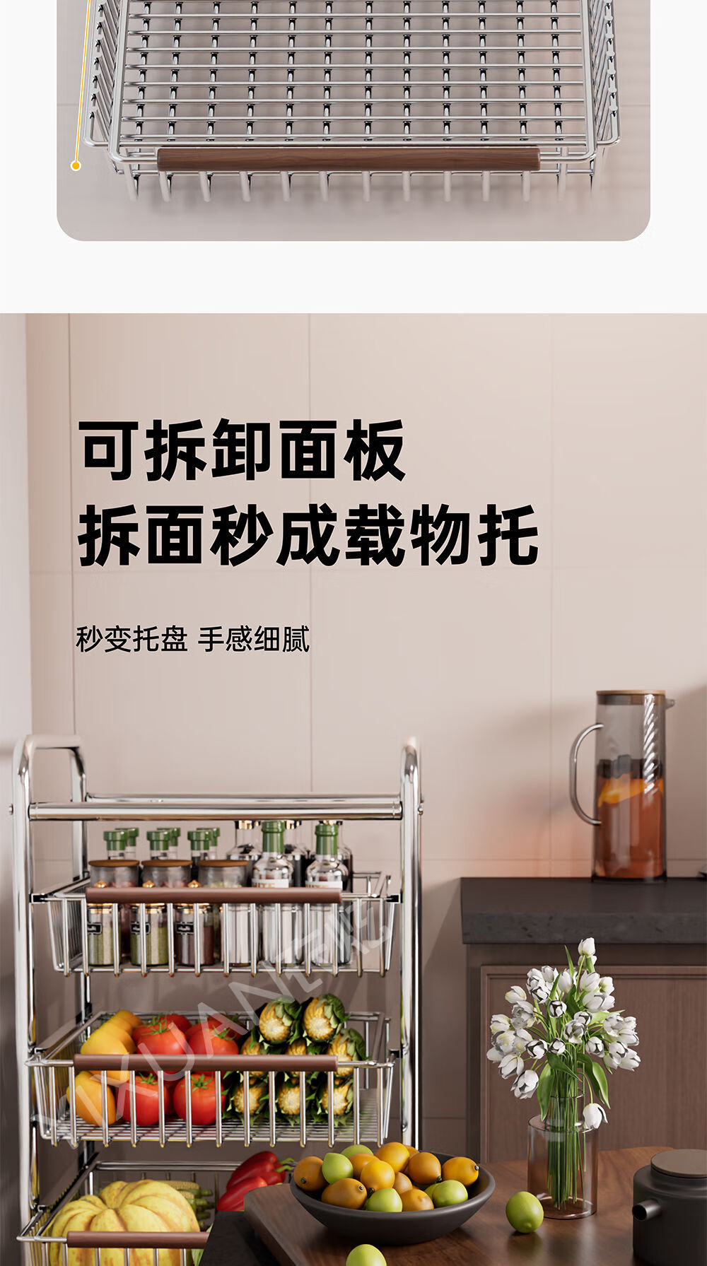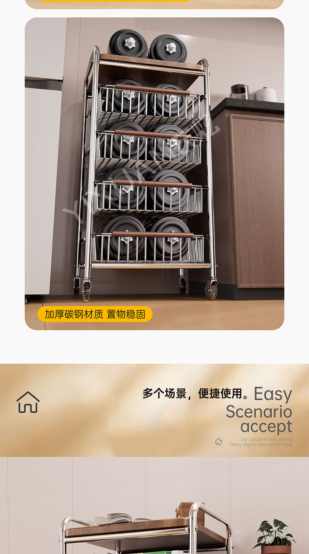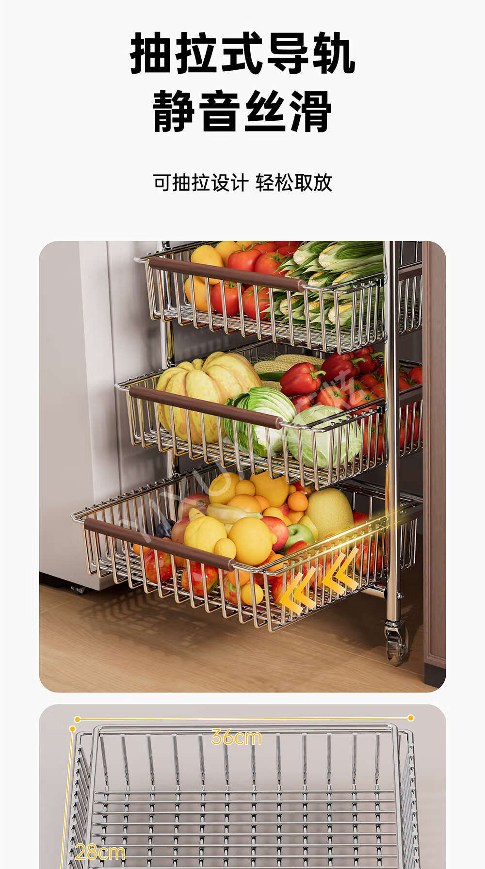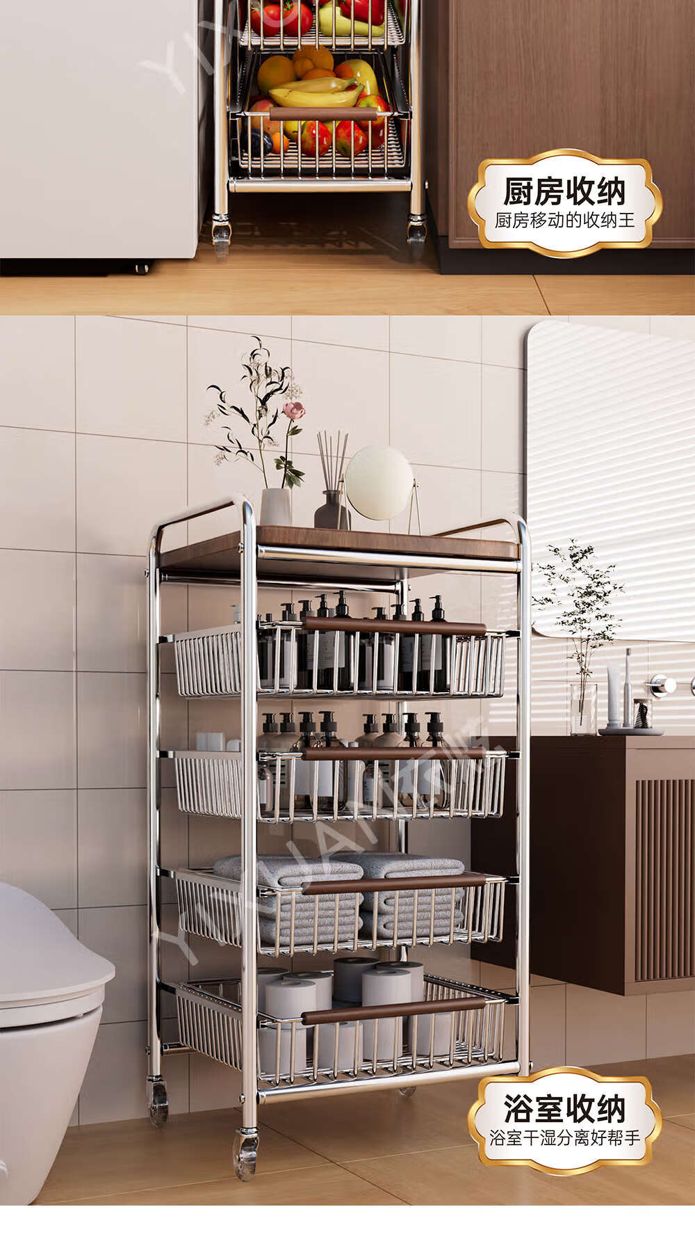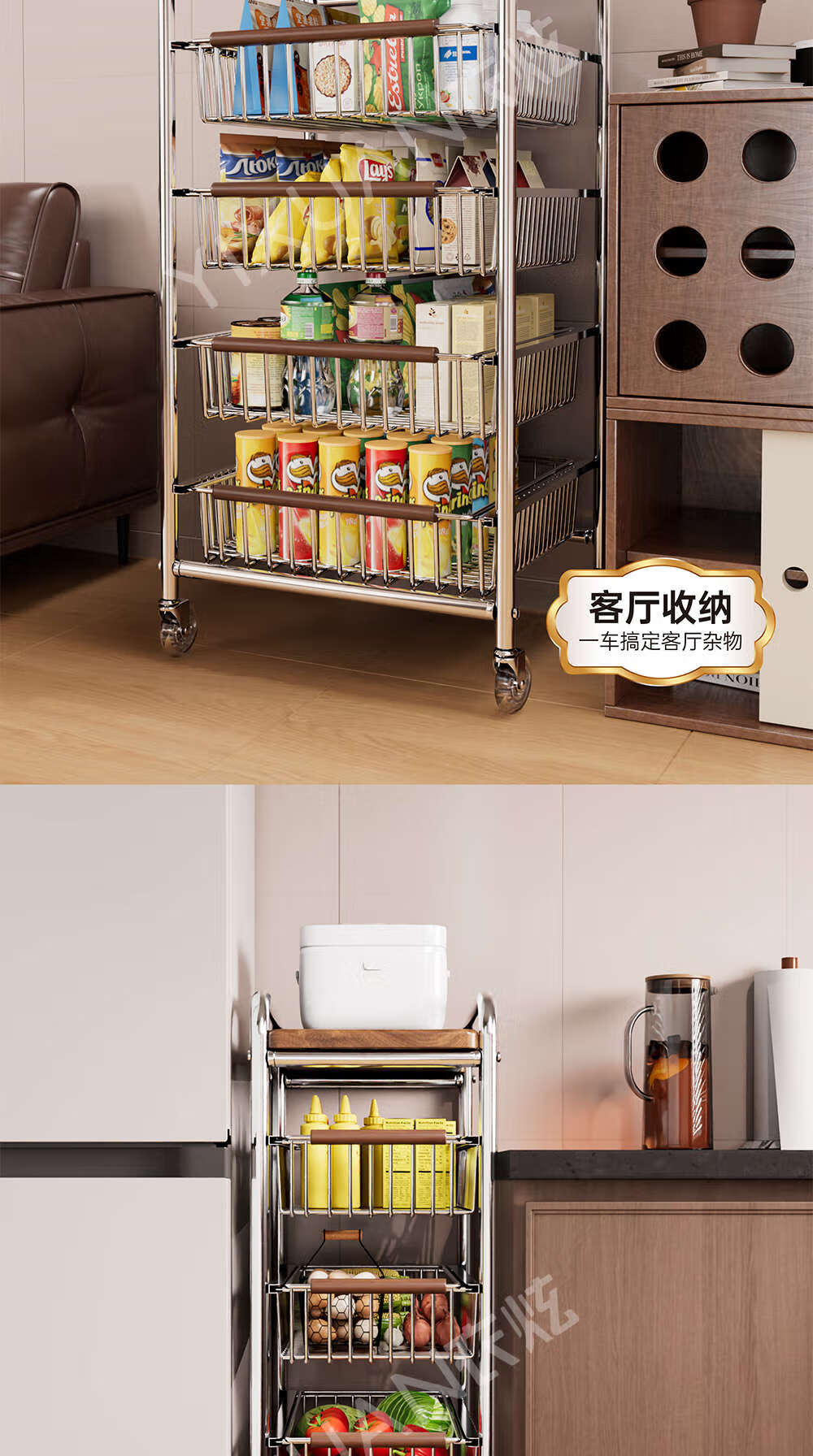 咏幻中古风厨房置物架小推车多功能夹缝多层果蔬菜篮零食可移动收纳架 加宽款 四层黑岩轮