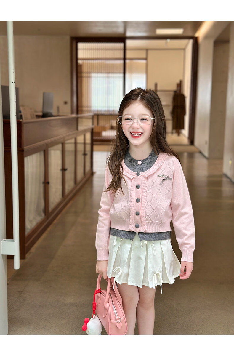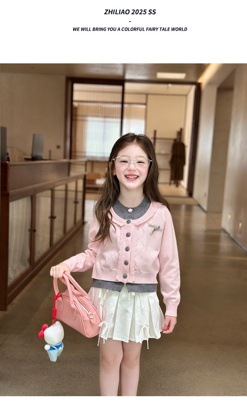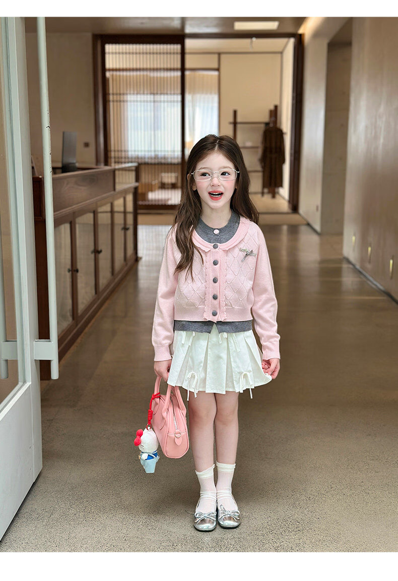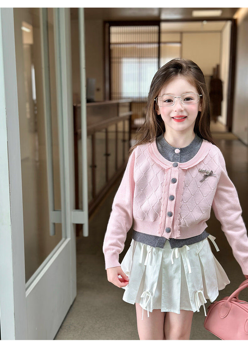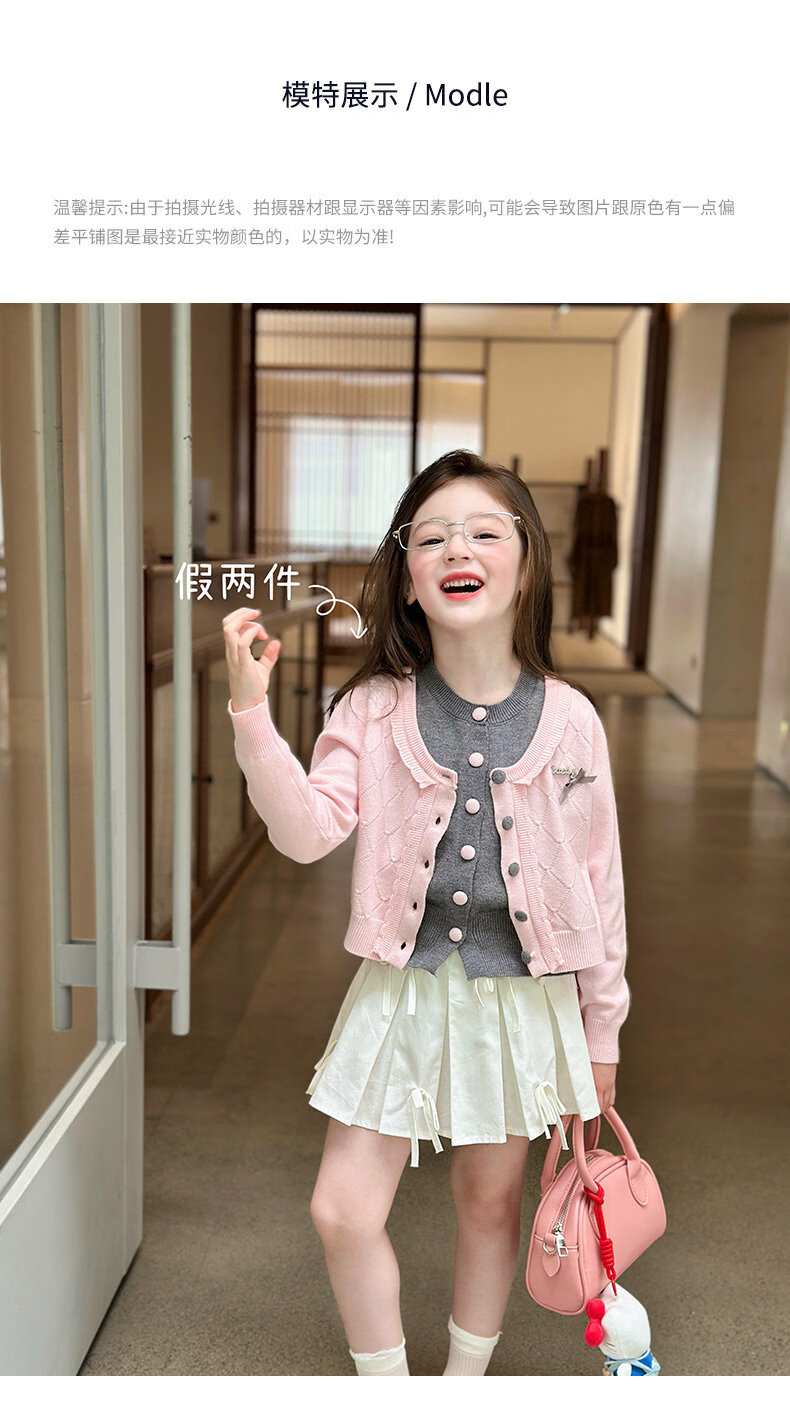栀了成长记女童装甜美学院风毛衣2026春季儿童可爱假两件撞色开衫 粉色 上衣 120 cm