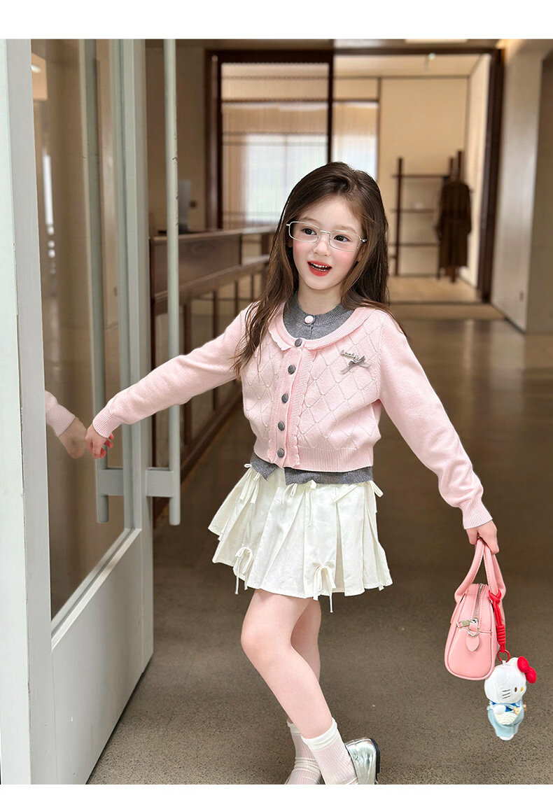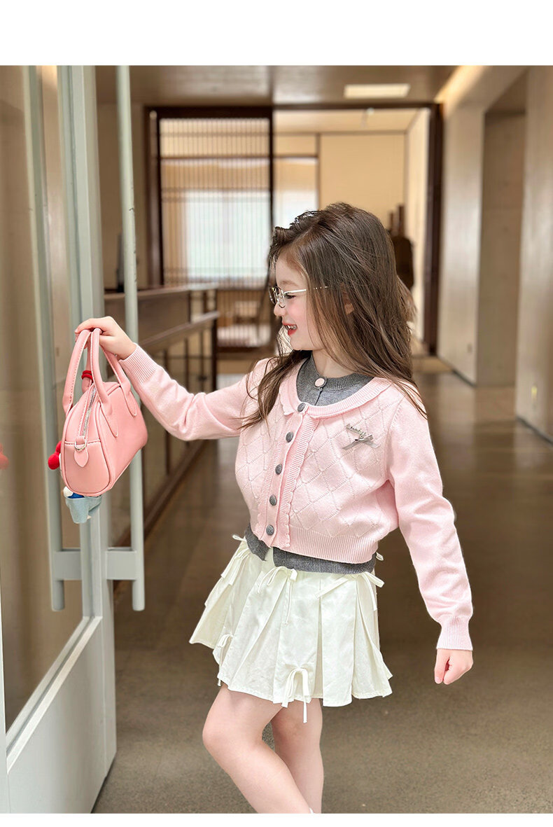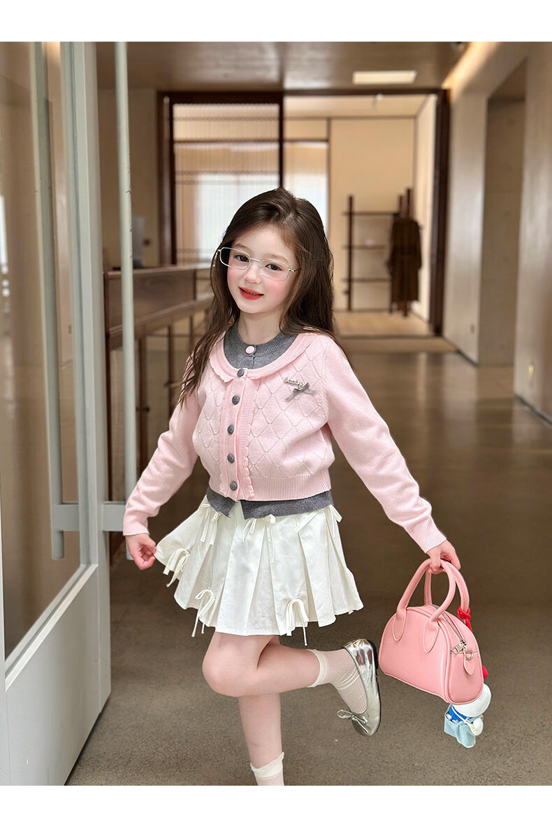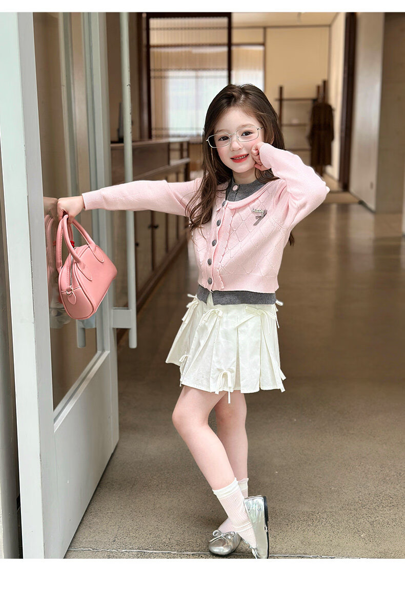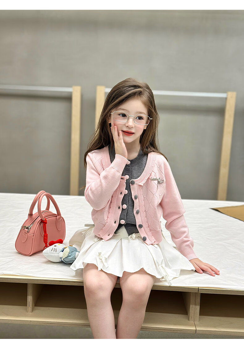 栀了成长记女童装甜美学院风毛衣2026春季儿童可爱假两件撞色开衫 粉色 上衣 120 cm