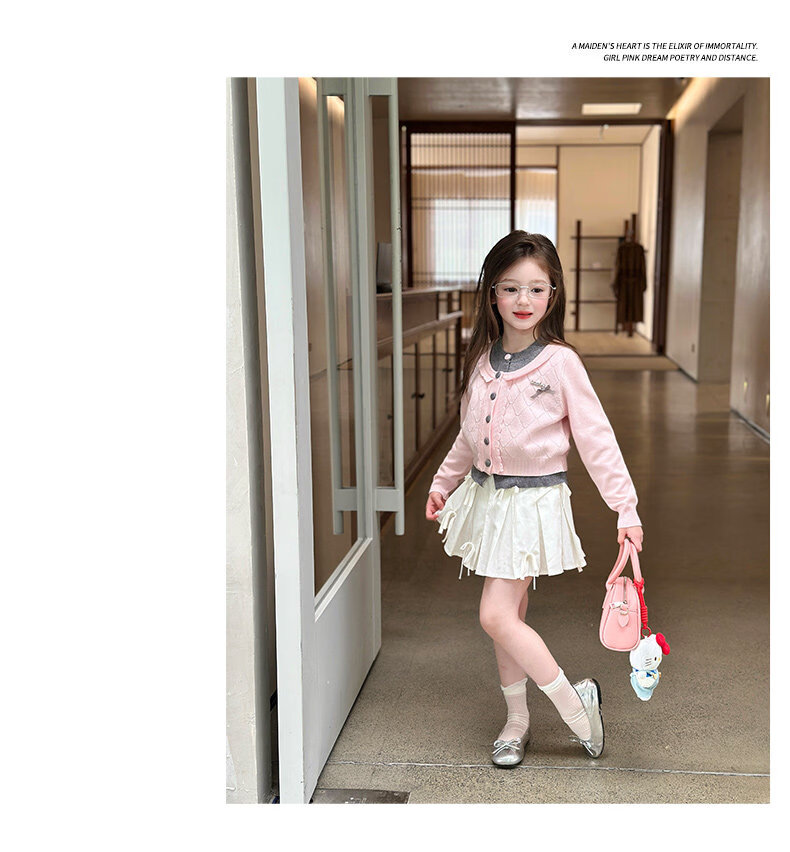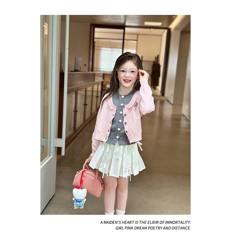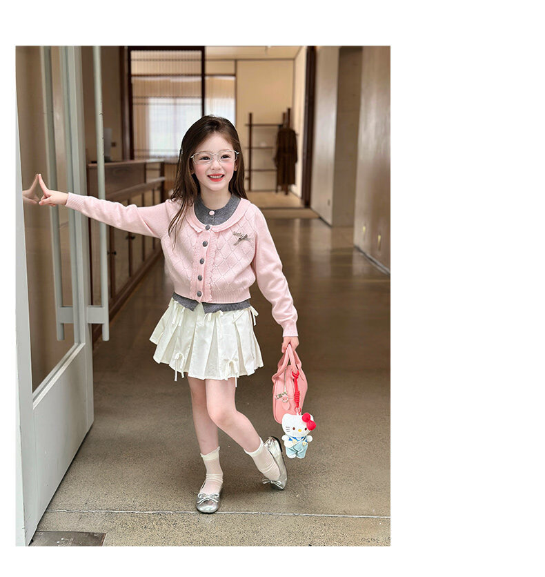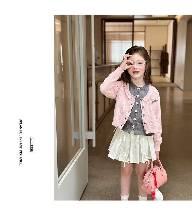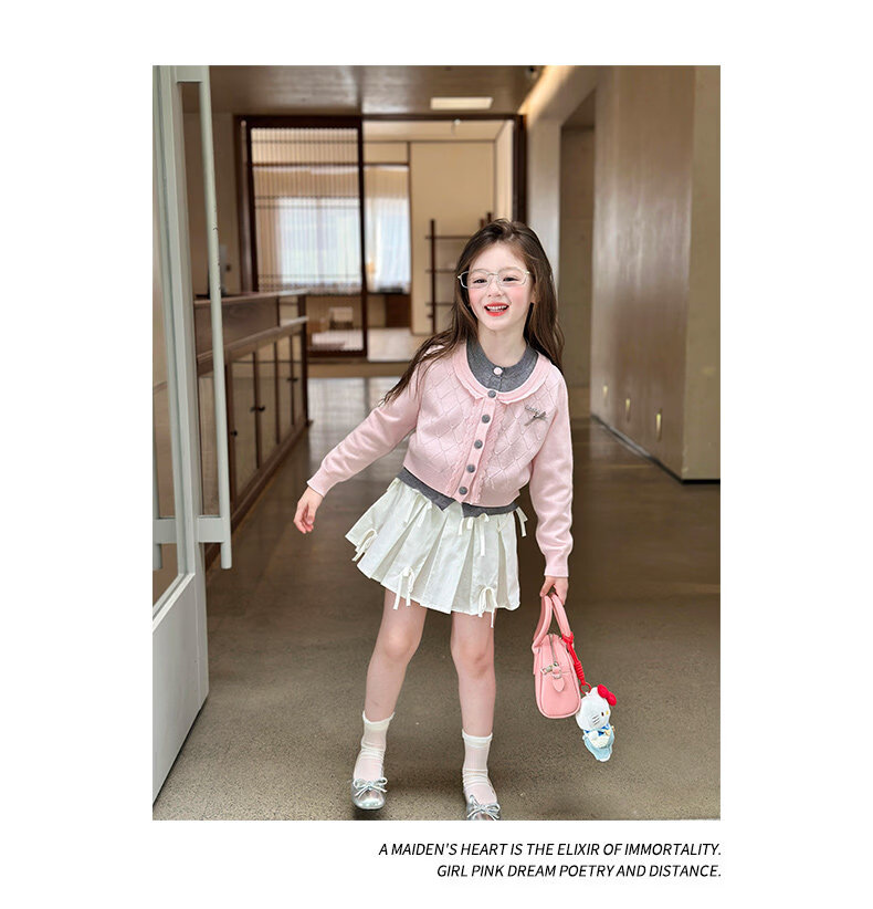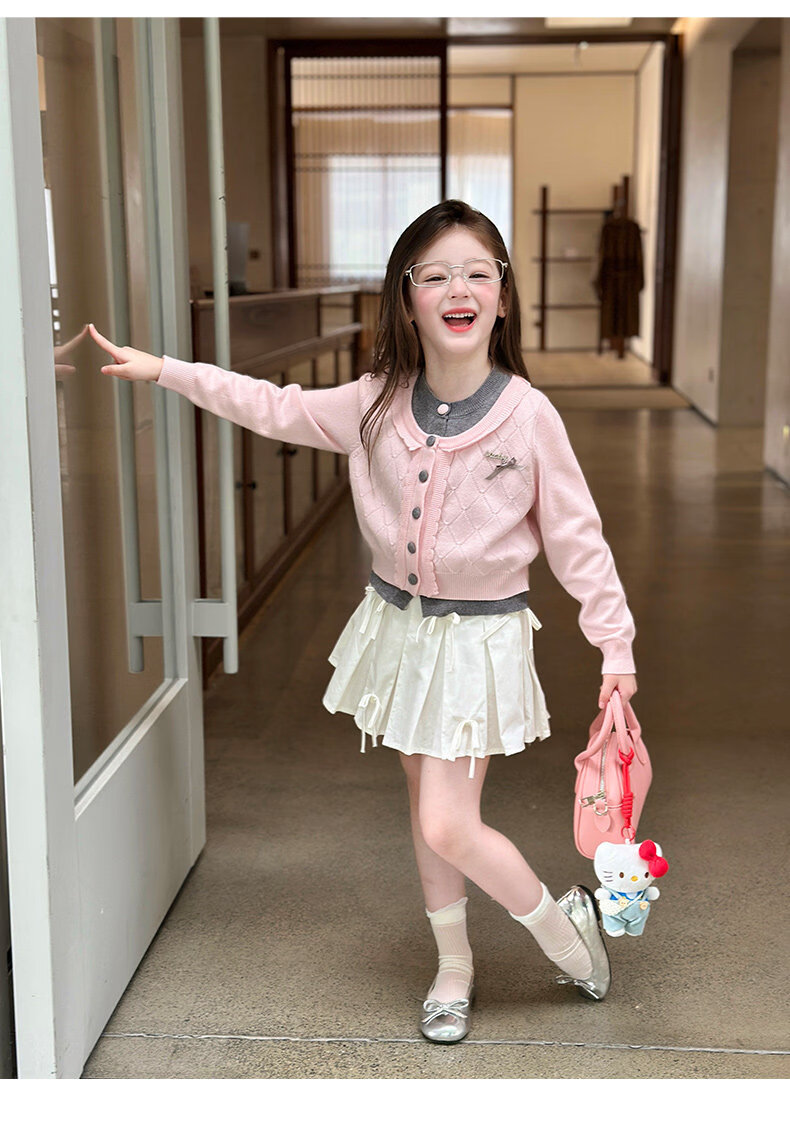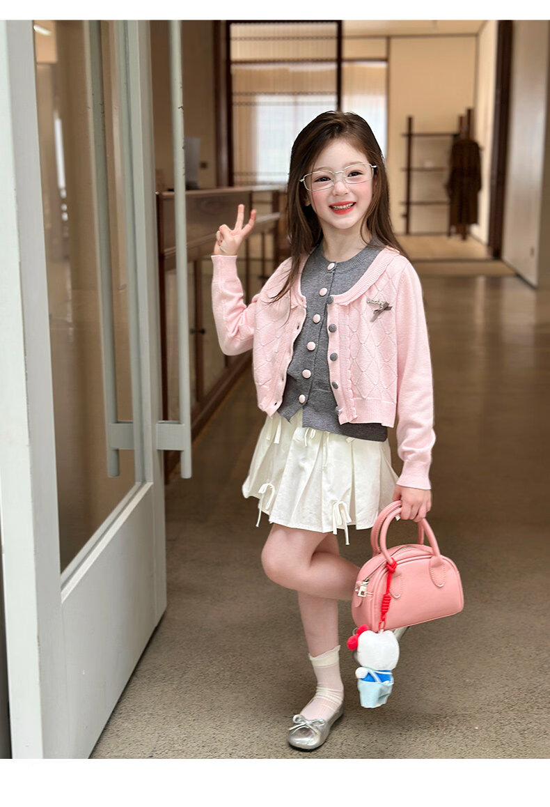 栀了成长记女童装甜美学院风毛衣2026春季儿童可爱假两件撞色开衫 粉色 上衣 120 cm
