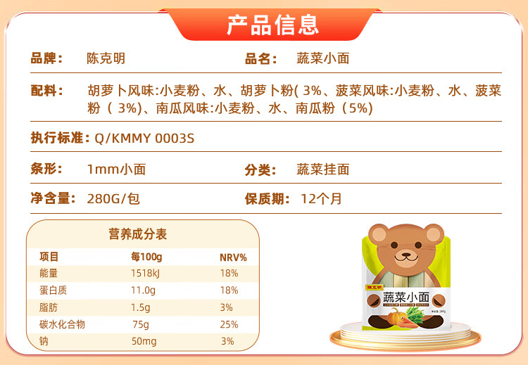 陈克明面条 儿童蔬菜小面280g 儿童面条儿童挂面儿童营养蔬菜挂面