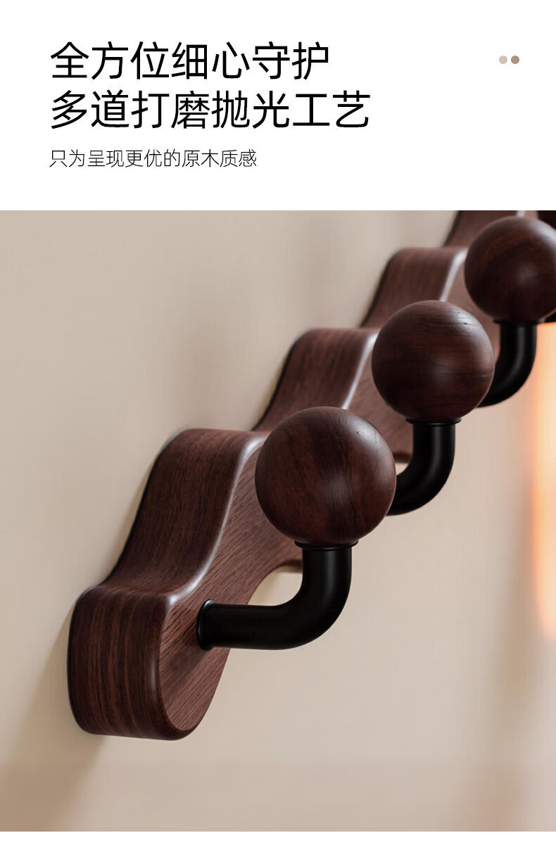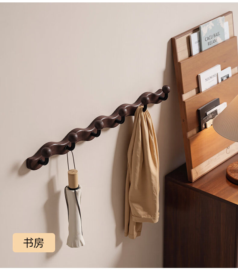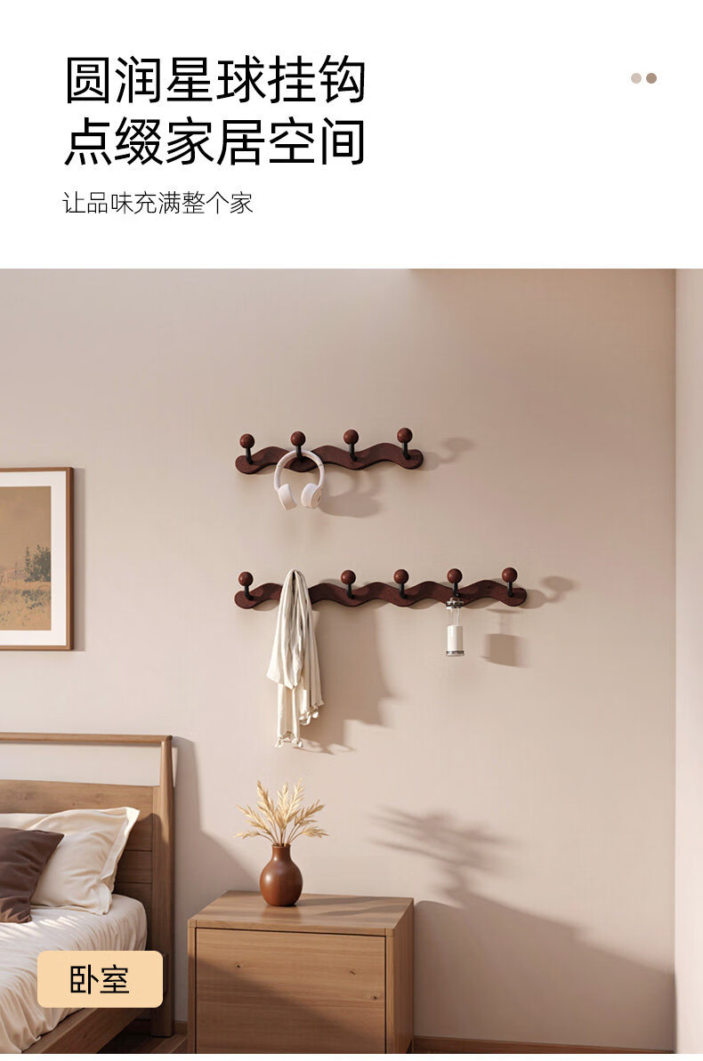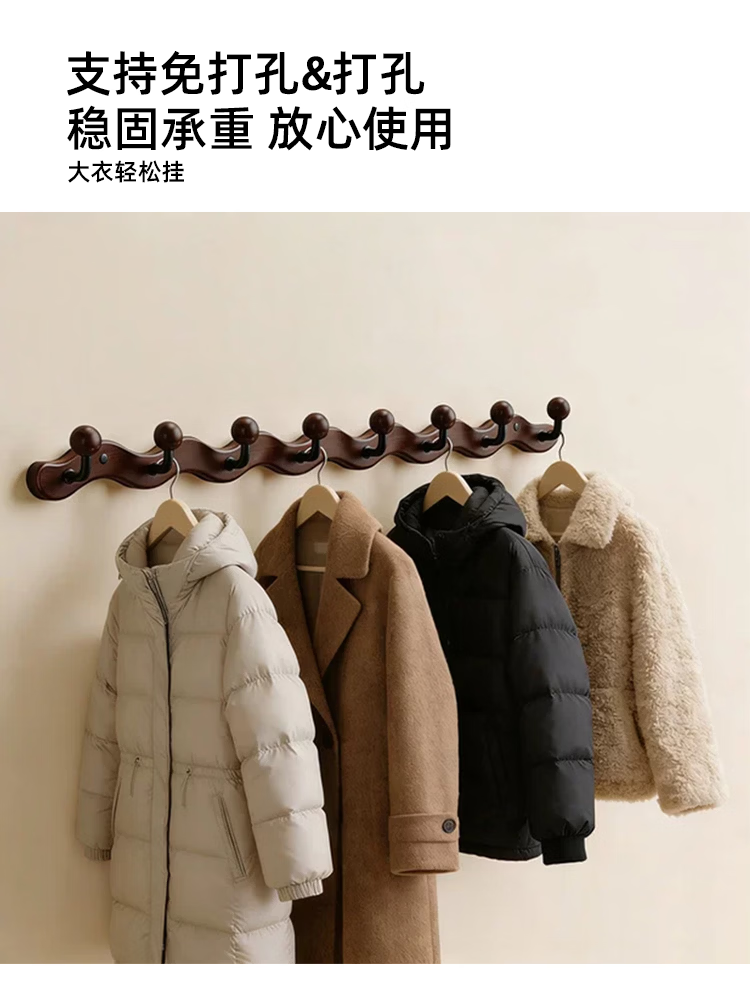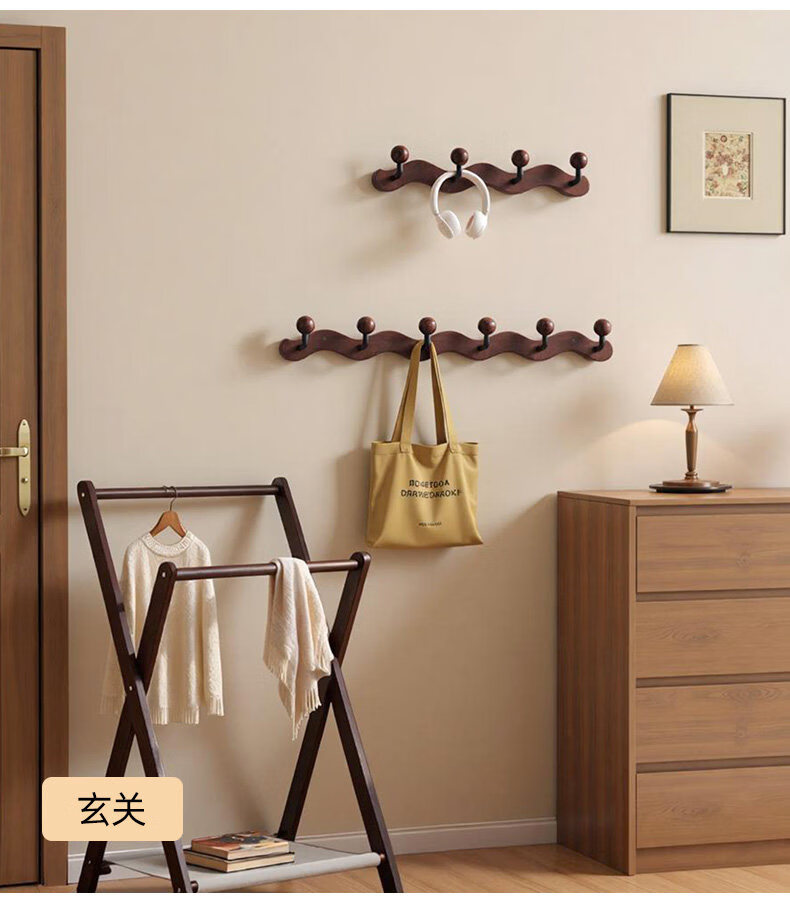 诗元中古风实木挂衣架壁挂墙上挂衣钩入户玄关免打孔高级感装饰衣帽架 【波浪星球】胡桃木色-4钩(打孔/免打孔 赠送配件)