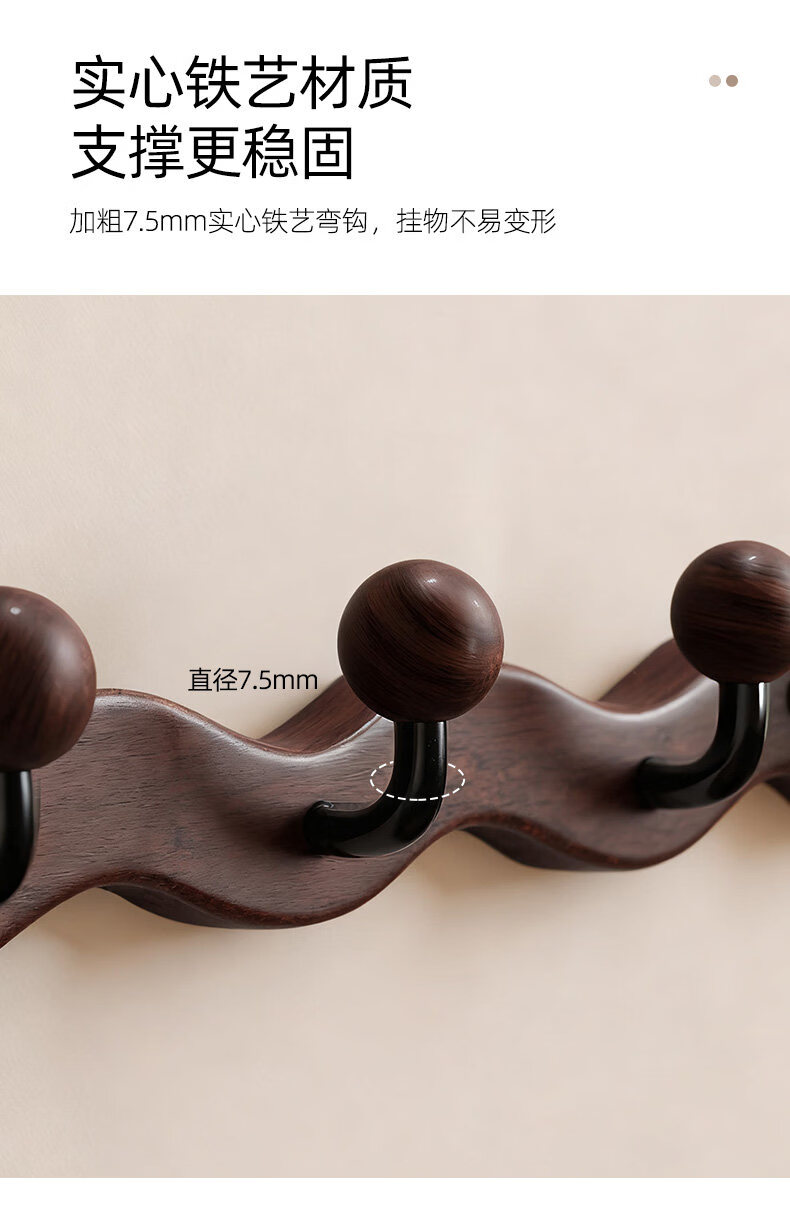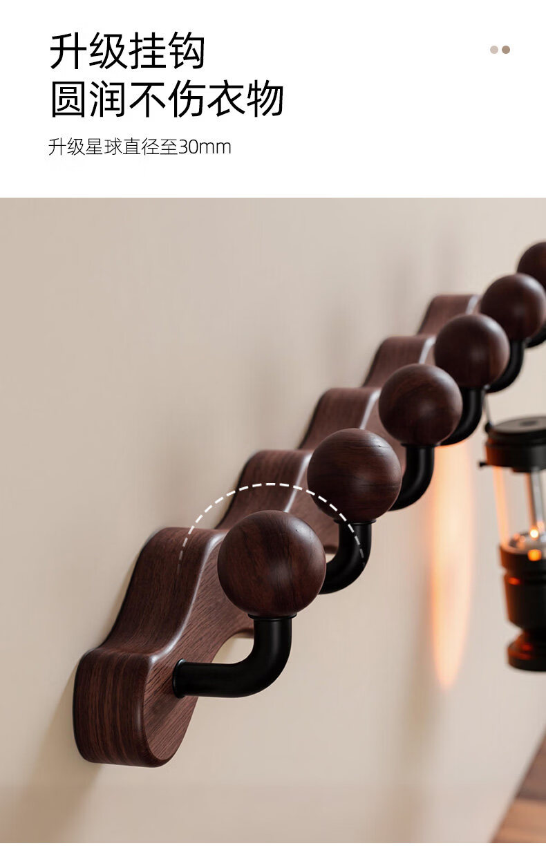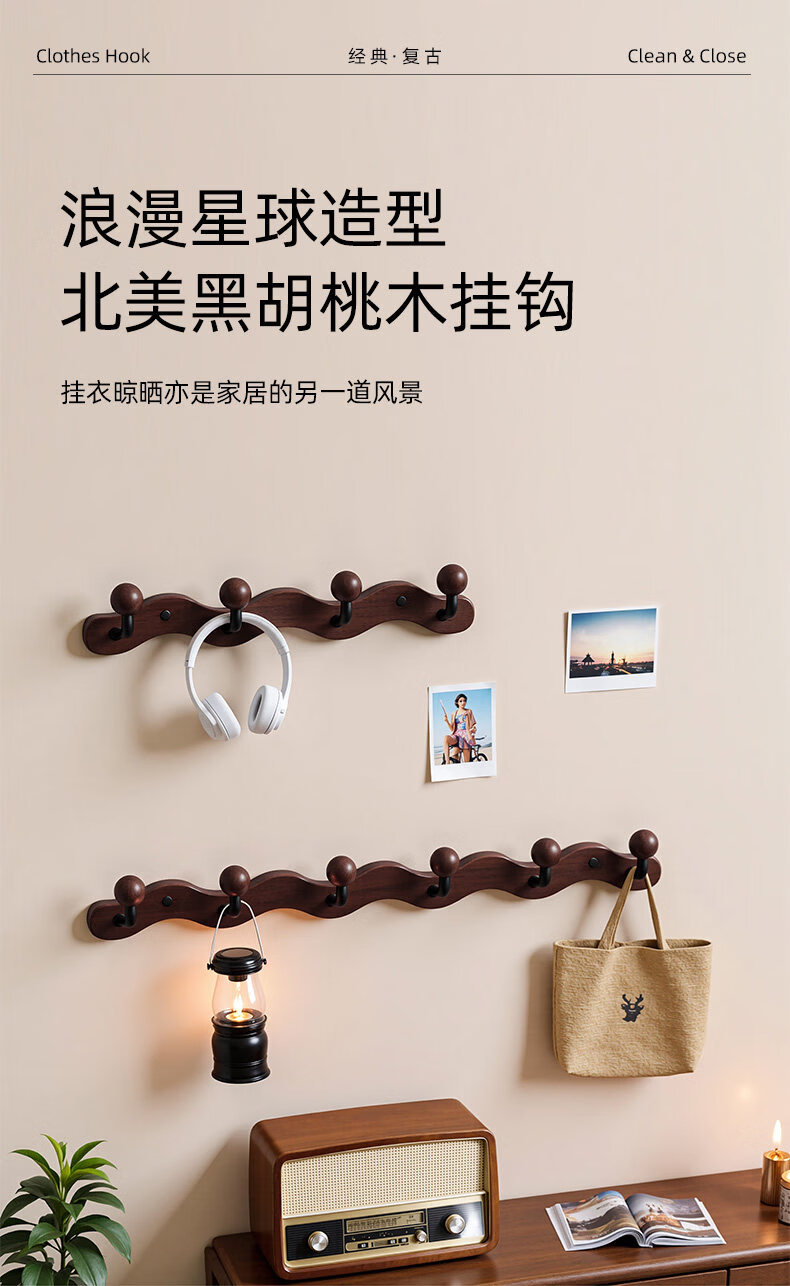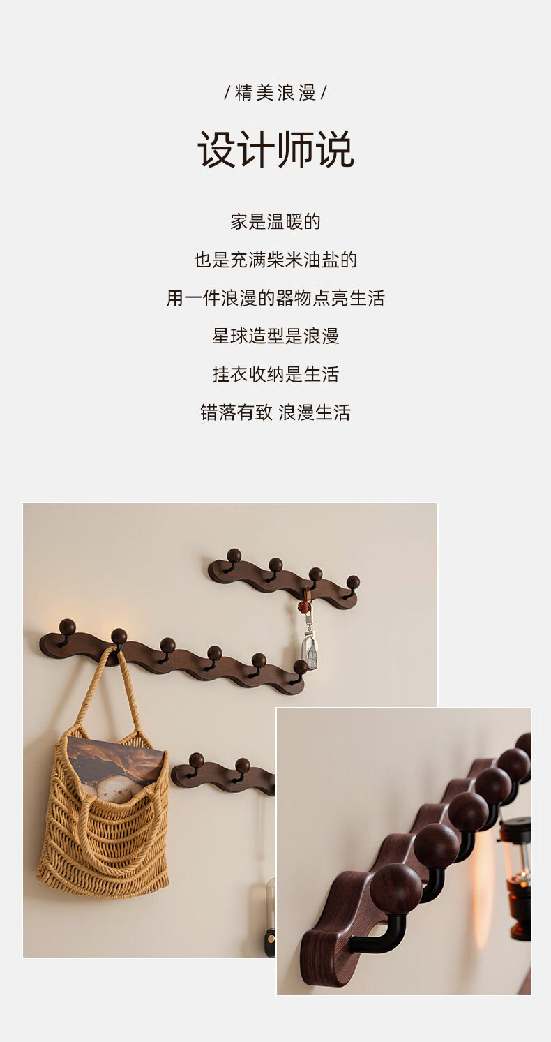 诗元中古风实木挂衣架壁挂墙上挂衣钩入户玄关免打孔高级感装饰衣帽架 【波浪星球】胡桃木色-4钩(打孔/免打孔 赠送配件)