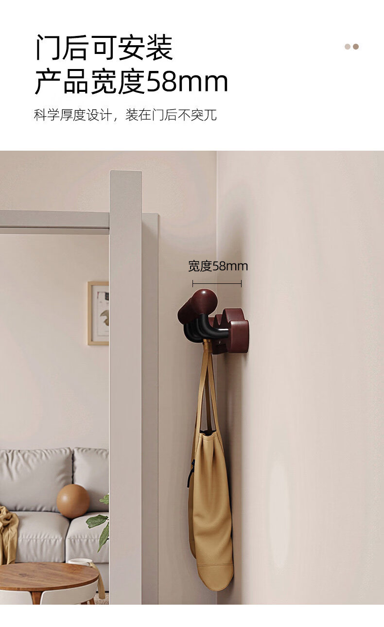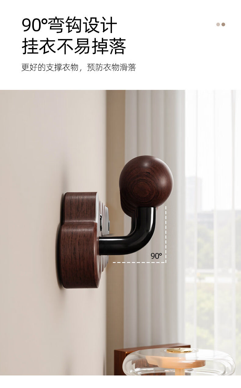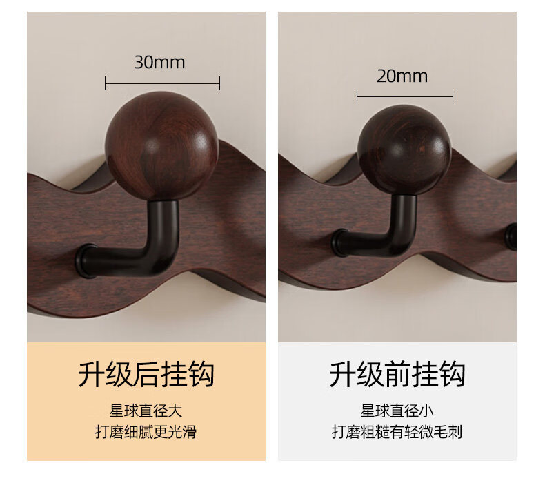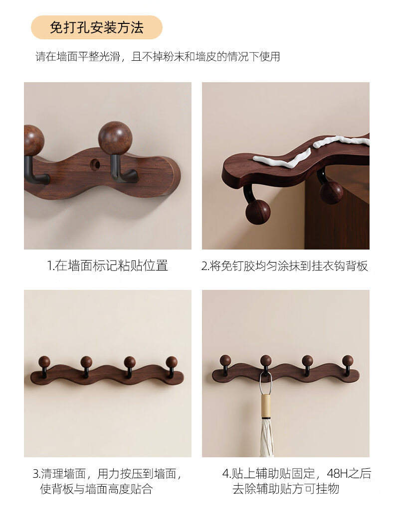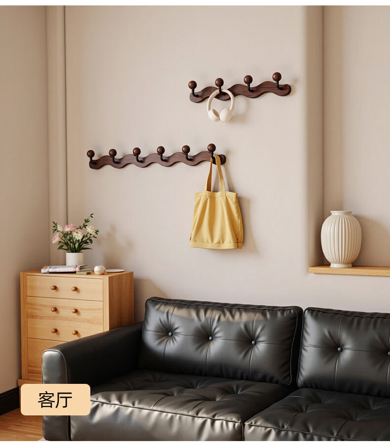 诗元中古风实木挂衣架壁挂墙上挂衣钩入户玄关免打孔高级感装饰衣帽架 【波浪星球】胡桃木色-4钩(打孔/免打孔 赠送配件)