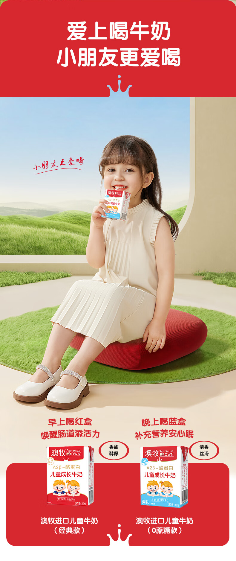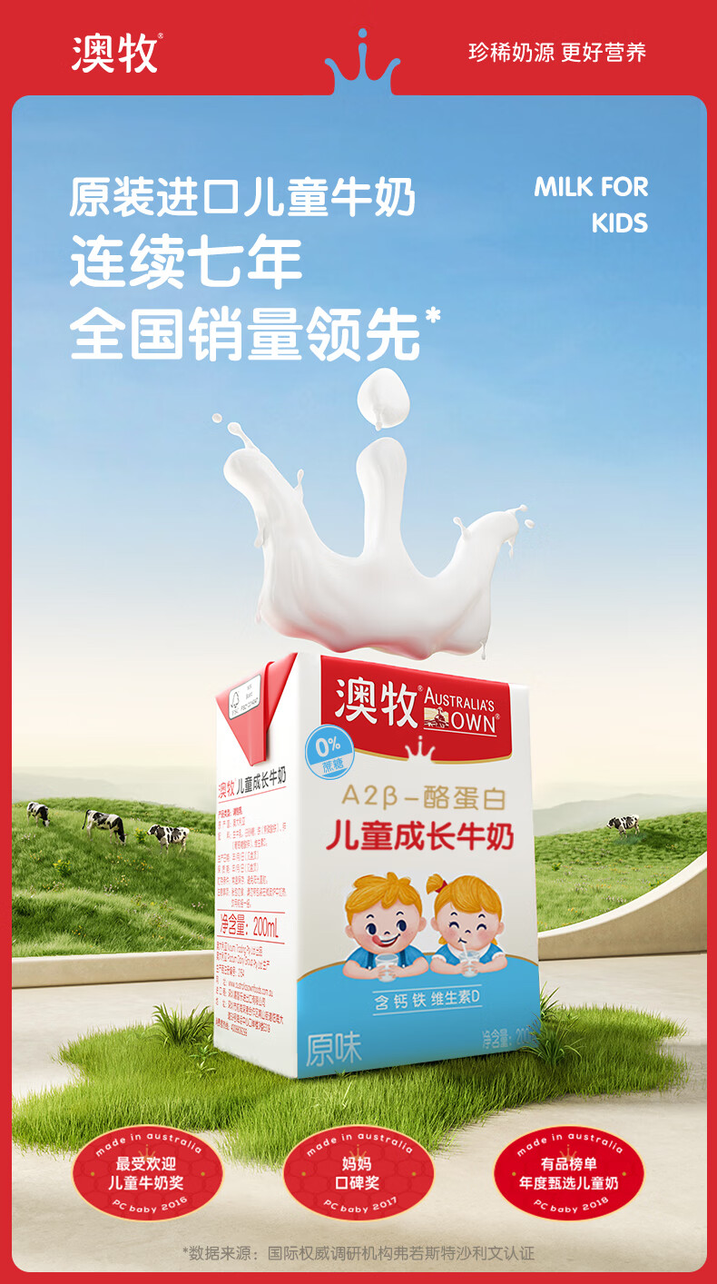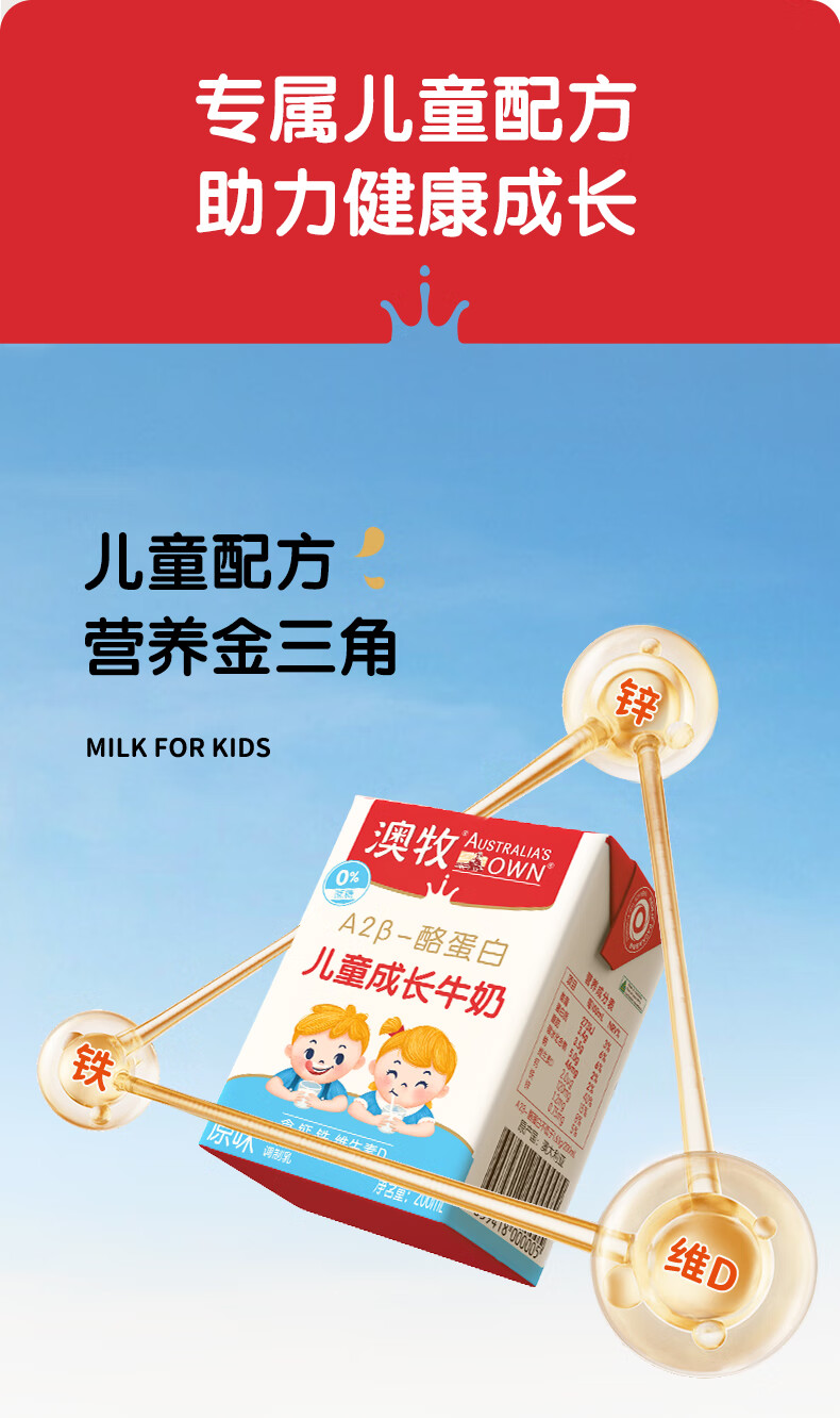 澳牧(Australia's Own)儿童成长牛奶A2蛋白钙铁锌VD 0蔗糖全脂学生早餐奶 200ml*6盒