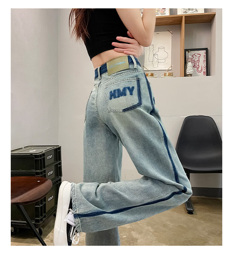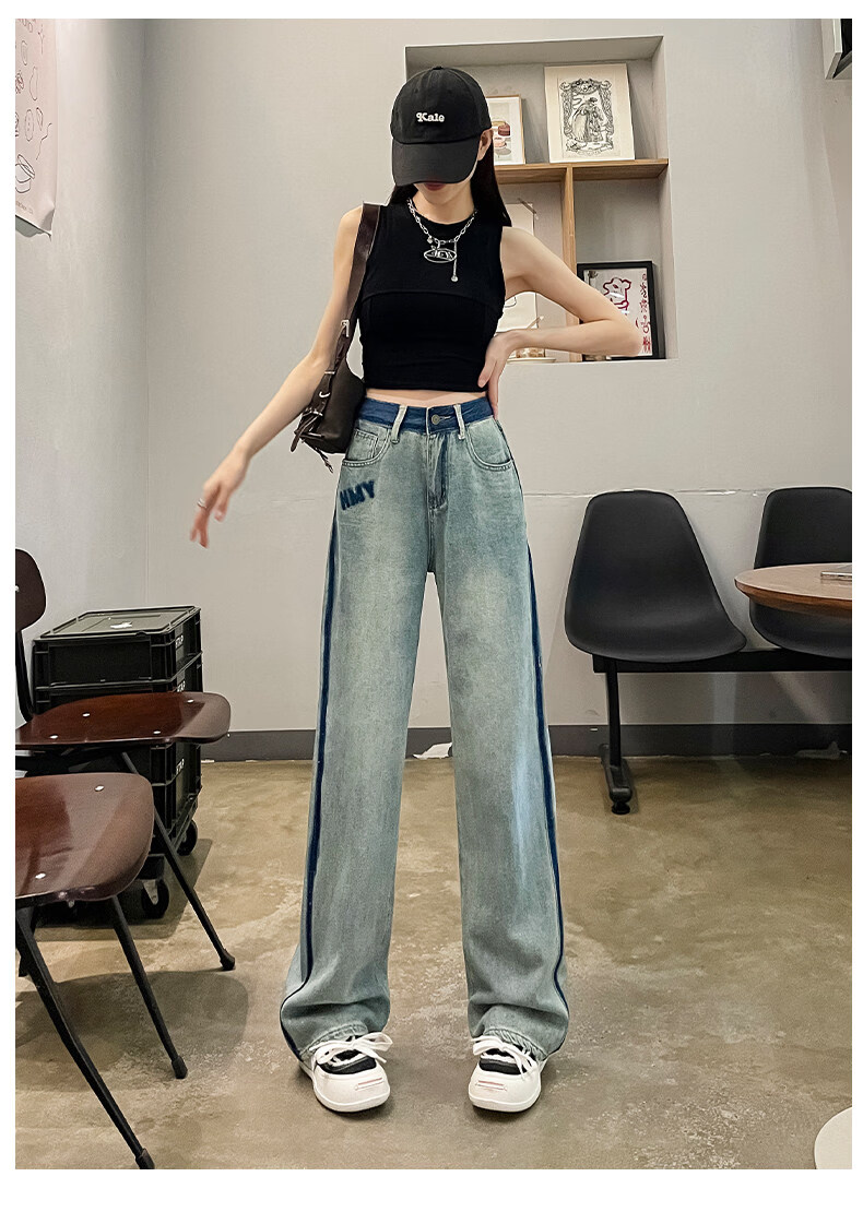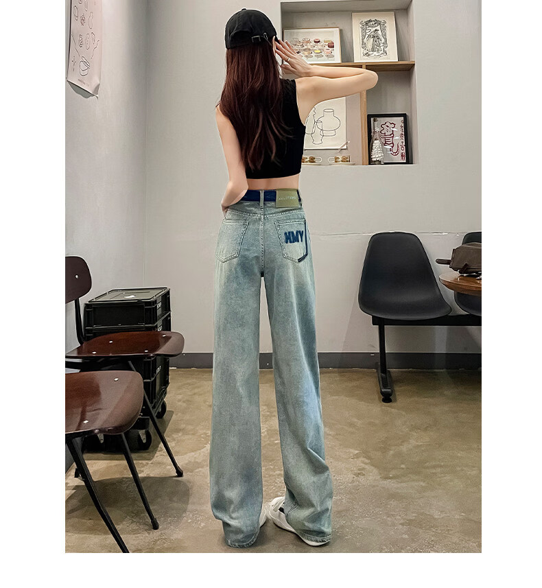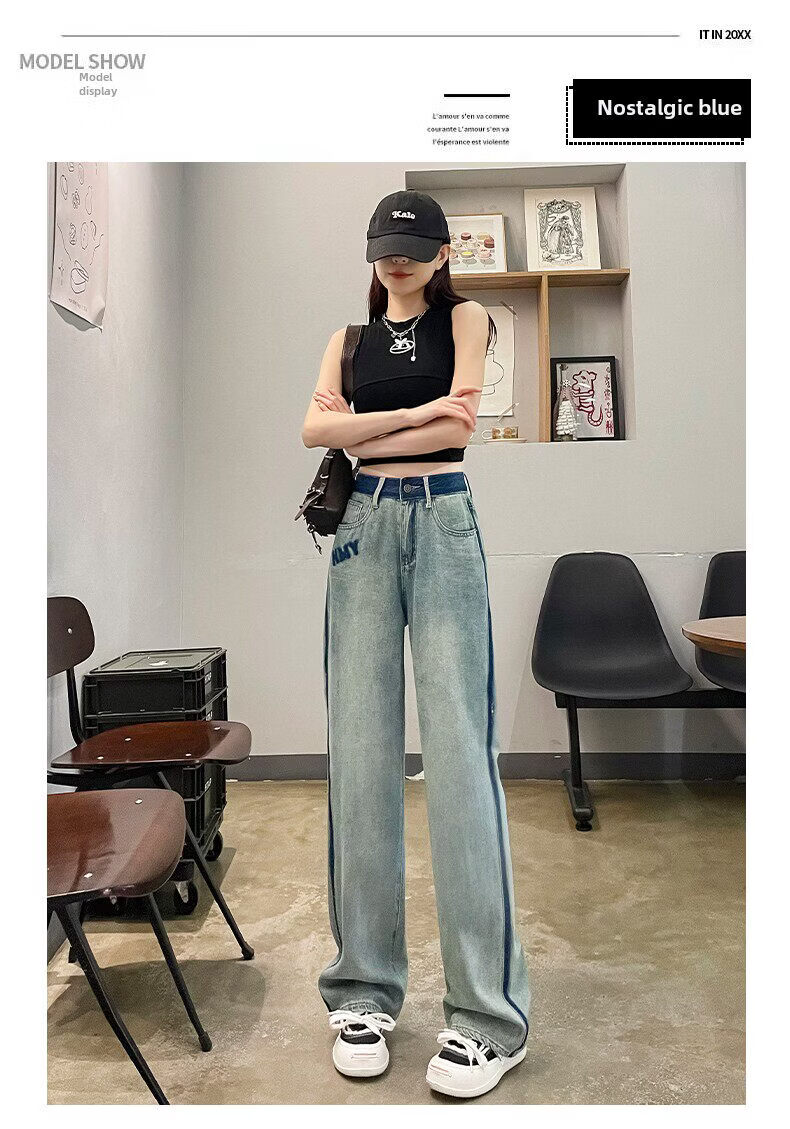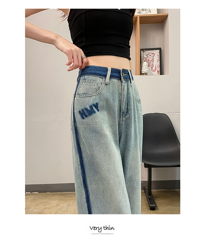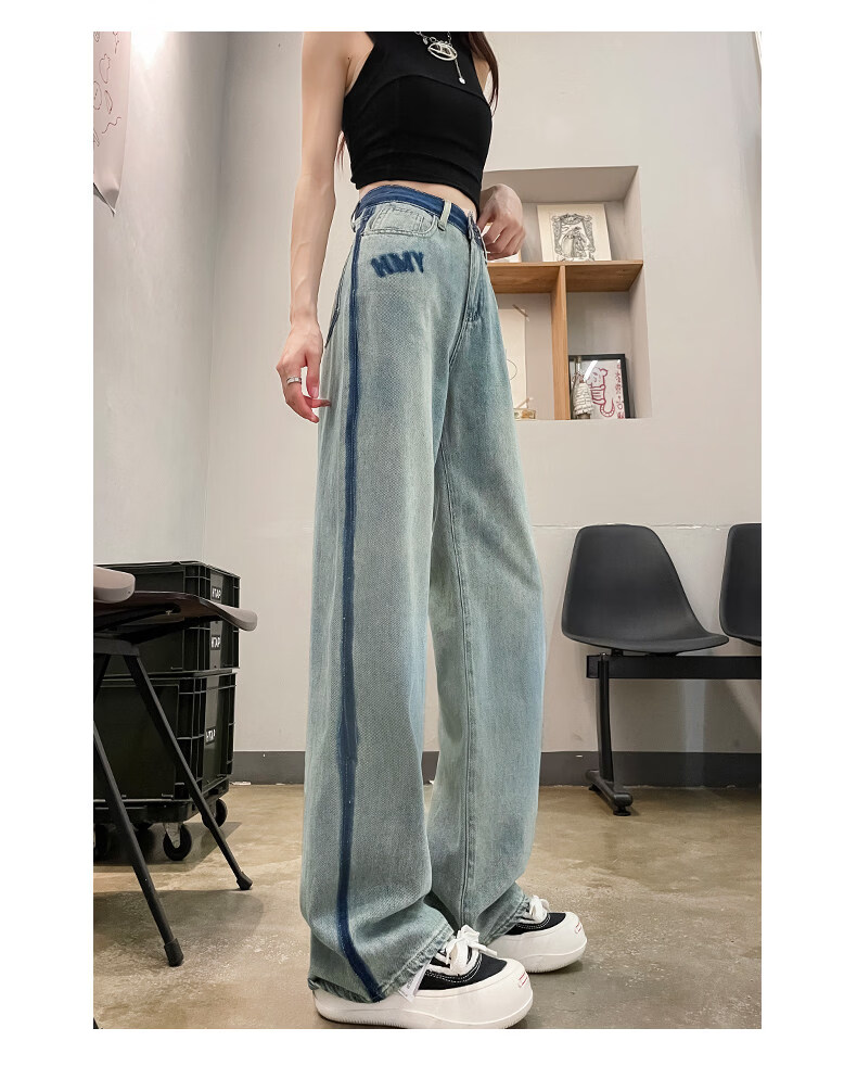 MODX春季女士阔腿牛仔裤,新款,高腰,修身,宽松,流行,对比色设计 怀旧蓝【长裤】 XS