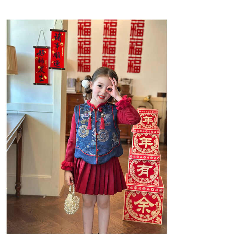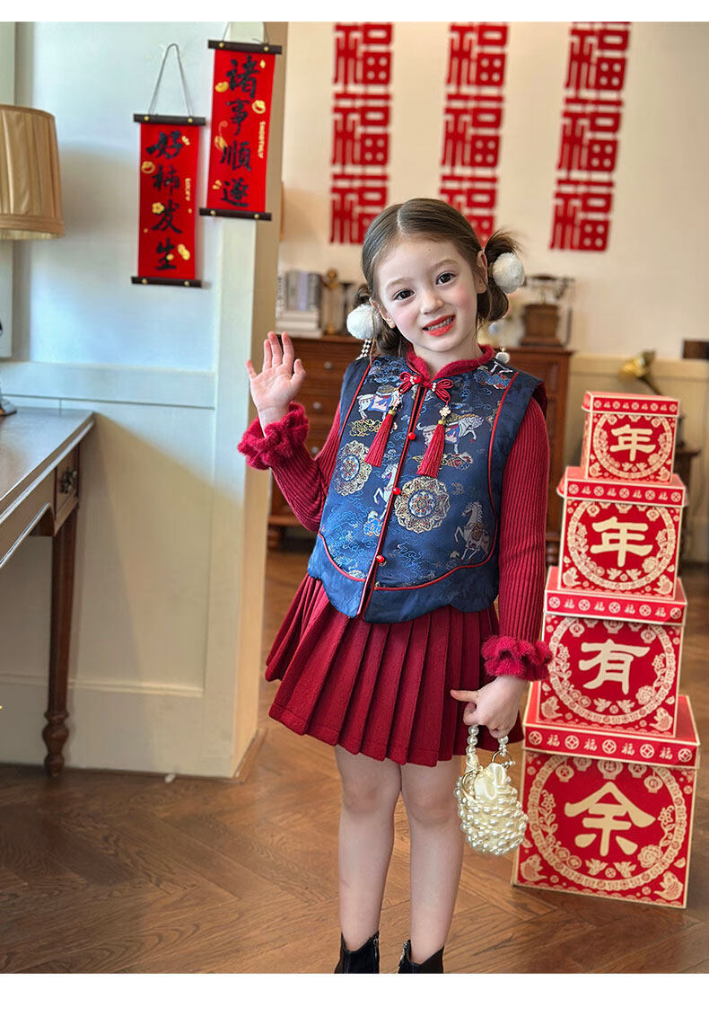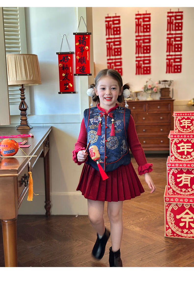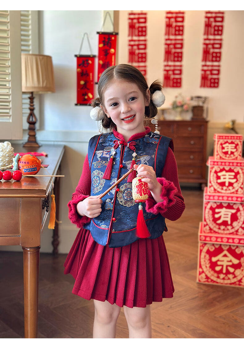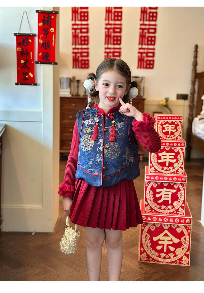 栀了成长记童装女童红色国风套装2025冬季儿童新年夹棉马甲两件套 红色 套装 100 cm