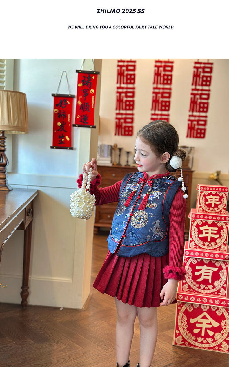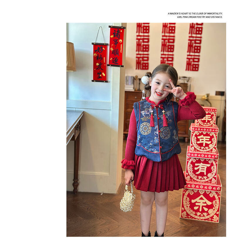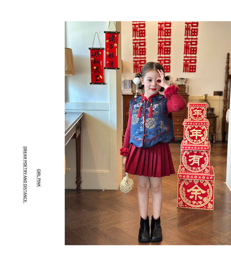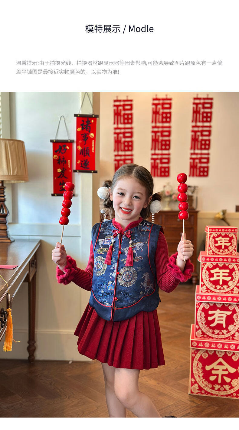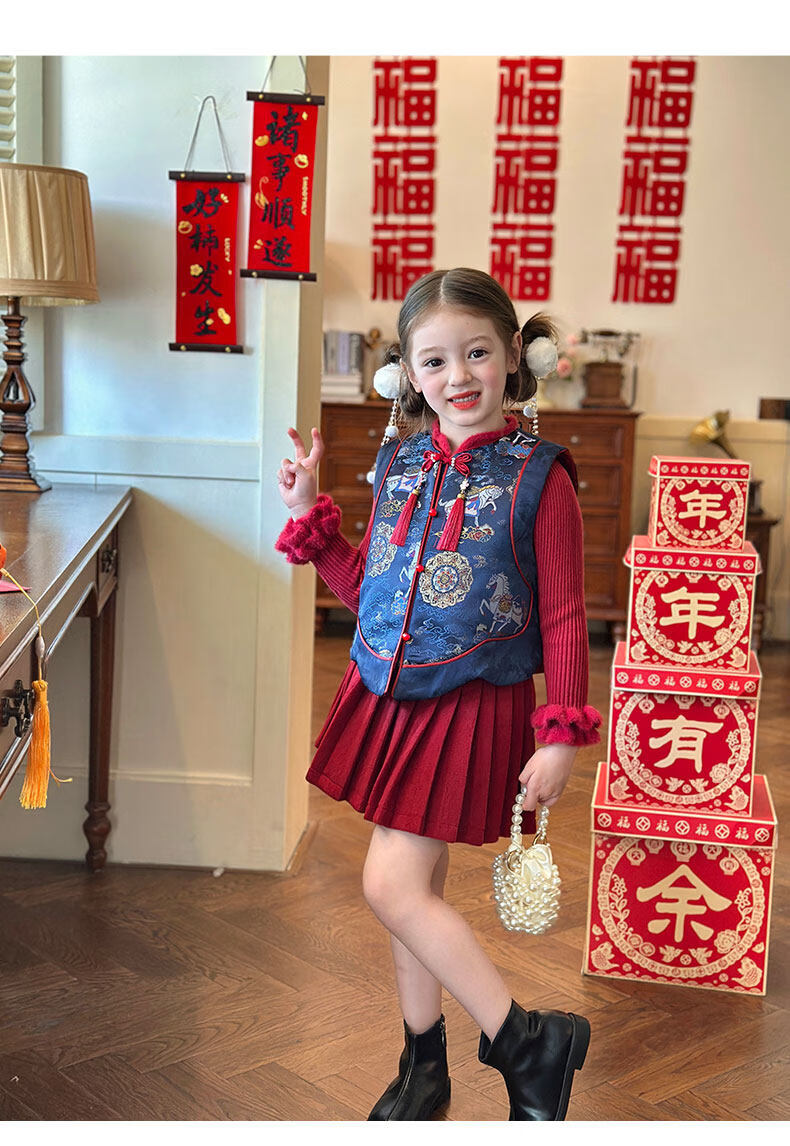 栀了成长记童装女童红色国风套装2025冬季儿童新年夹棉马甲两件套 红色 套装 100 cm