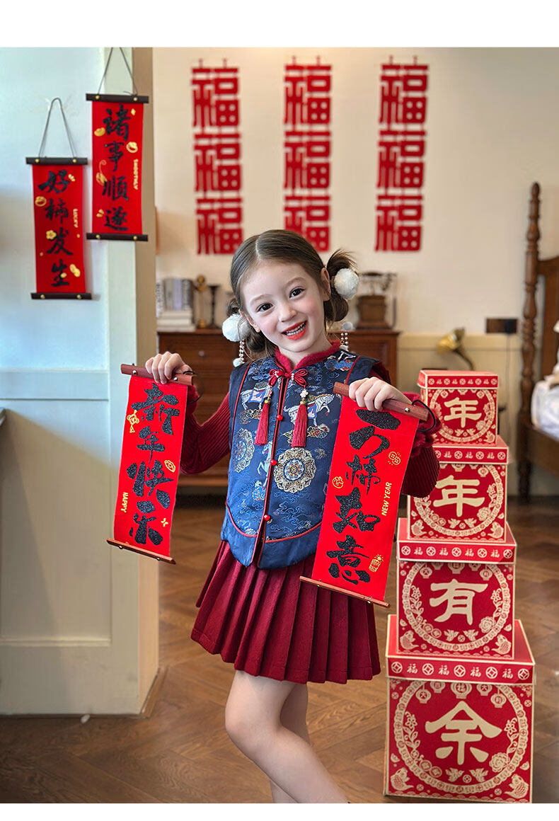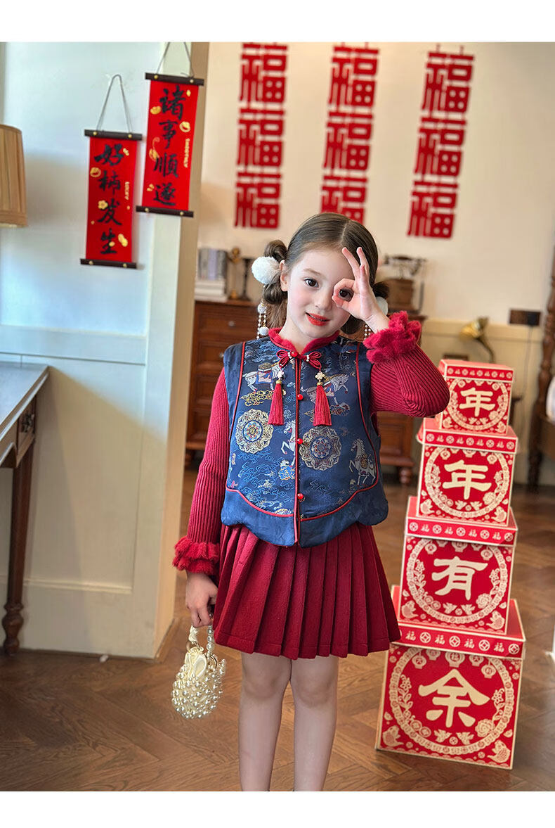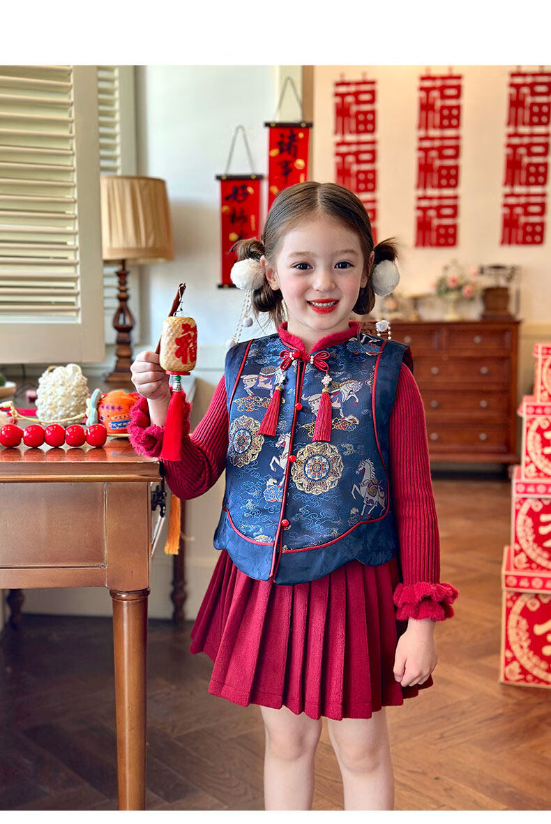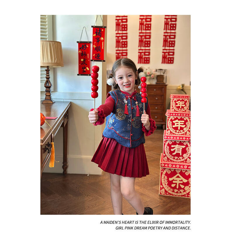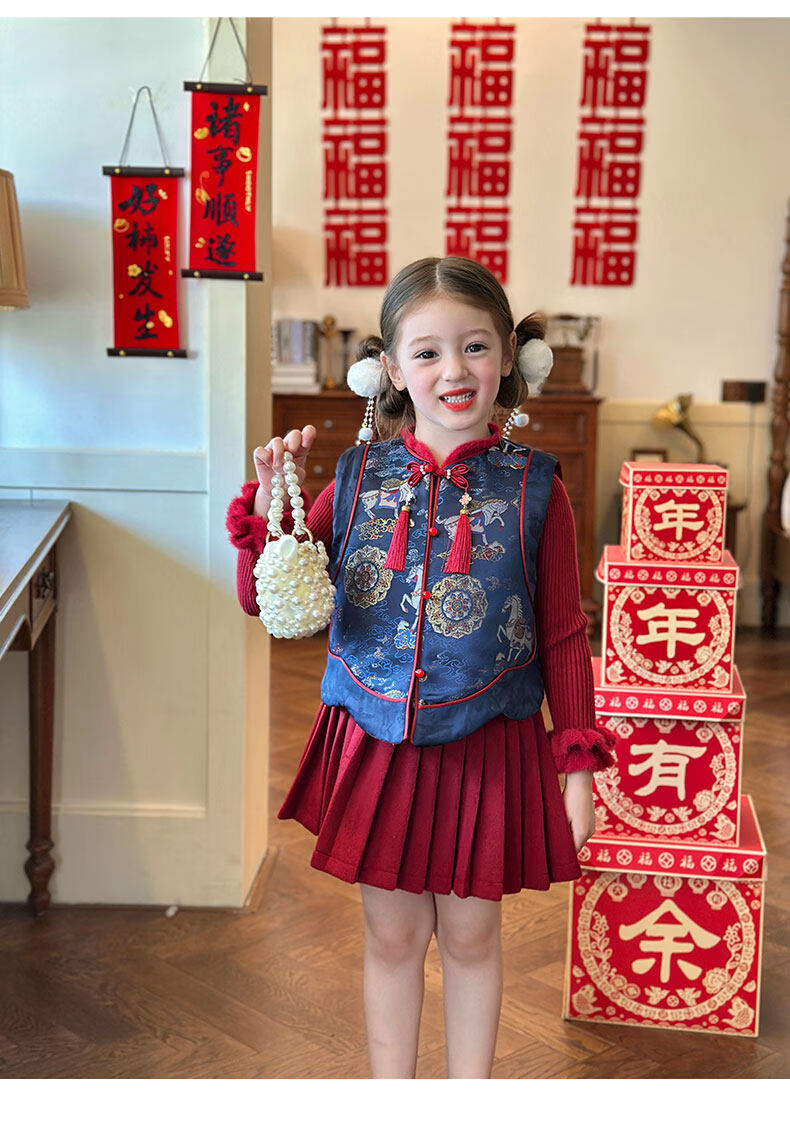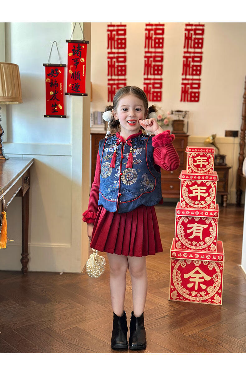 栀了成长记童装女童国风拜年服套装2025冬季儿童新中式加厚两件套 蓝色 夹棉马甲 100 cm