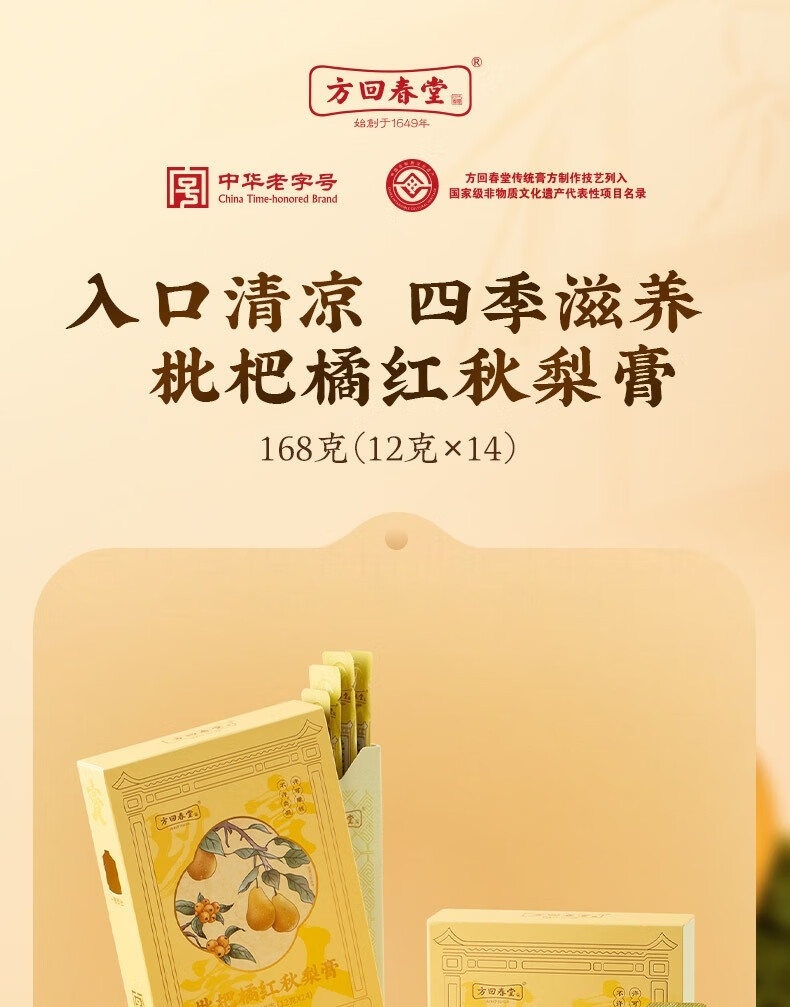 方回春堂枇杷橘红秋梨膏168g(12g*14条)儿童成人药食同源滋补养生
