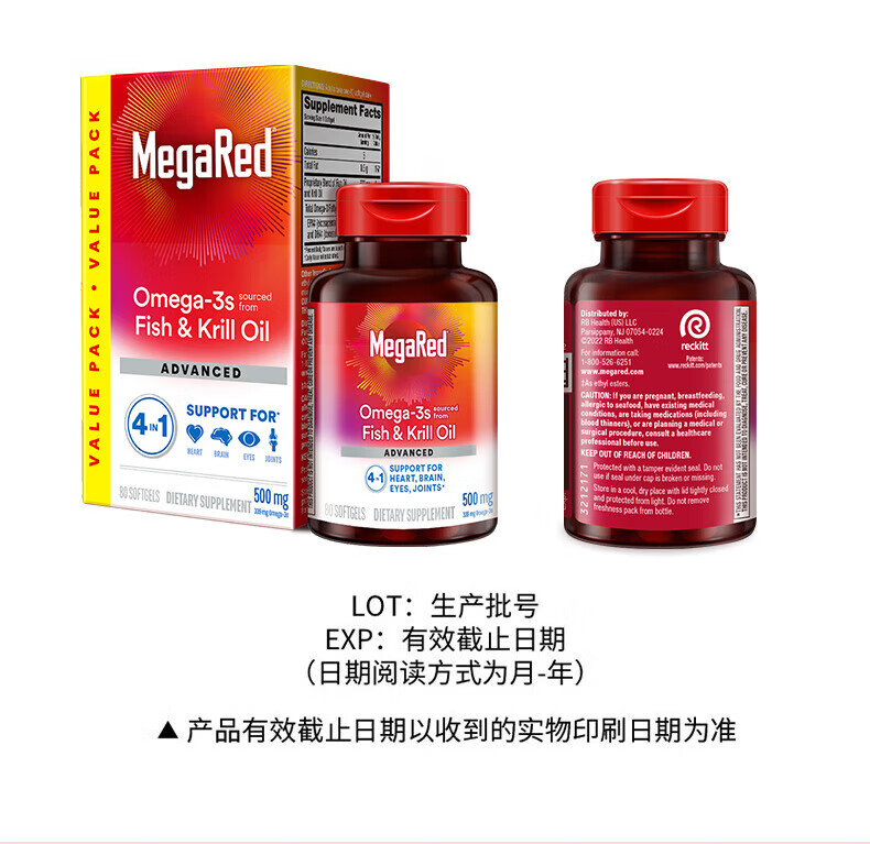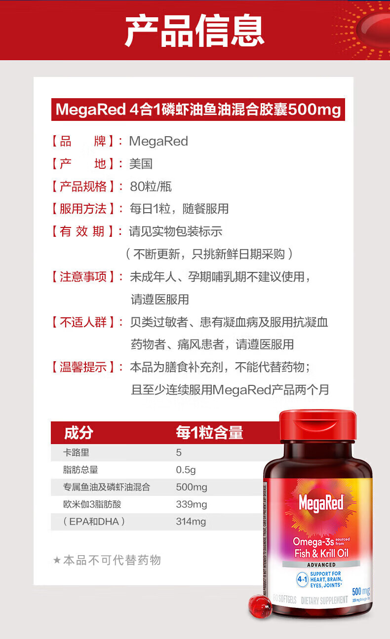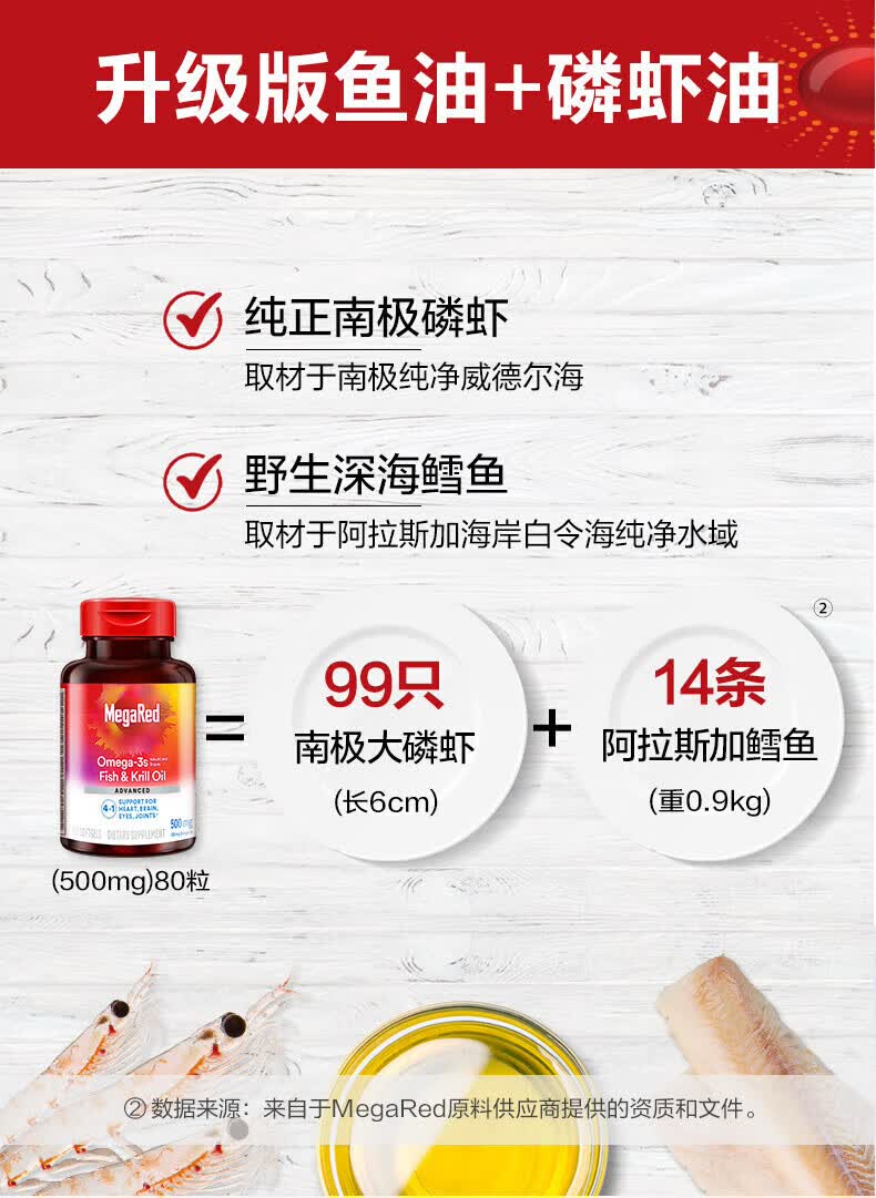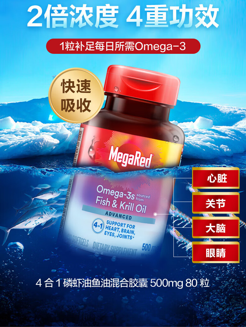MegaRed脉拓南极深海磷虾油500mg美国进口omega3鱼油升级 效期至26年12月 四合一磷虾油 80粒*2瓶
