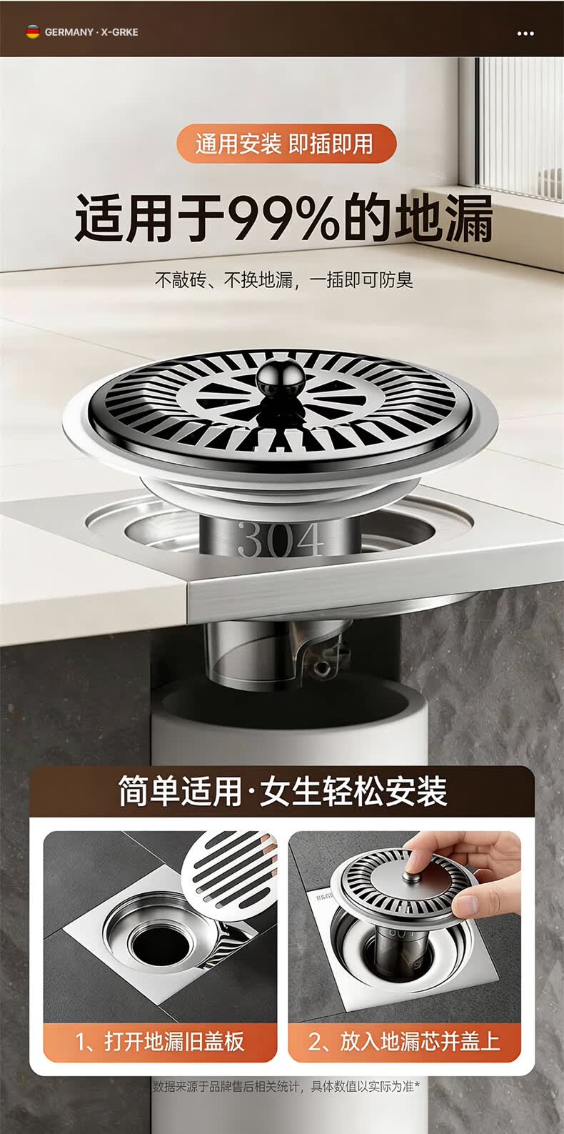 X-GRKE【德国】防臭地漏芯卫生间防虫反味神器304不锈钢下水道地漏通用 大滤网【防臭防虫防返水】磁吸地漏芯-银色 独立提篮丨极速排水丨厨卫阳台通用