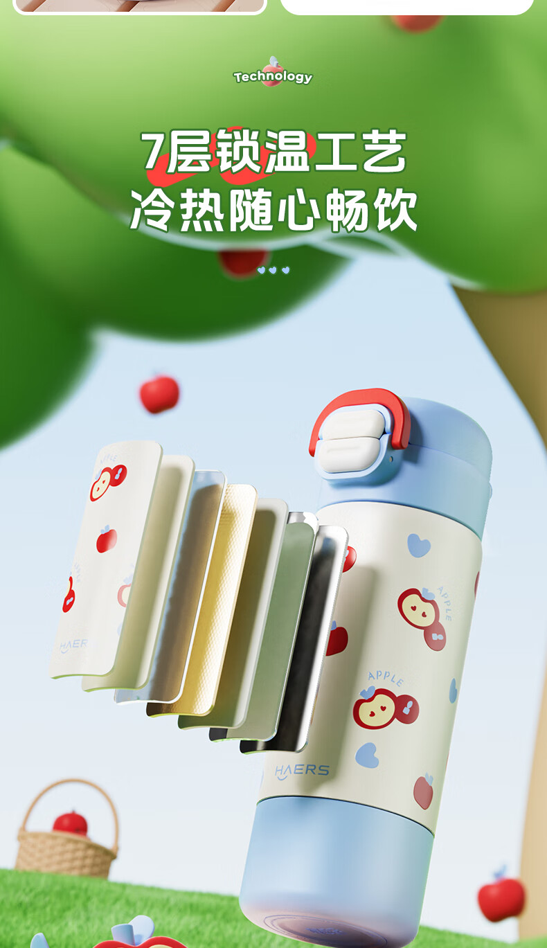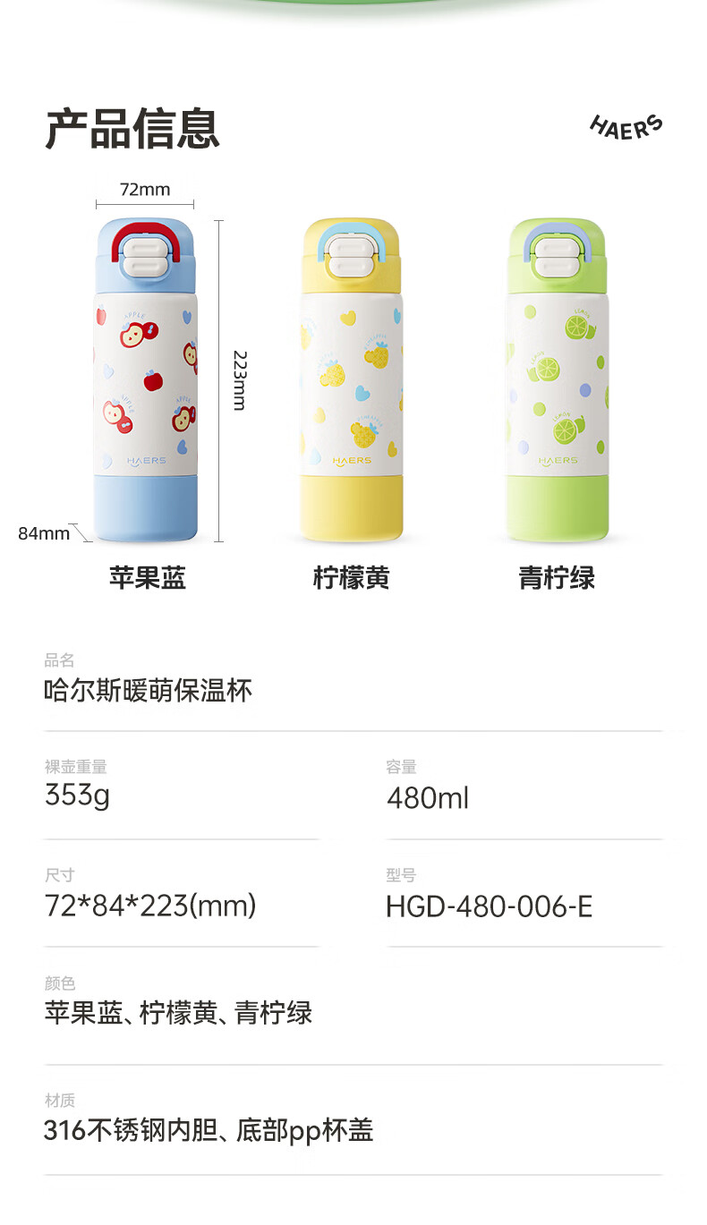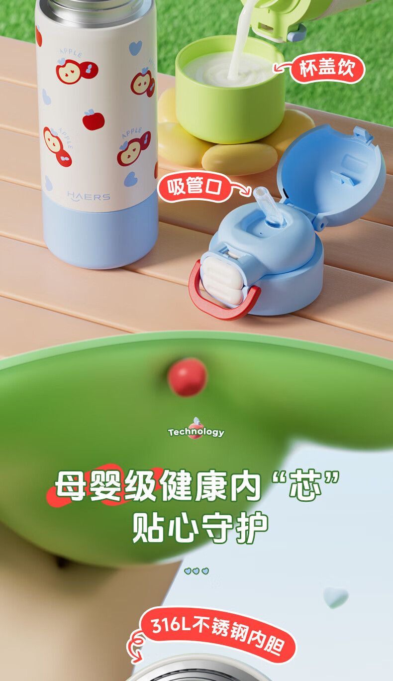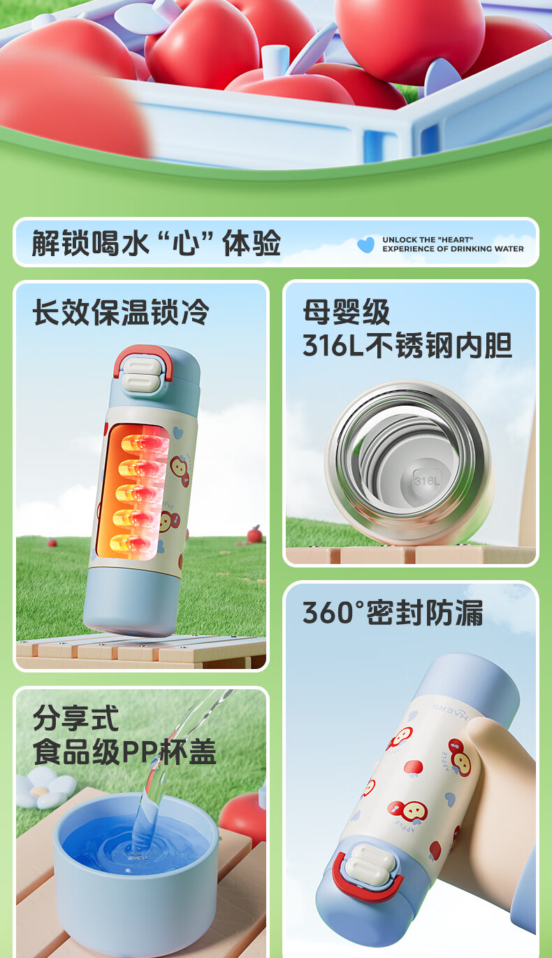 哈尔斯儿童保温杯316L不锈钢水杯学生便携吸管杯大容量实用生日礼物 苹果蓝 480ml【限时特惠】