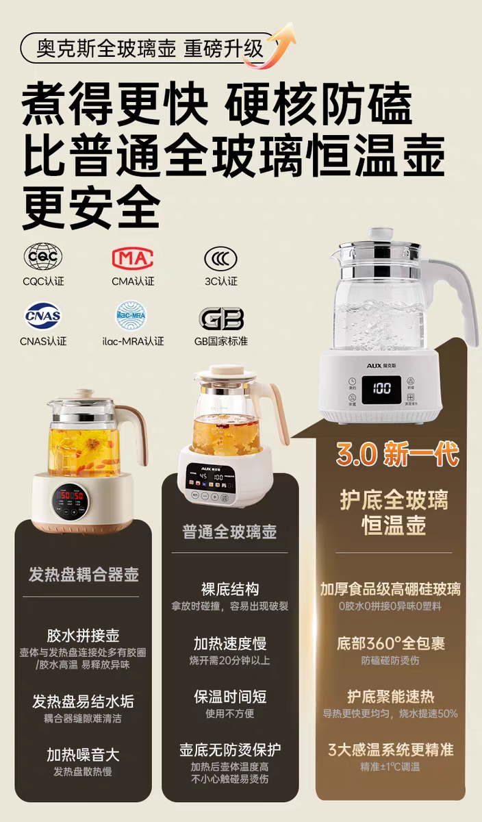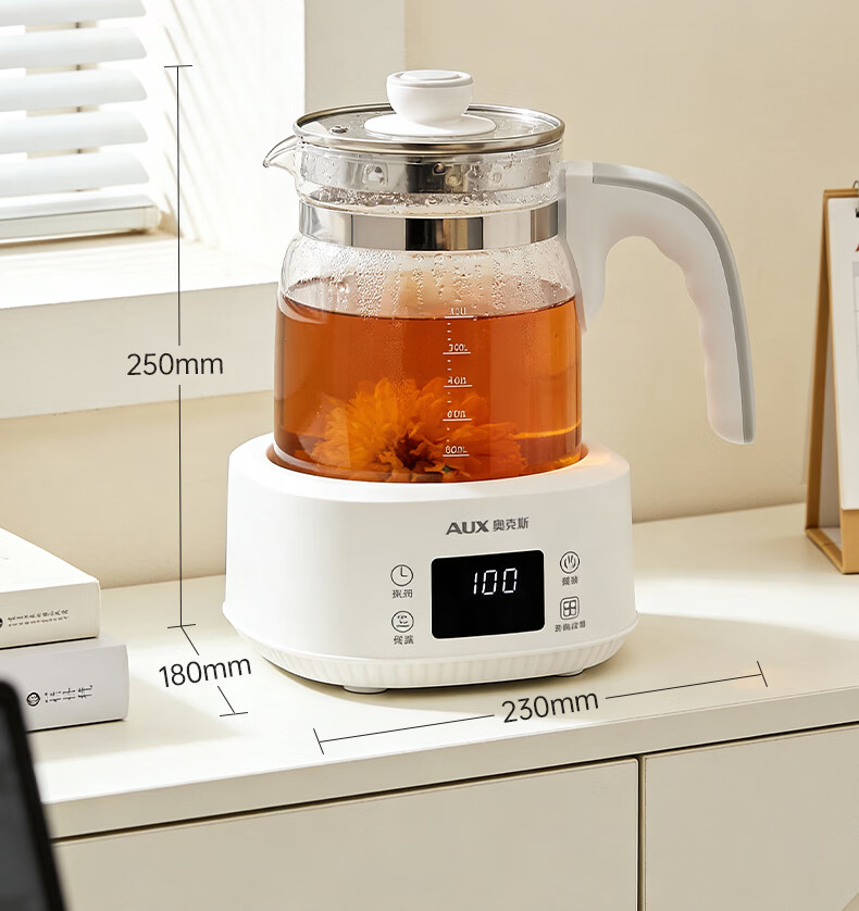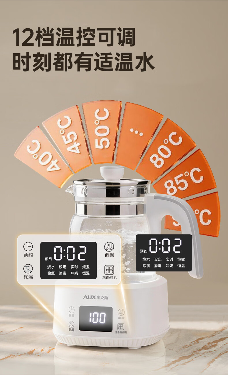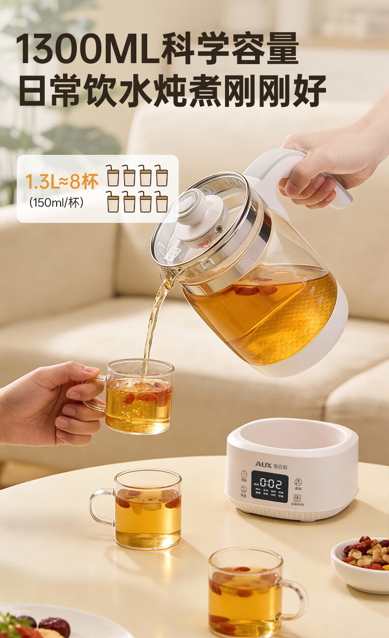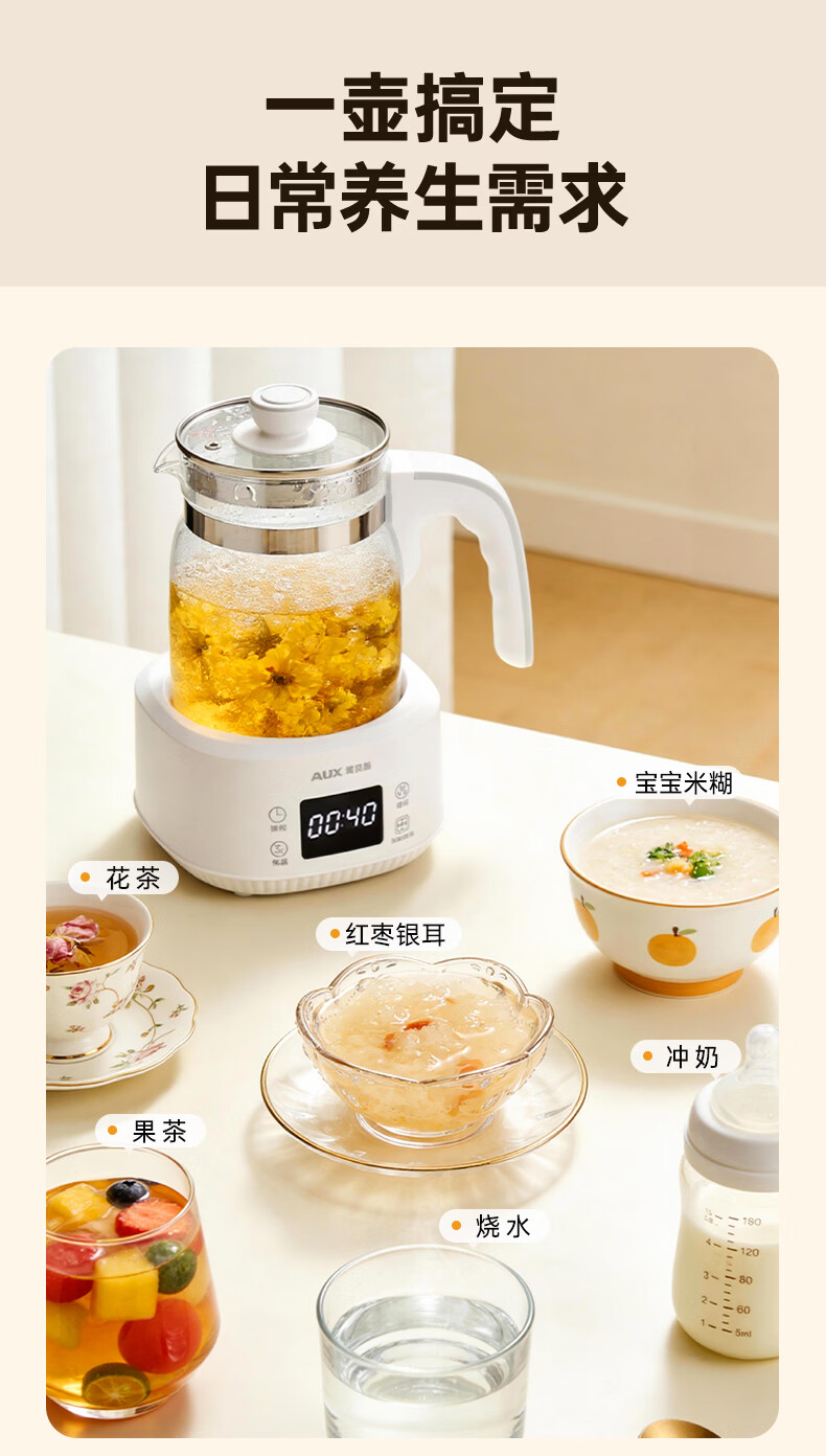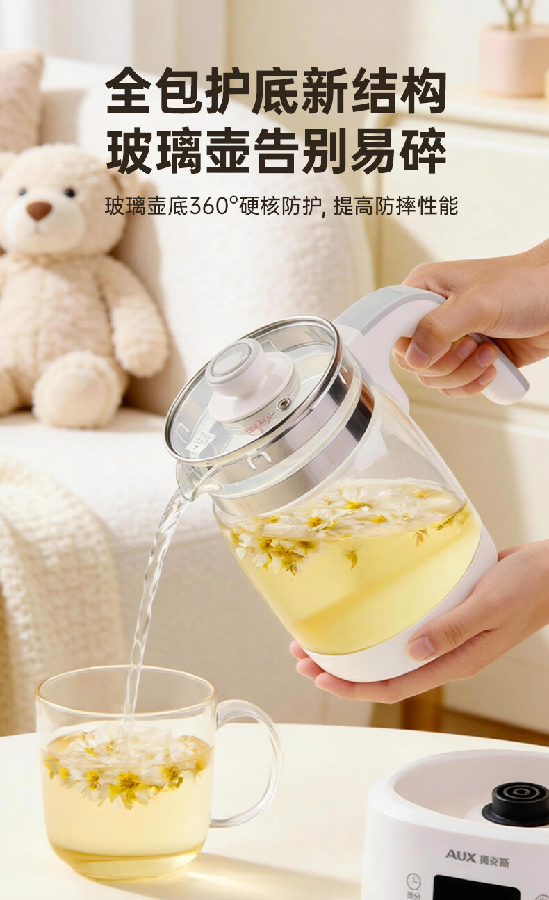 奥克斯冲调奶器恒温热水壶全玻璃养生壶保温一体全自动恒温0胶水婴儿用养生烧水壶炖煮一体多功能煮茶壶 1.3L 加厚全玻璃+滤网