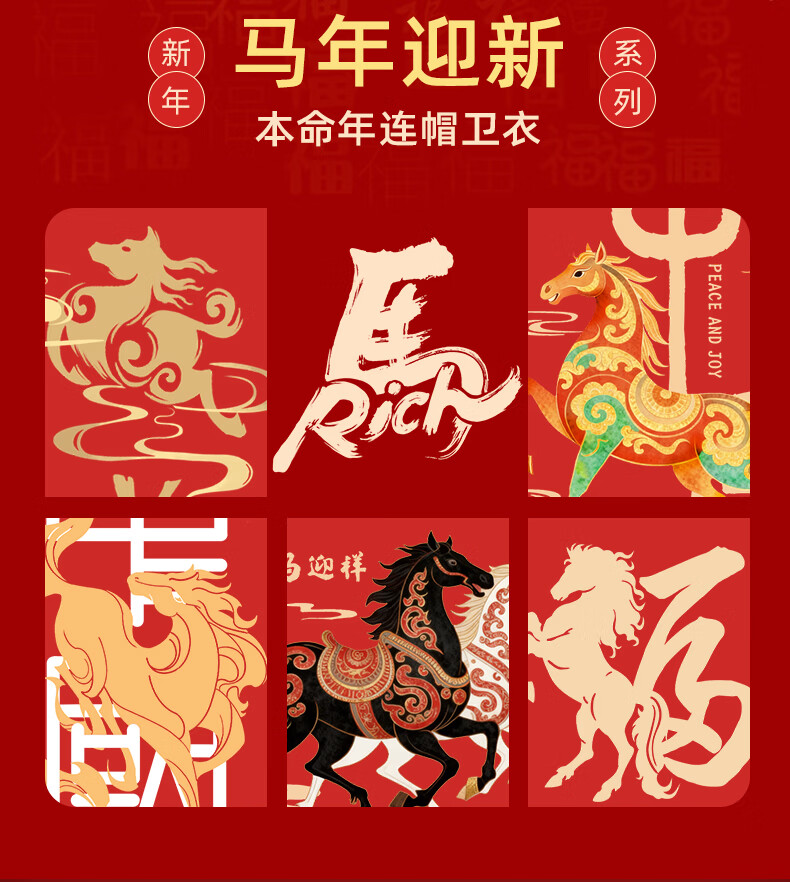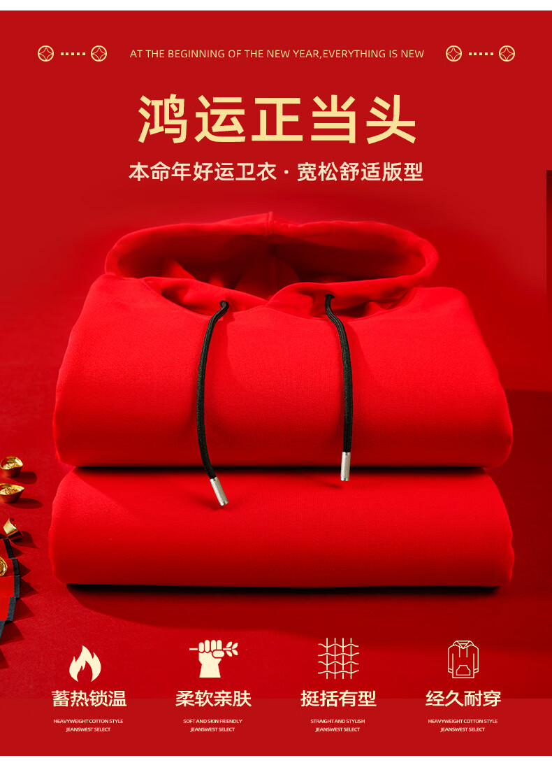 真维斯(Jeanswest)重磅加绒连帽卫衣男新年战袍年会酒红色外套2026马年本命年上衣男 红色 诸事顺遂马_K M