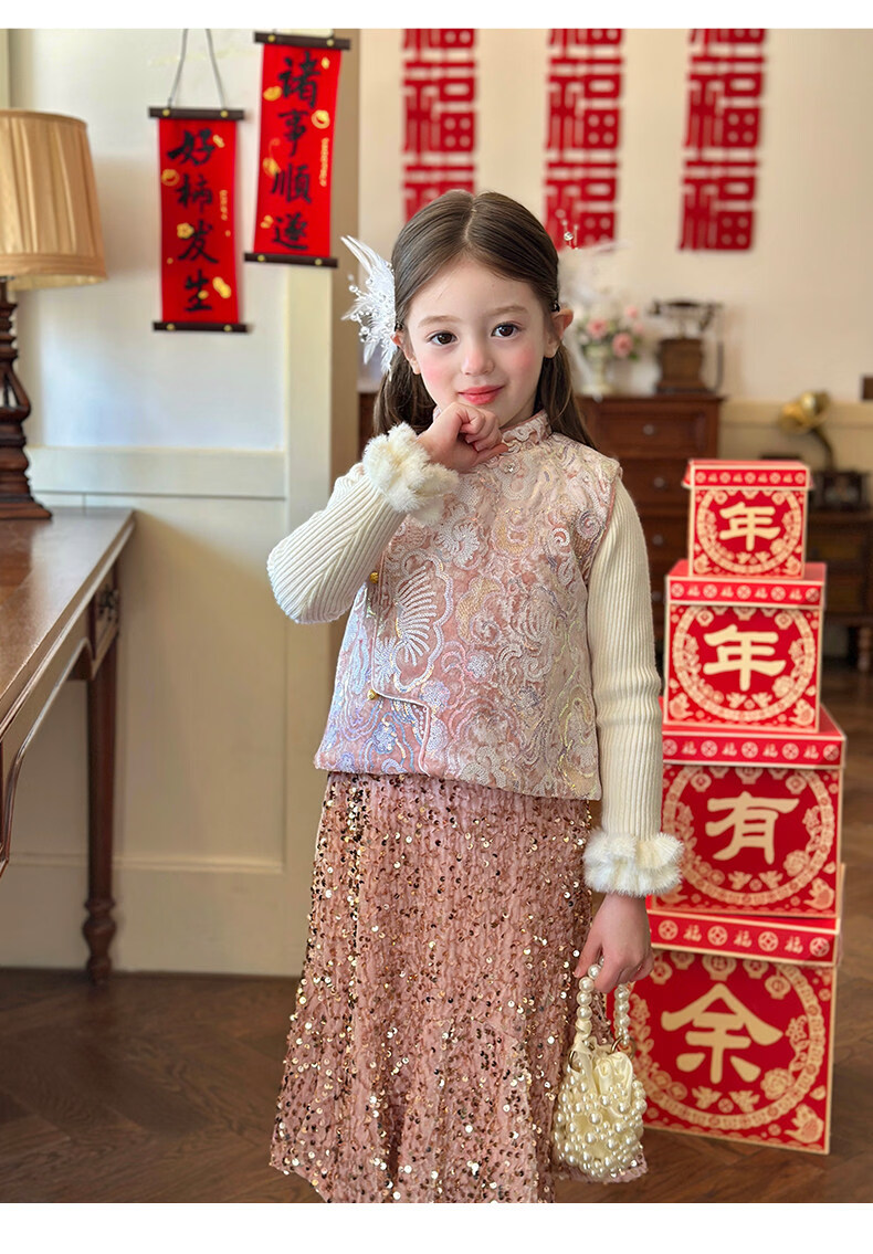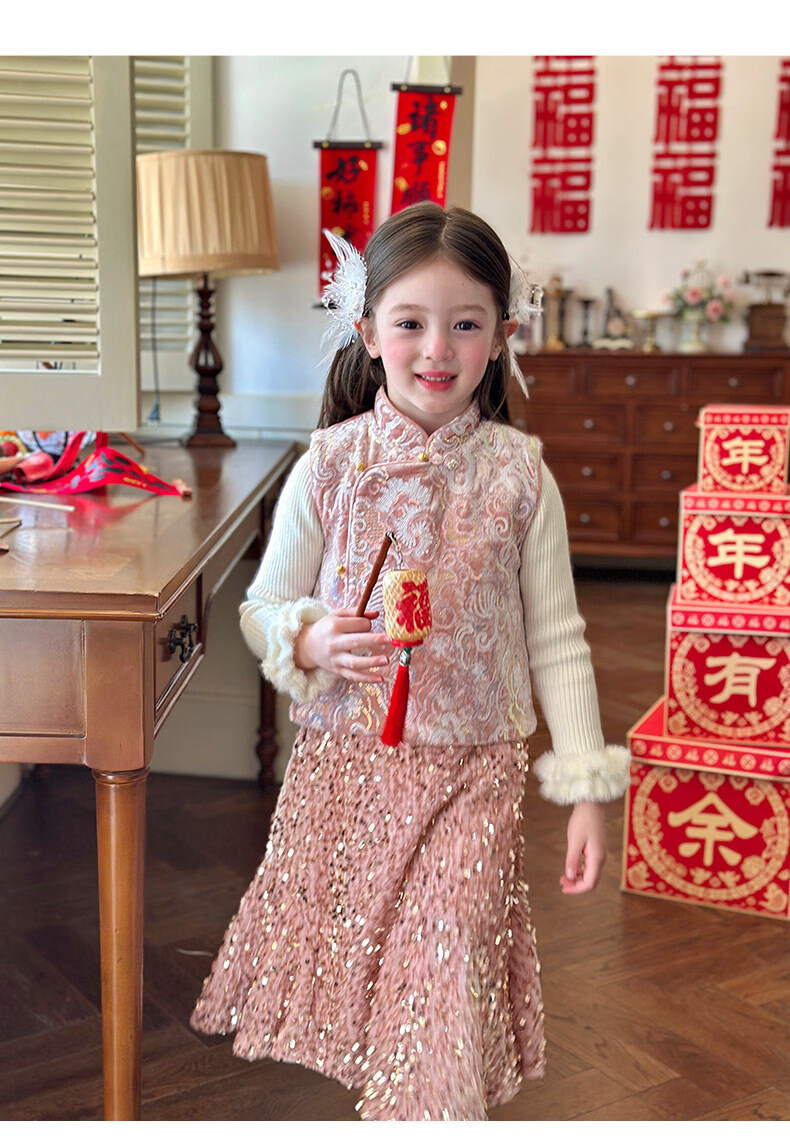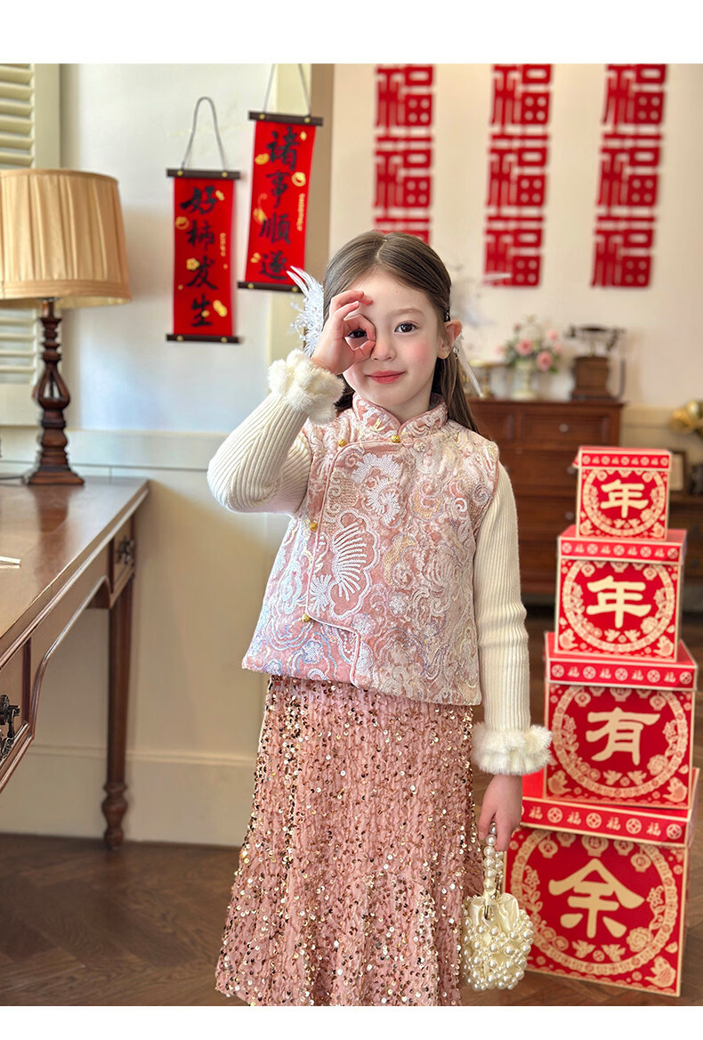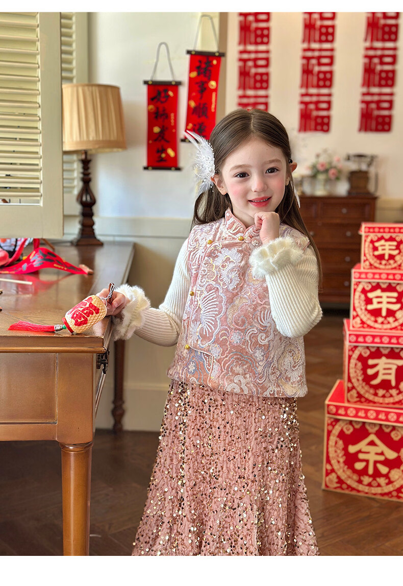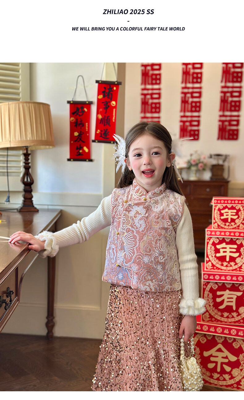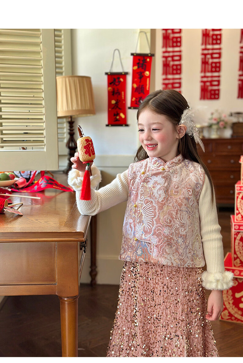 栀了成长记童装女童新年夹棉唐装马甲2025冬季新中式亮片刺绣上衣 打底衫 100