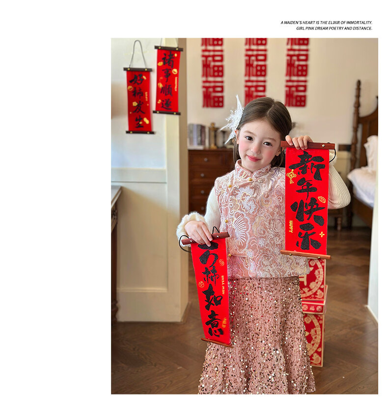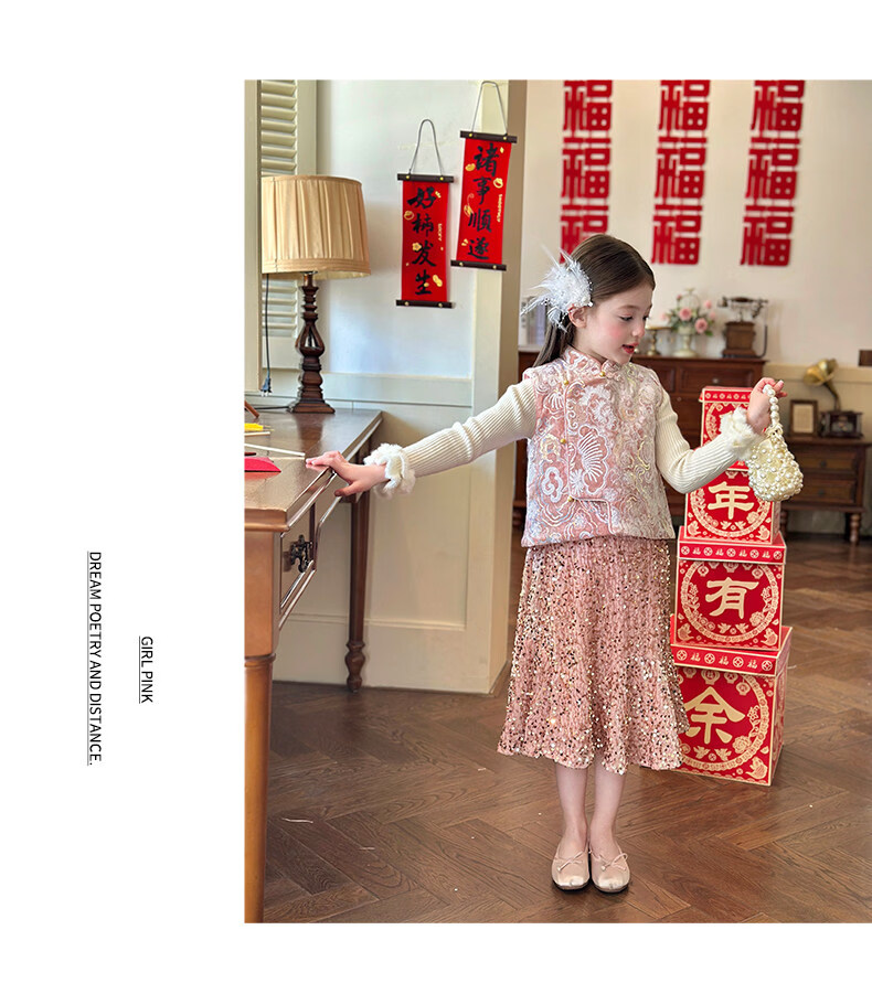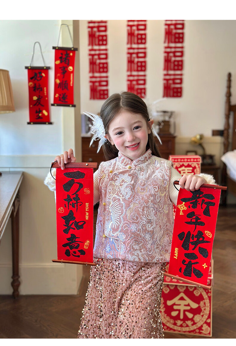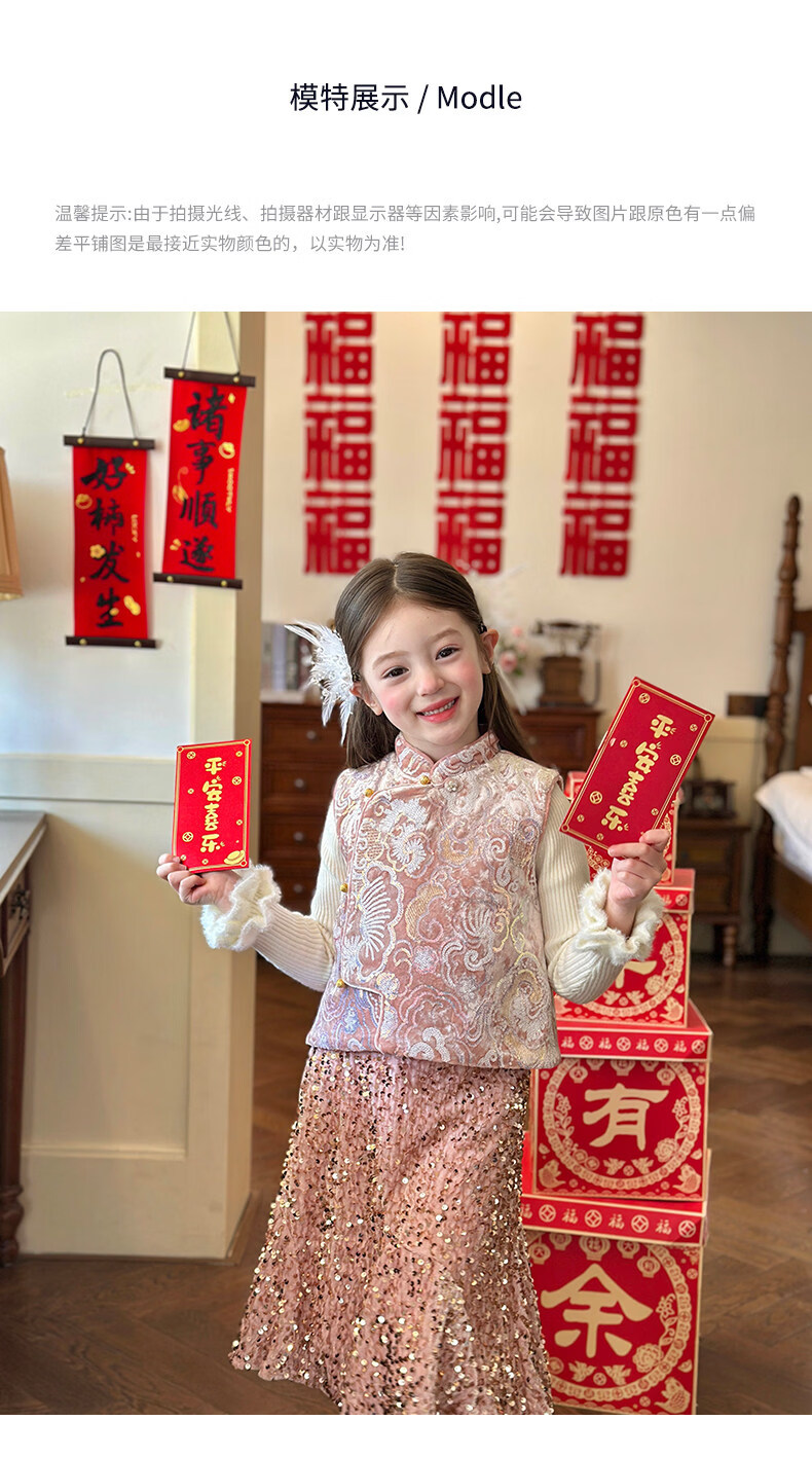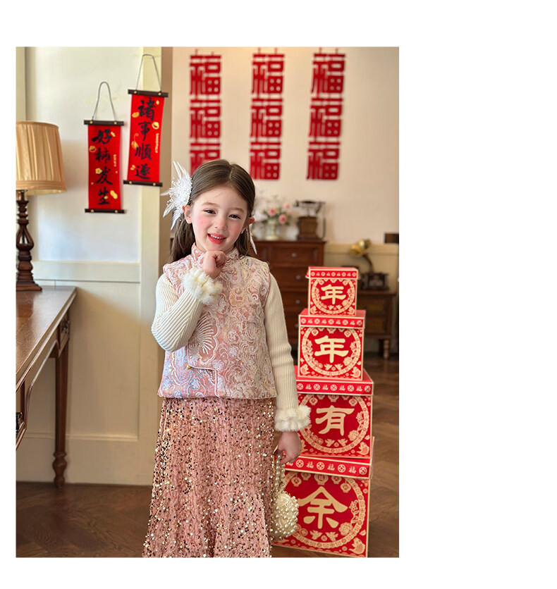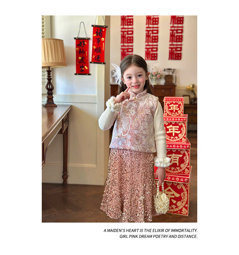 栀了成长记童装女童新年夹棉唐装马甲2025冬季新中式亮片刺绣上衣 打底衫 100