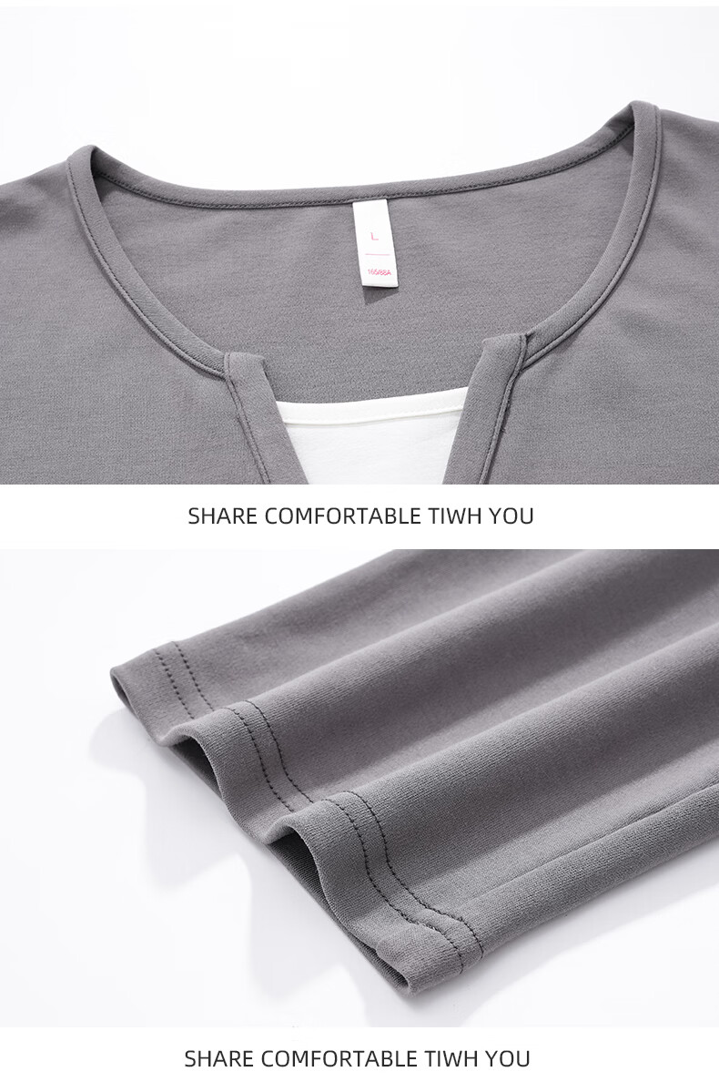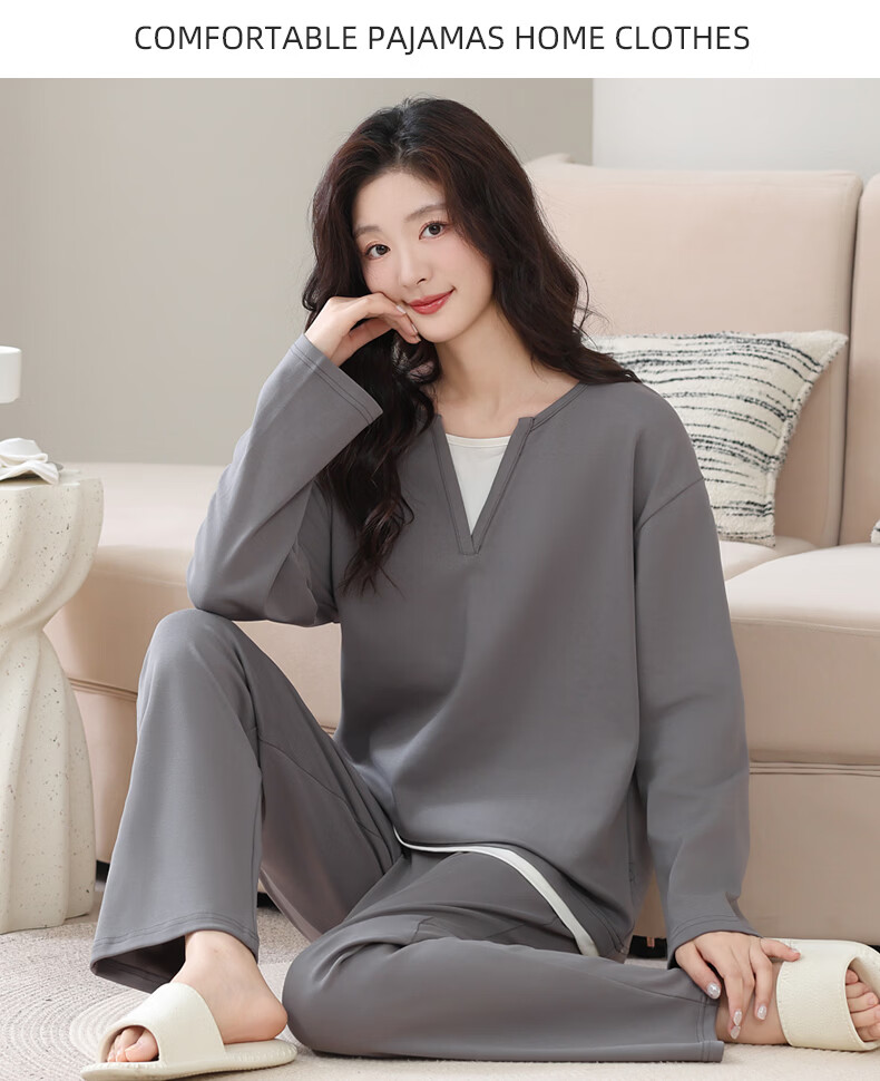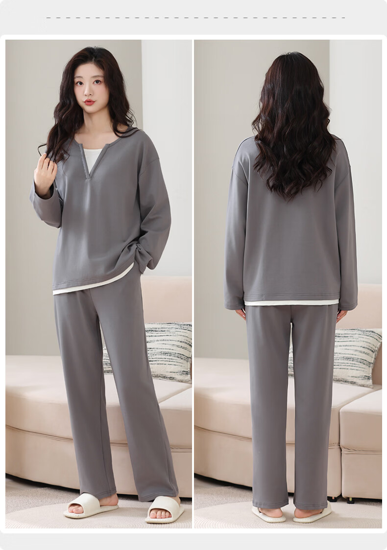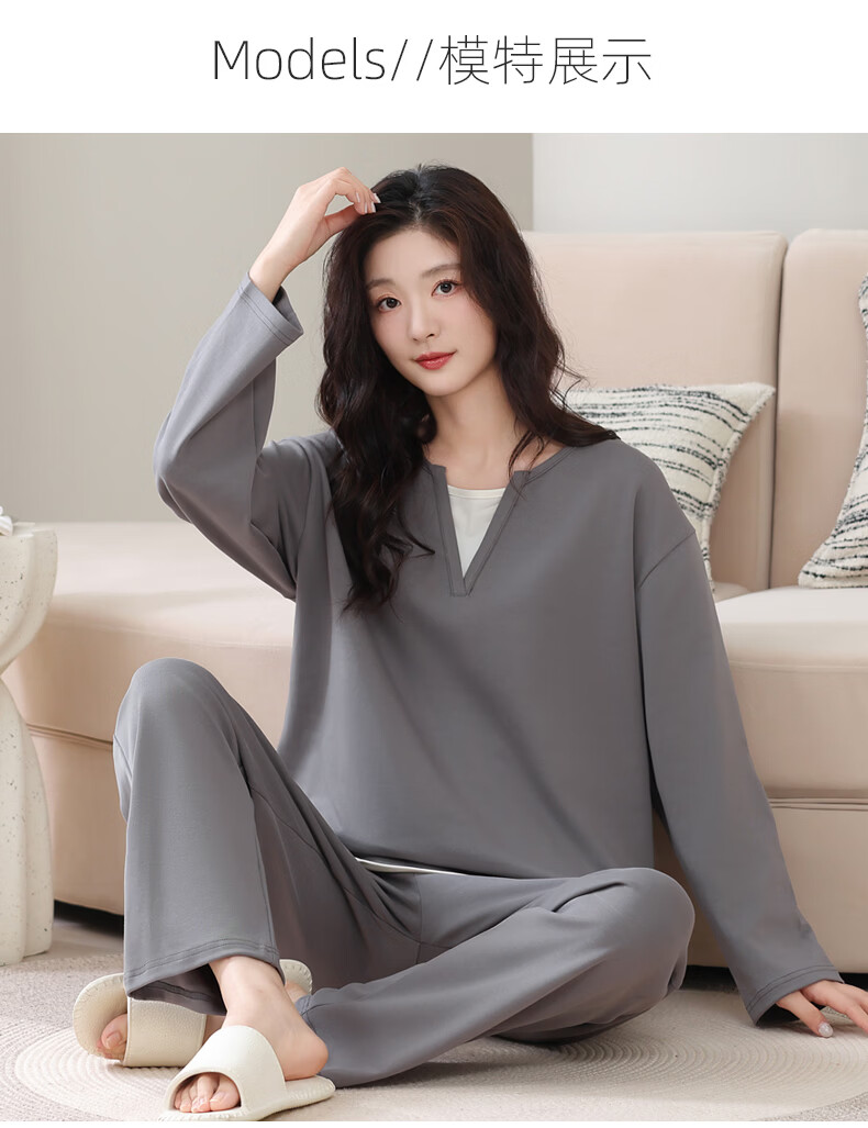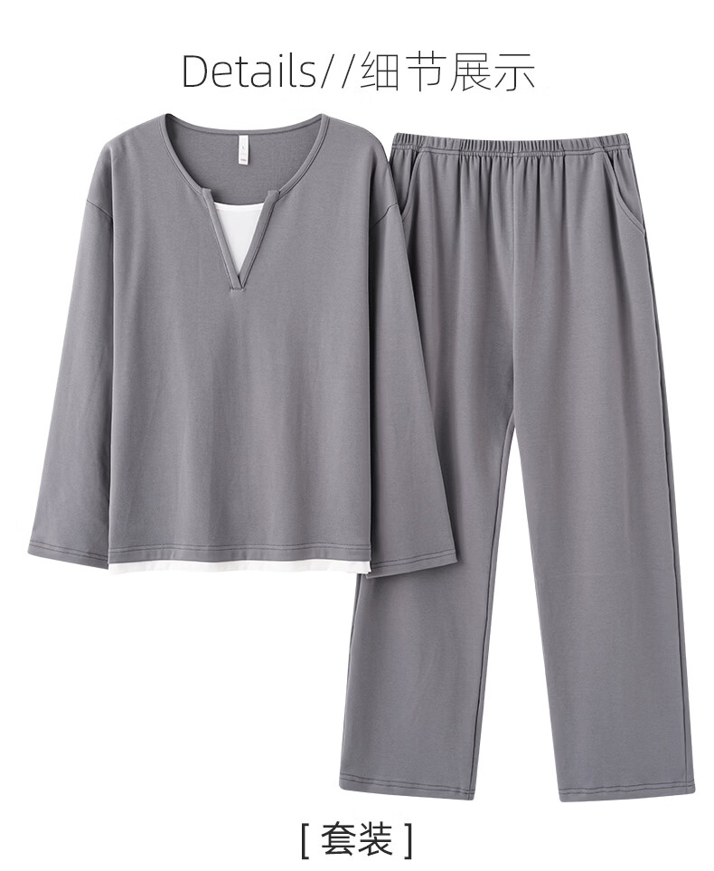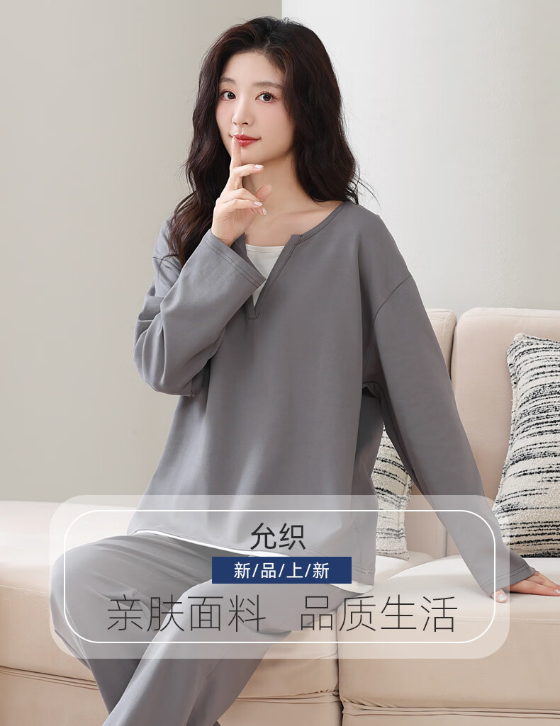 允织莱卡纯棉女士睡衣女秋季2026年新款高端假两件家居服女可外穿套装 7602-烟灰 3XL (180) :建议160-180斤穿着