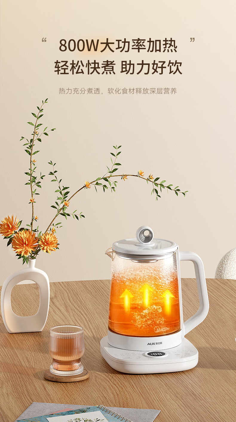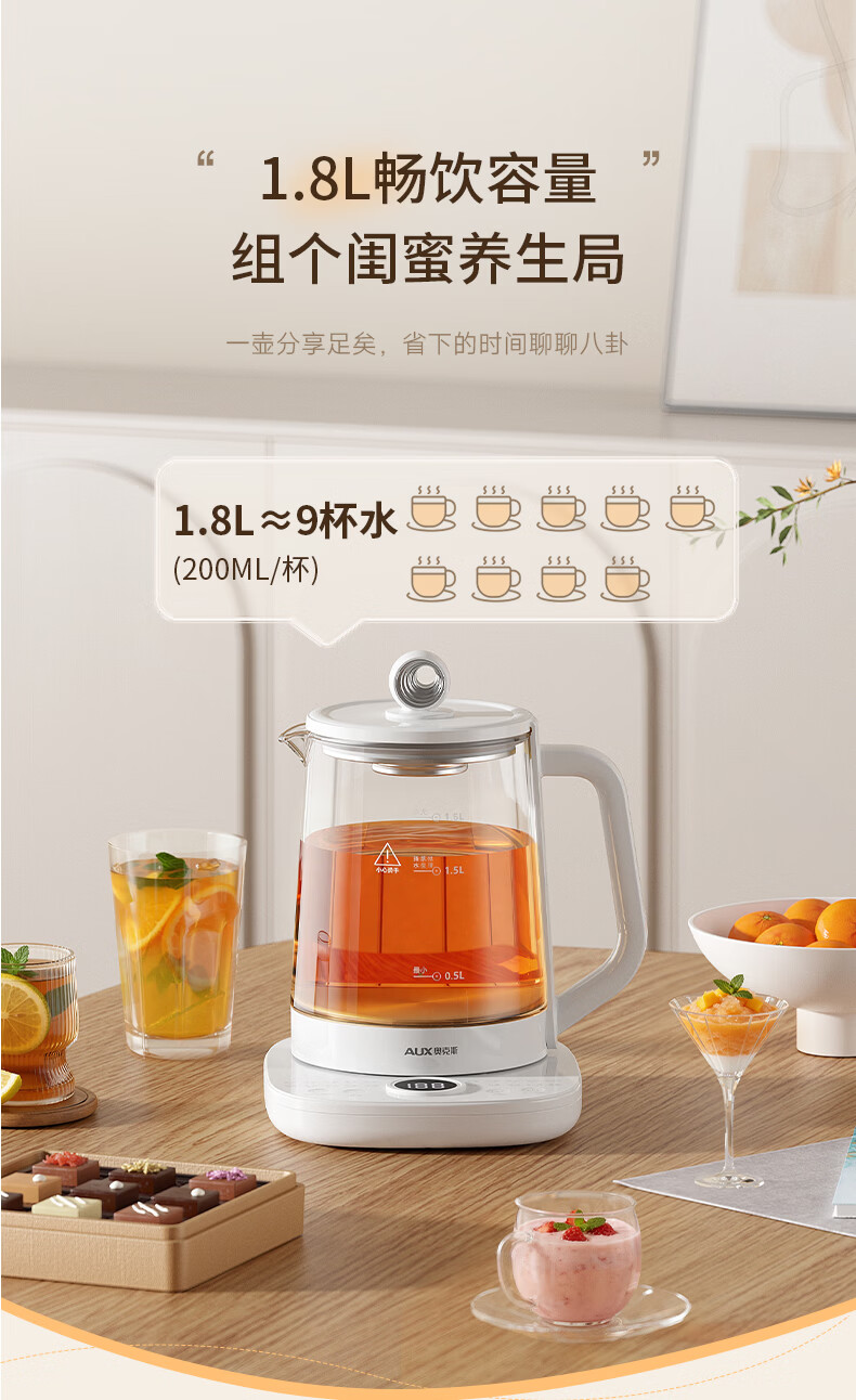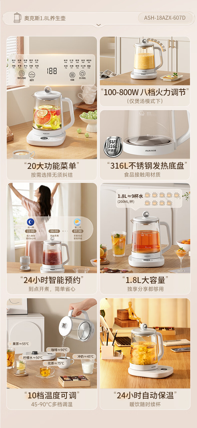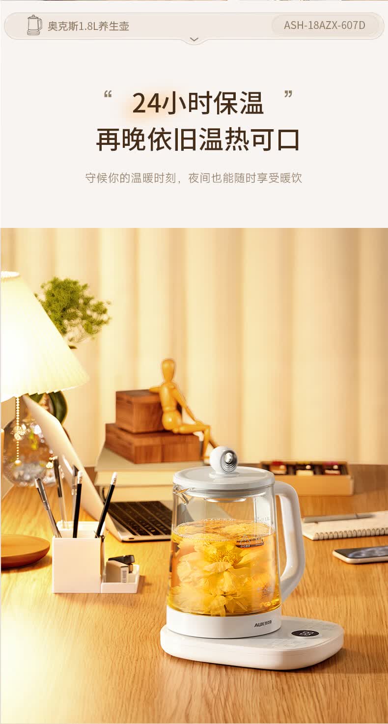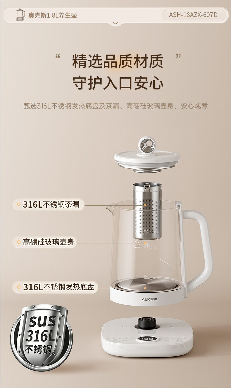 奥克斯(AUX)养生壶保温一体全自动恒温316L不锈钢烧水壶玻璃恒温壶炖煮一体多功能煮茶壶大容量办公室烧水家用 1.8L /基础款 无茶漏