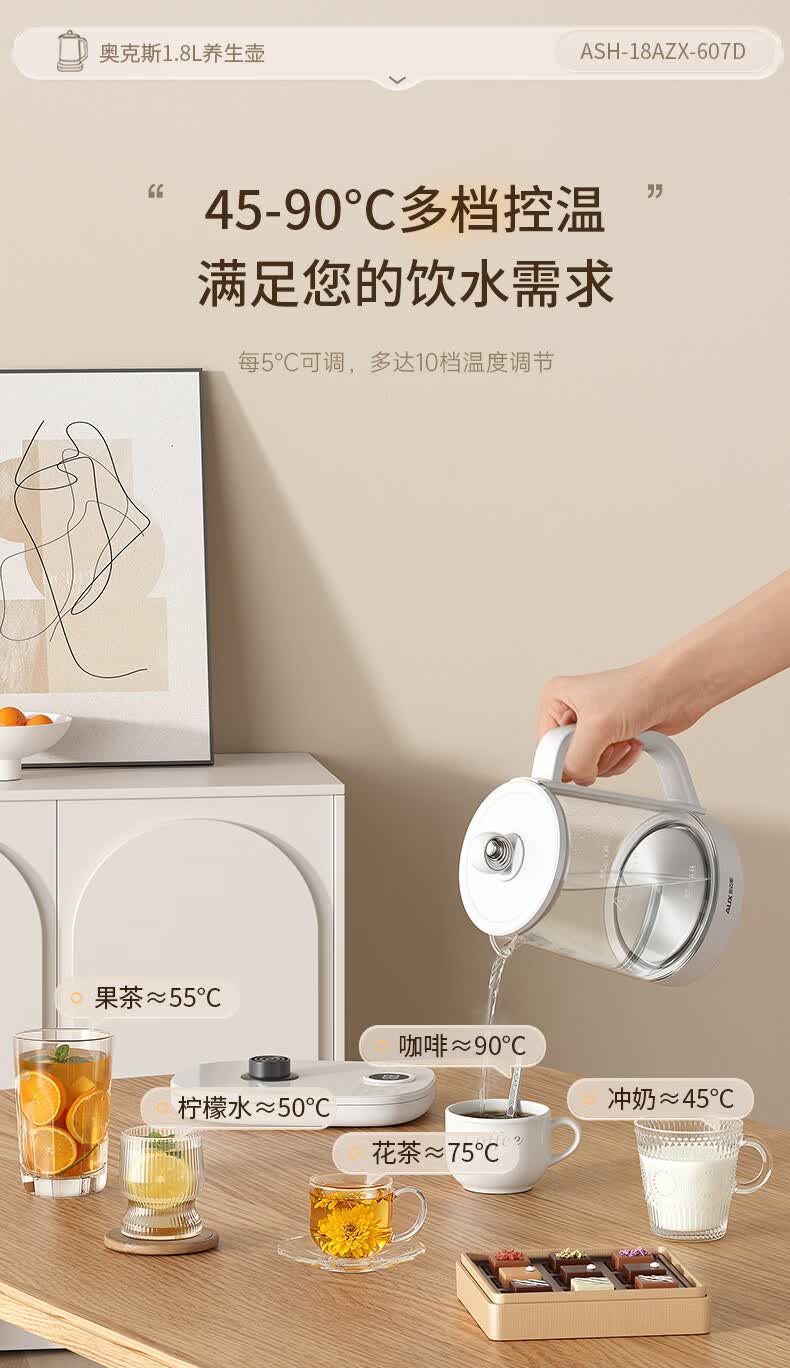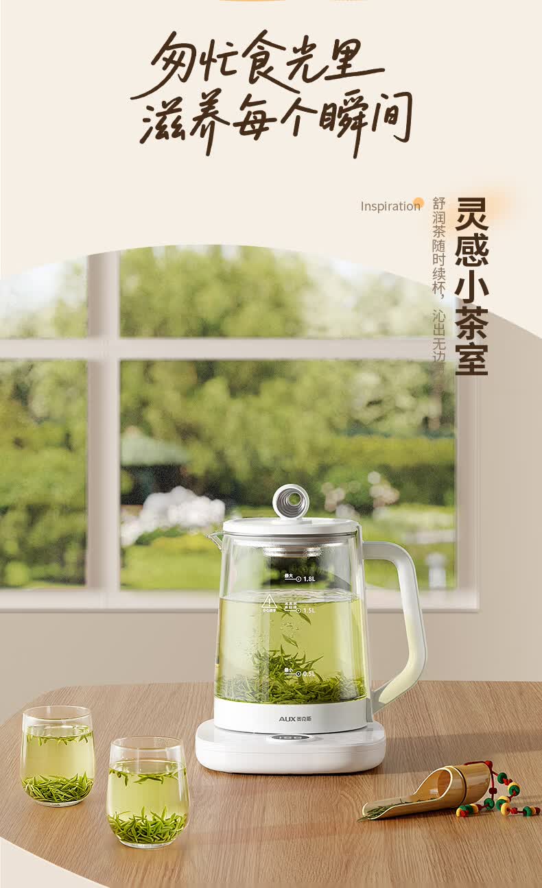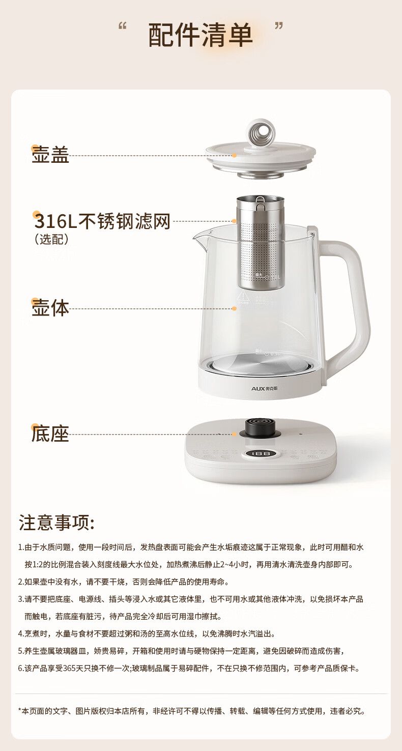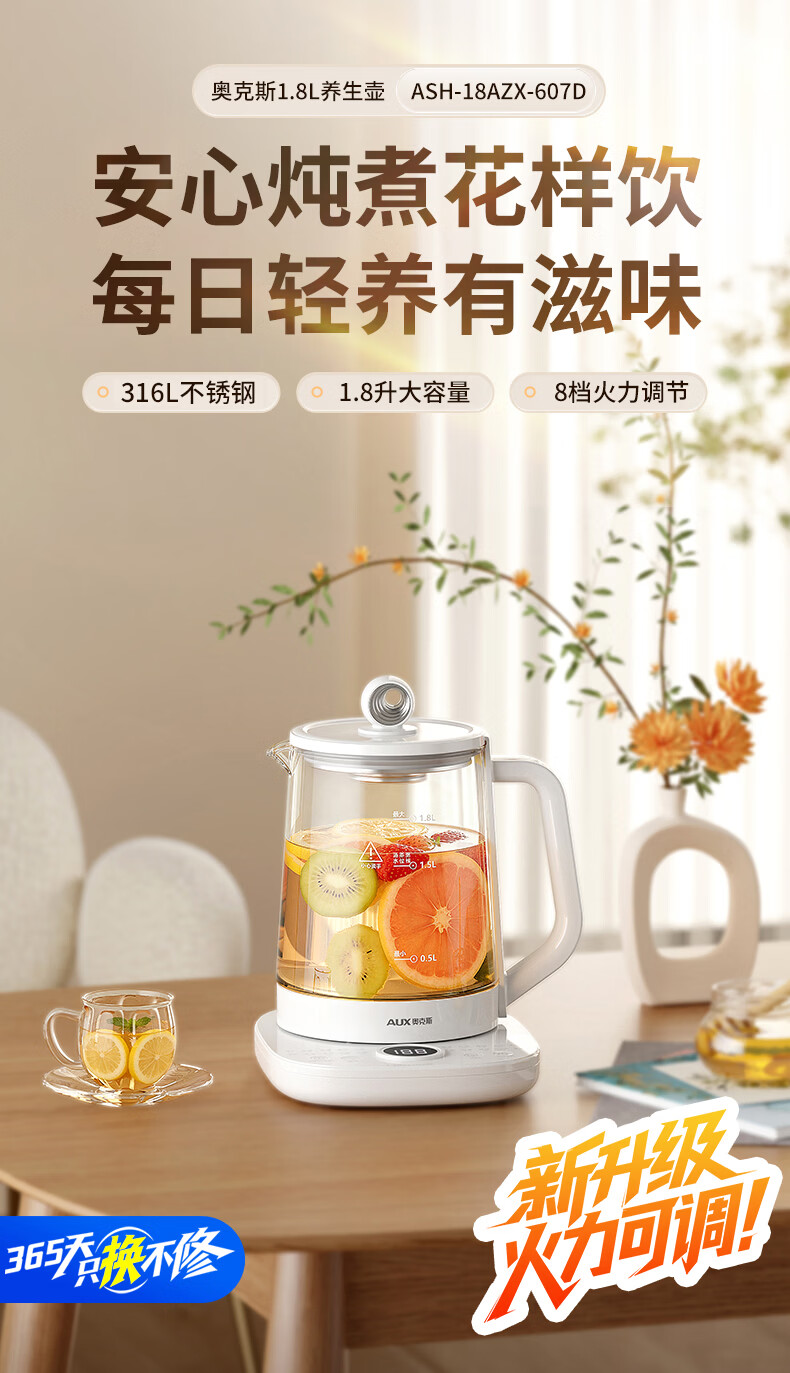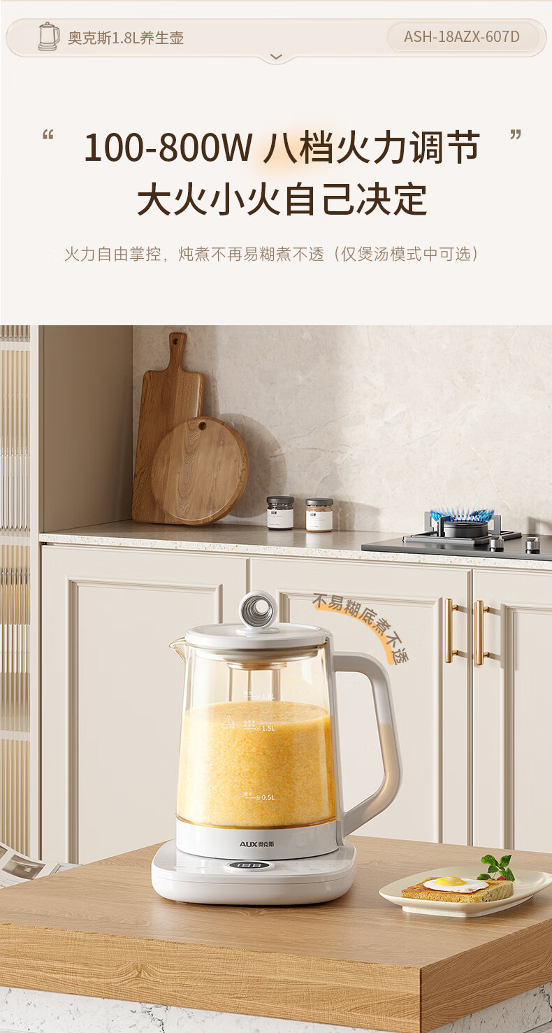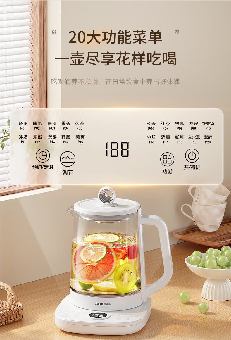 奥克斯(AUX)养生壶保温一体全自动恒温316L不锈钢烧水壶玻璃恒温壶炖煮一体多功能煮茶壶大容量办公室烧水家用 1.8L /基础款 无茶漏